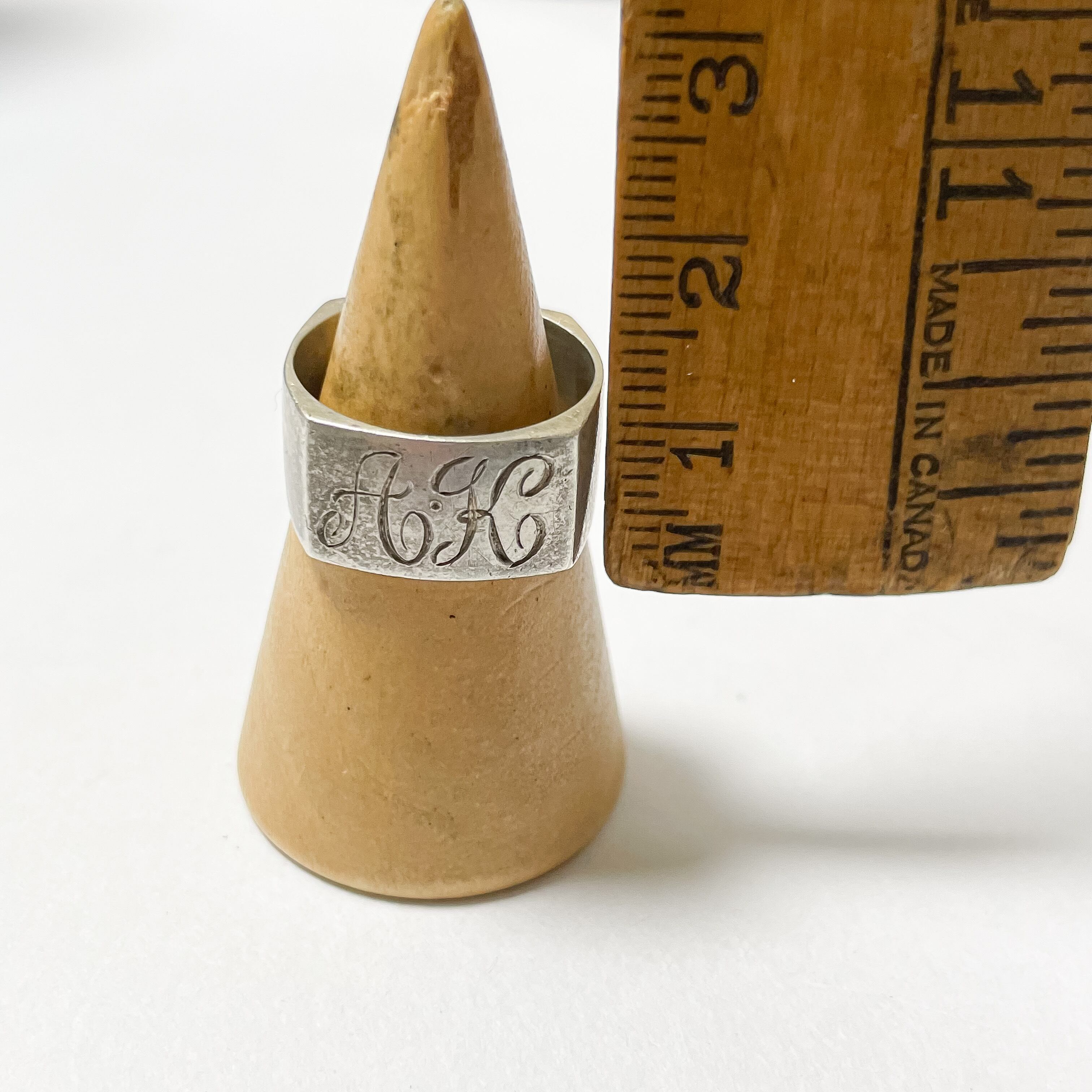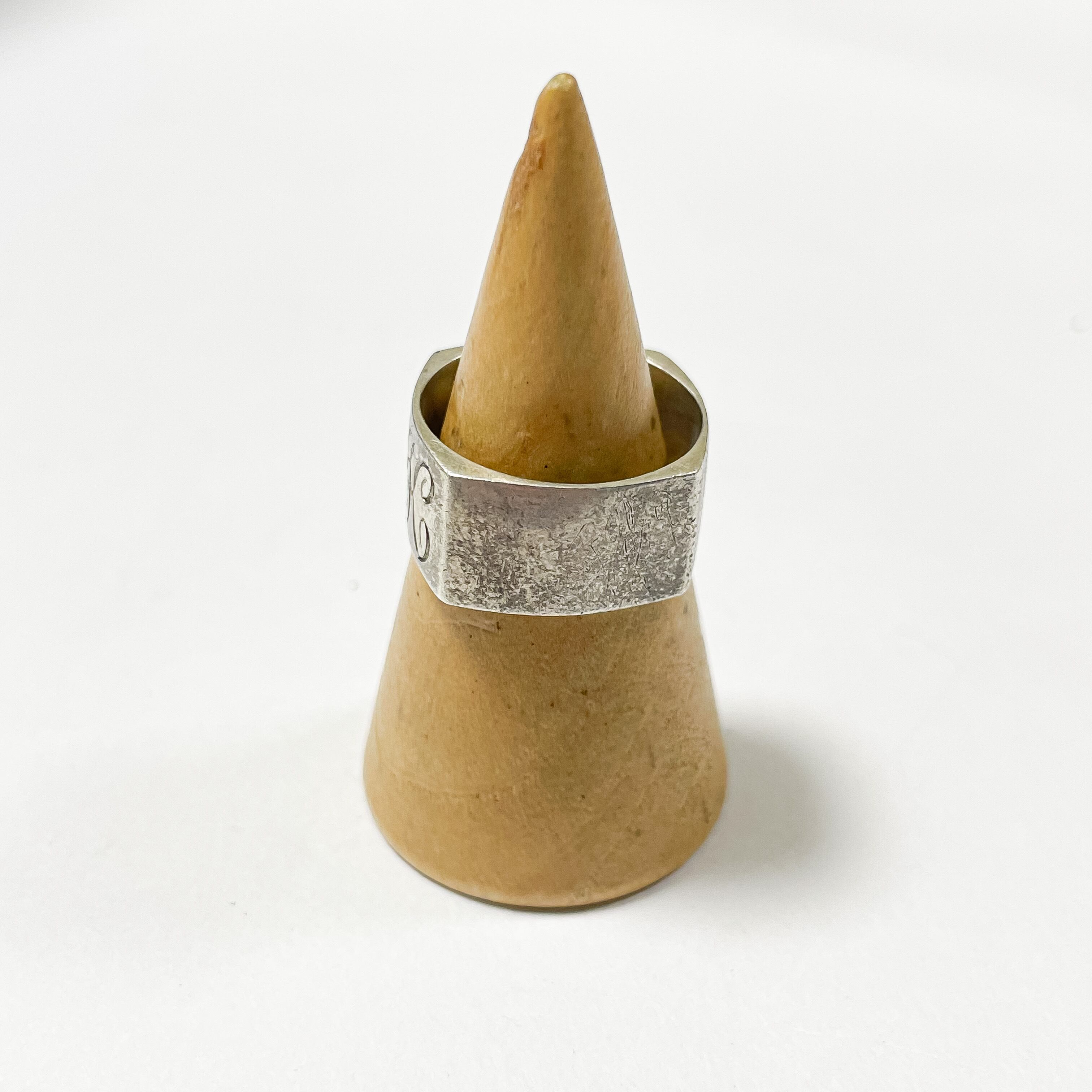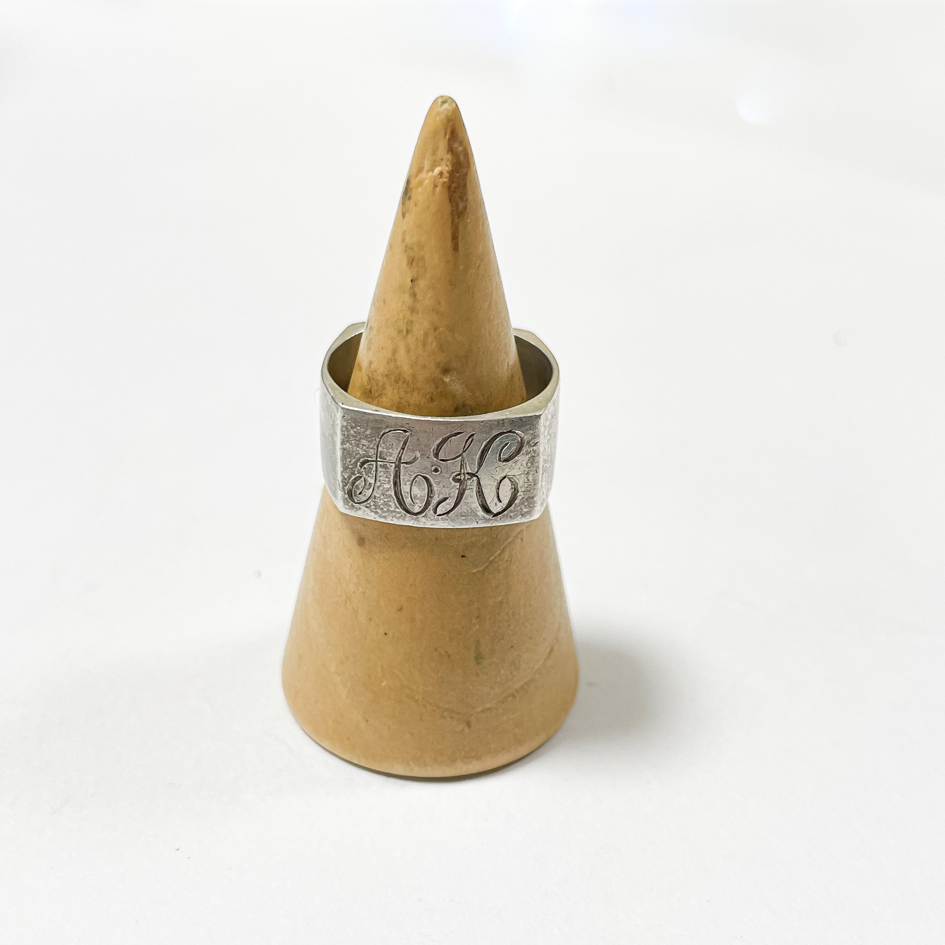 925シルバーのヴィンテージイニシャルリングです。 A.Kの筆記体の彫金が可愛いです。 ナットのような程よくボリュームのある造形も素敵です。 裏に925の刻印が確認できます。 こちらは80's〜90's頃のヴィンテージです。 Weight*約5.1g Size*約11号 Condition*特に目立つダメージや汚れはなく比較的良い状態です。 あくまで年代物ですので神経質な方や新品の様なものをお求めの方はご購入をお控え下さいませ。