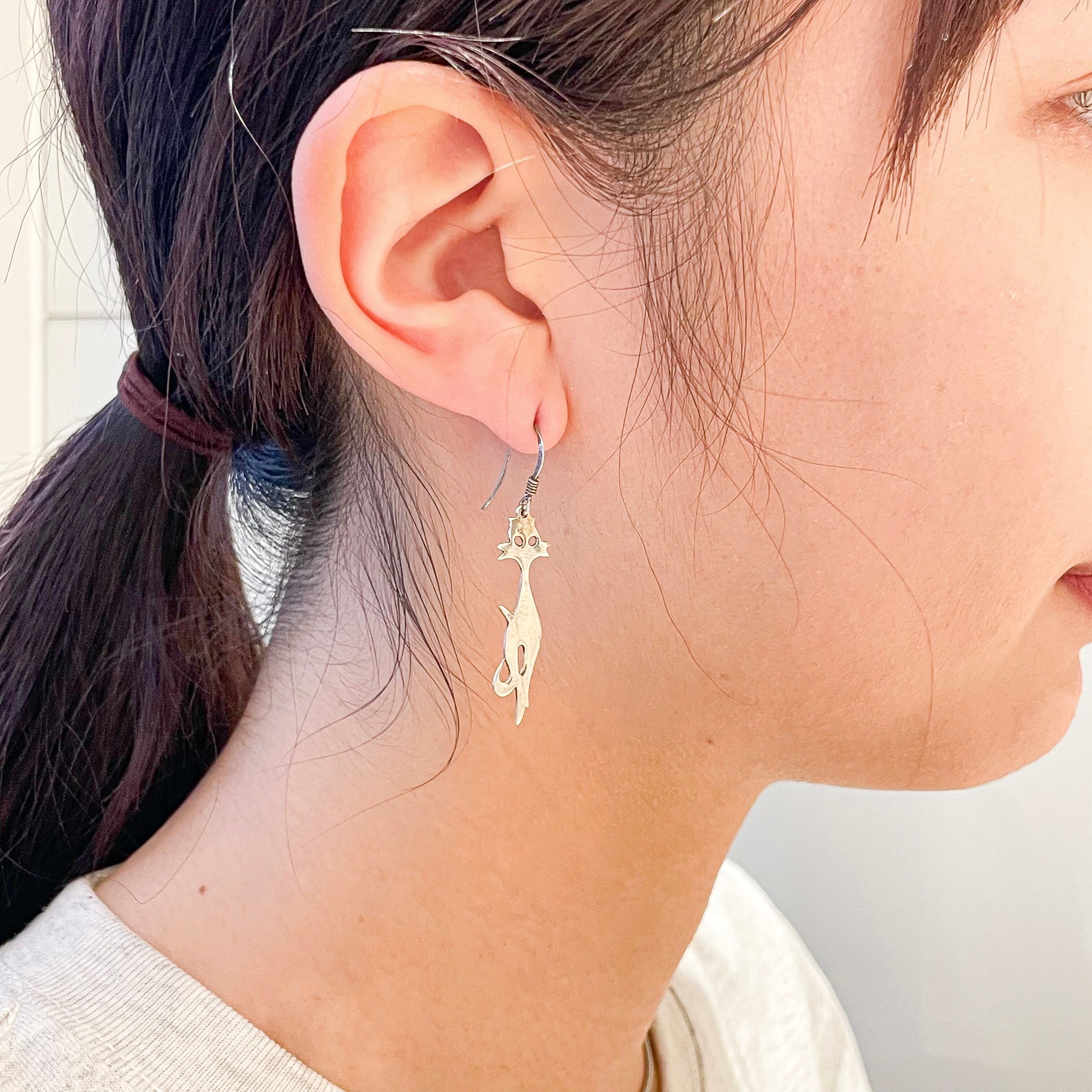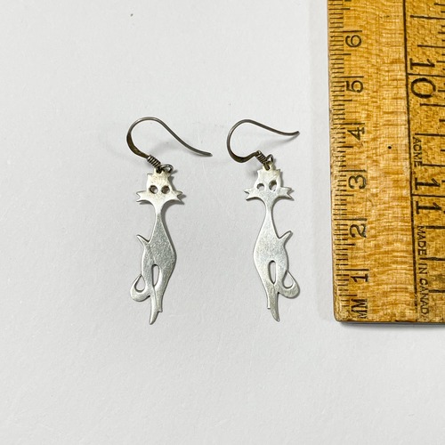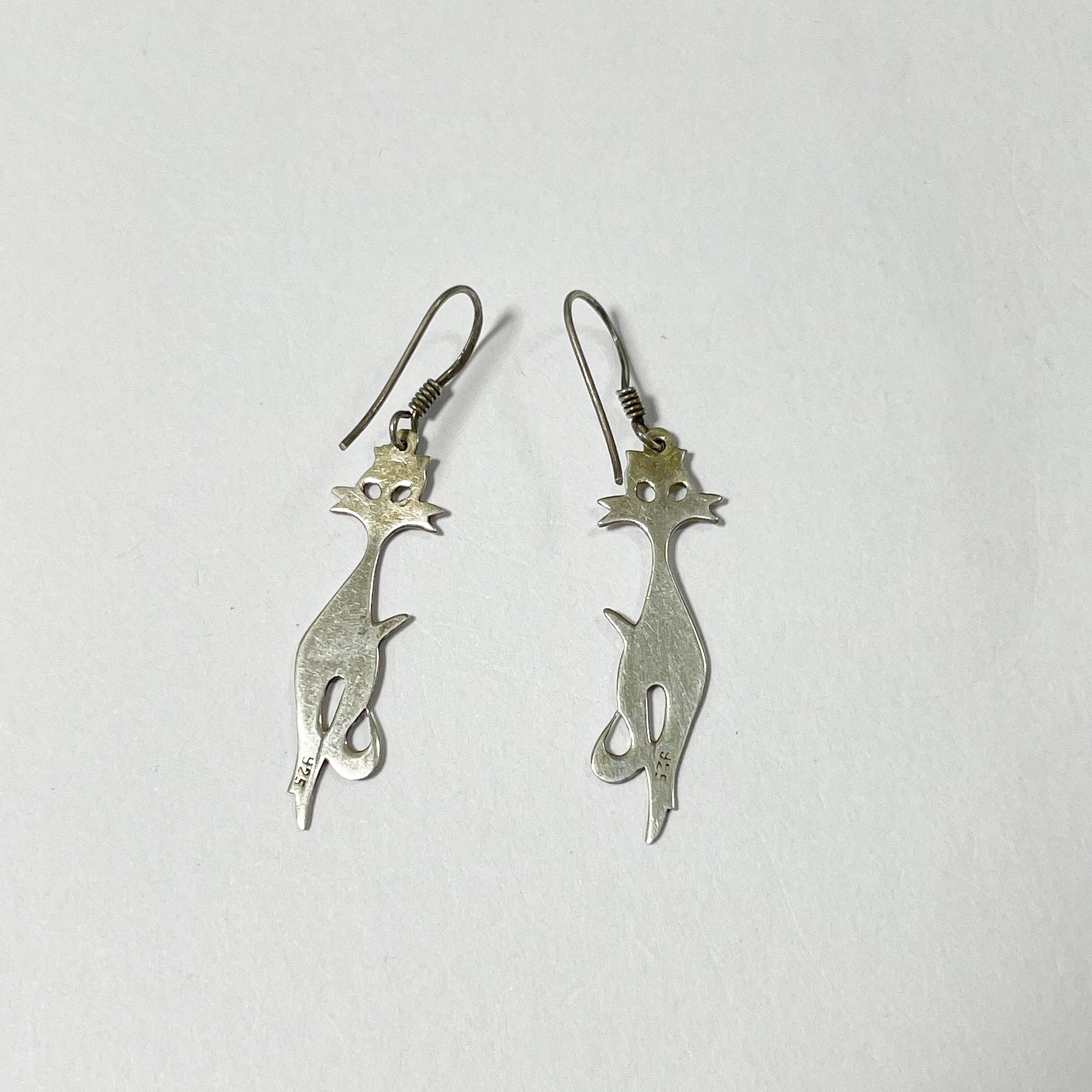 925シルバーのヴィンテージ猫ちゃんピアスです。 スマートなフォルムの猫ちゃんがとっても可愛いです。 揺れるのでお顔周りのアクセントにもなります。 裏とフックに925の刻印が確認できます。 こちらは80's〜90's頃のヴィンテージです。 Weight*約1.8g Size*画像にてご確認くださいませ。 Condition*特に目立つダメージや汚れはなく良い状態です。 あくまで年代物ですので神経質な方や新品の様なものをお求めの方はご購入をお控え下さいませ。