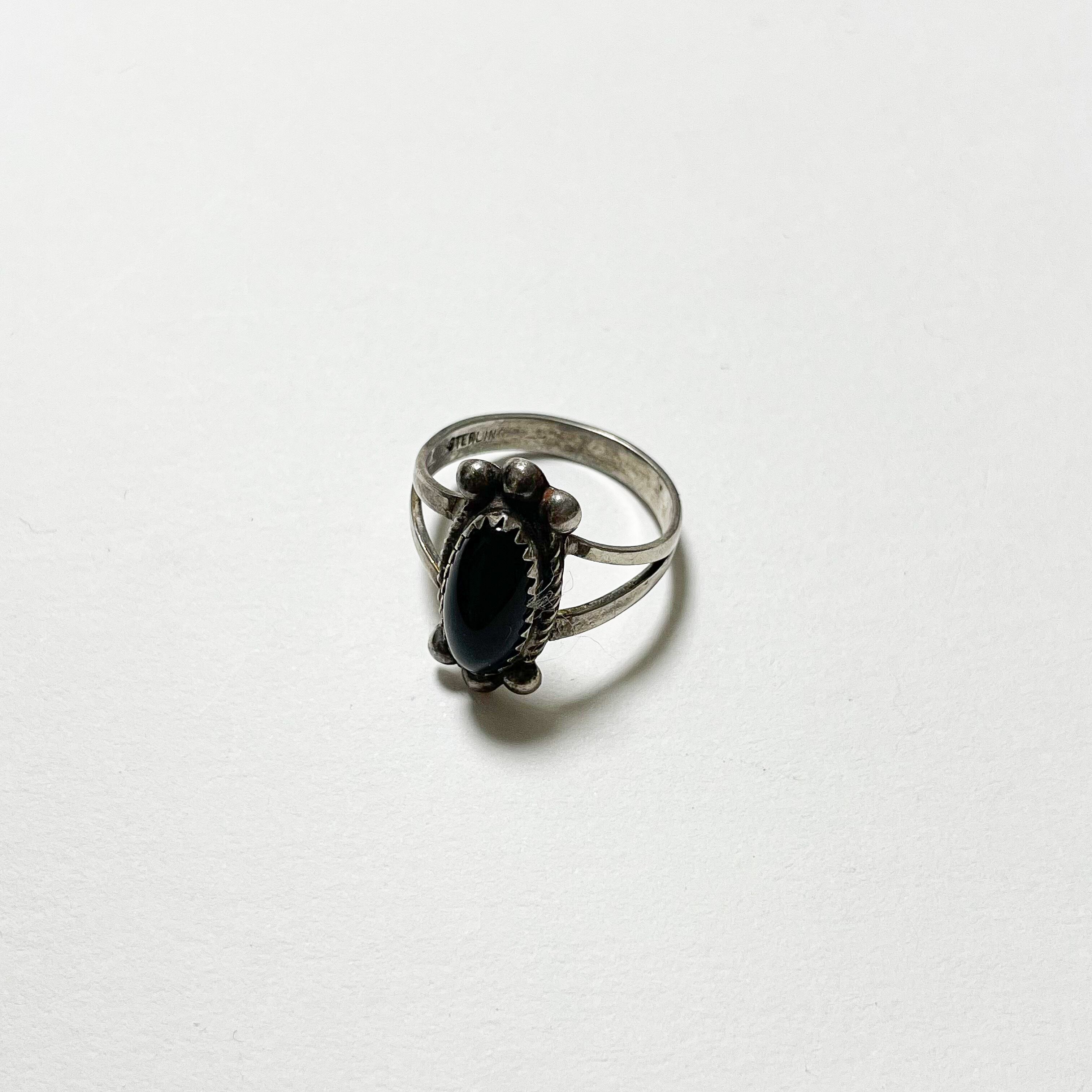 オーバル型オニキスの周りにツイステッドワイヤーと半球状パールがあしらわれ、シャンクも二つに別れたスプリットシャンクと、トラディショナルで直球なデザインです。
