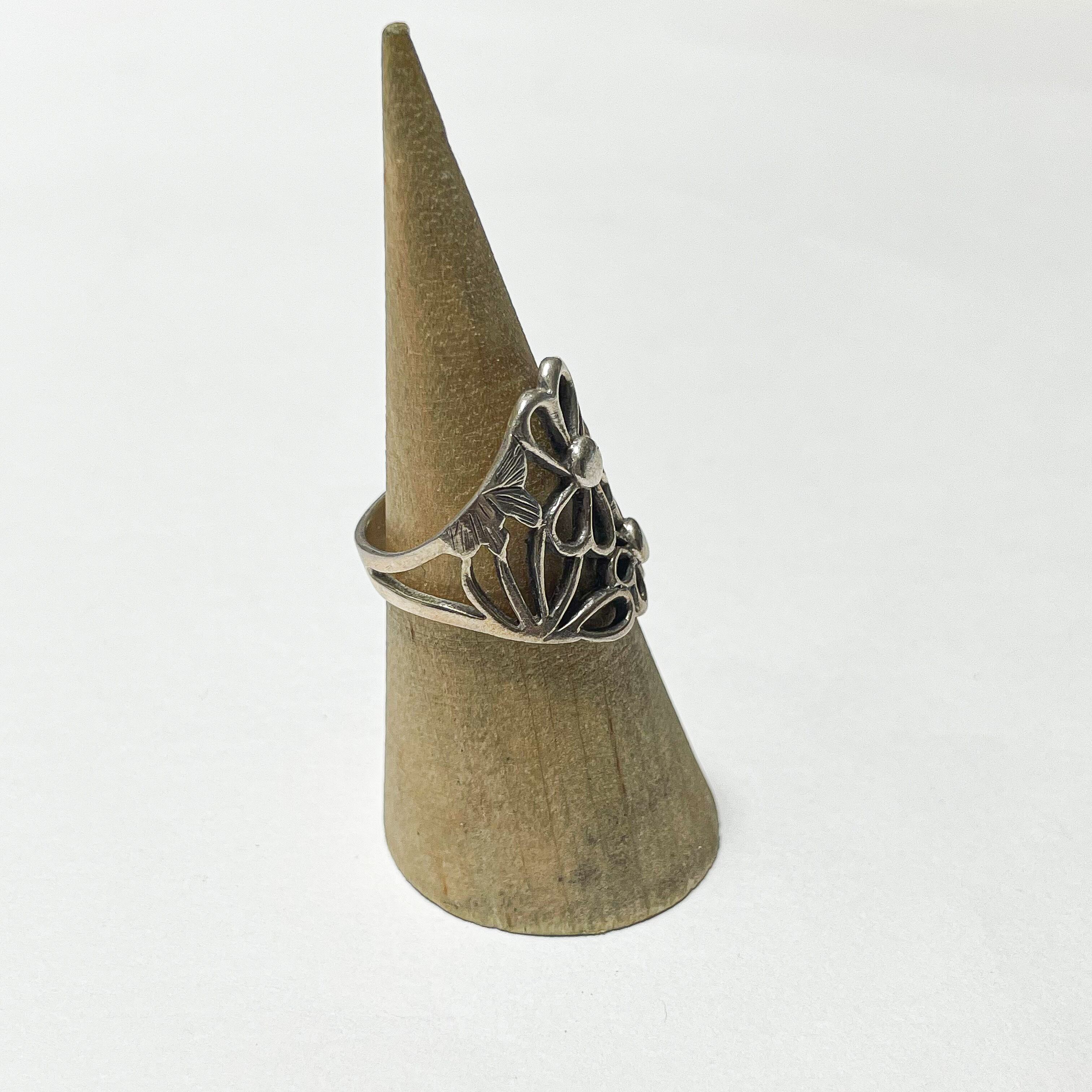 925シルバーの透かしフラワーリングです。 ヒッピー臭のする透かしのお花デザインがとっても可愛いです。 大振りで存在感があるので、主役として人差し指や親指に着用するのがオススメです。 裏に925の刻印が確認できます。 こちらは80's〜のお品です。 Weight*約5.4g Size*約14.5号 Condition*特に目立つダメージや汚れはなく良い状態です。 あくまで年代物ですので神経質な方や新品の様なものをお求めの方はご購入をお控え下さいませ。