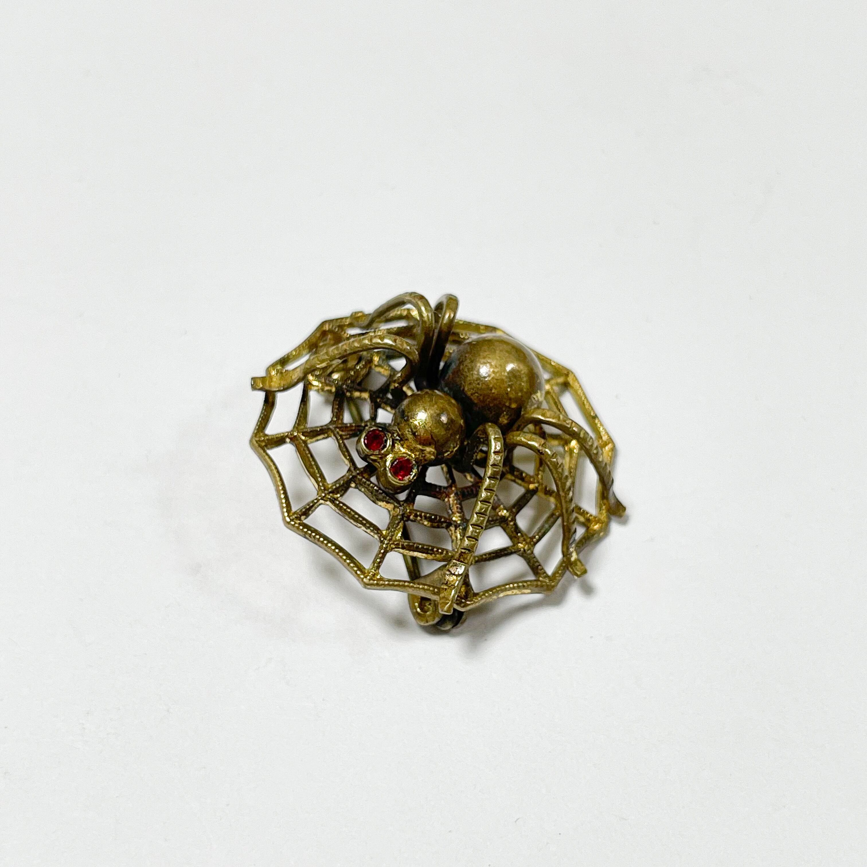 ヴィンテージスパイダーブローチです。 デザイン最高です。 目には赤いビジューがセットされてアクセントになっています。 材質は真鍮ですが、もしかしたら金張りやメッキが剥がれたのかもしれません。 良い雰囲気です。 こちらは60's〜70's頃のヴィンテージです。 Size*画像にてご確認下さい。 Condition*特に目立つダメージや汚れはなく良い状態です。 あくまで年代物ですので神経質な方や新品の様なものをお求めの方はご購入をお控え下さいませ。