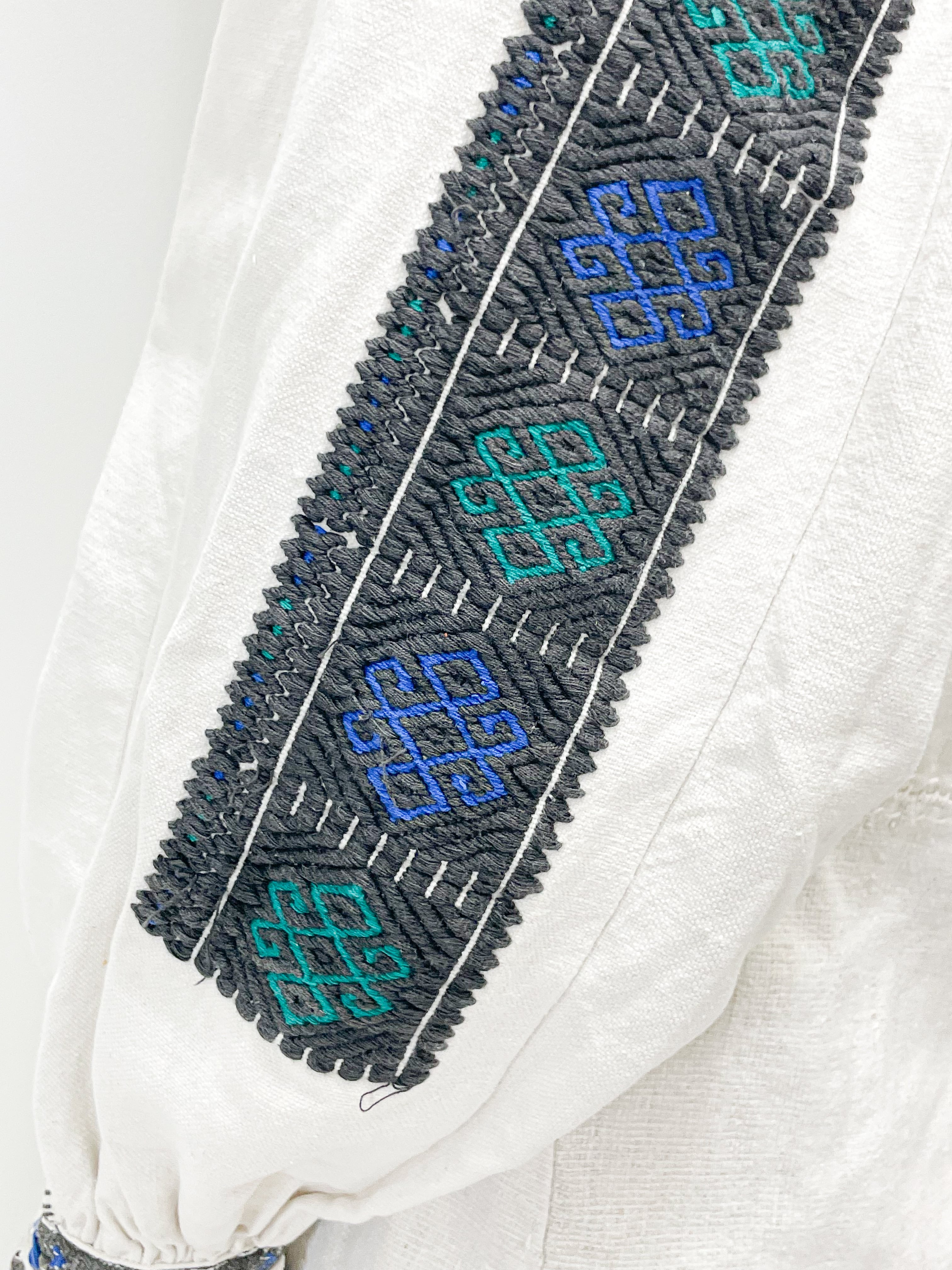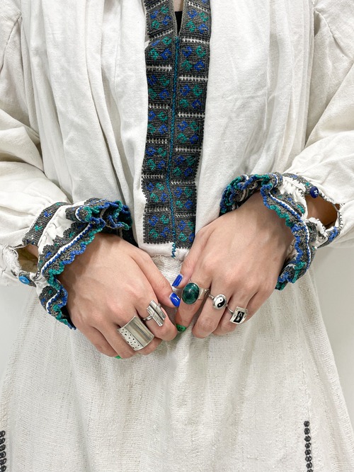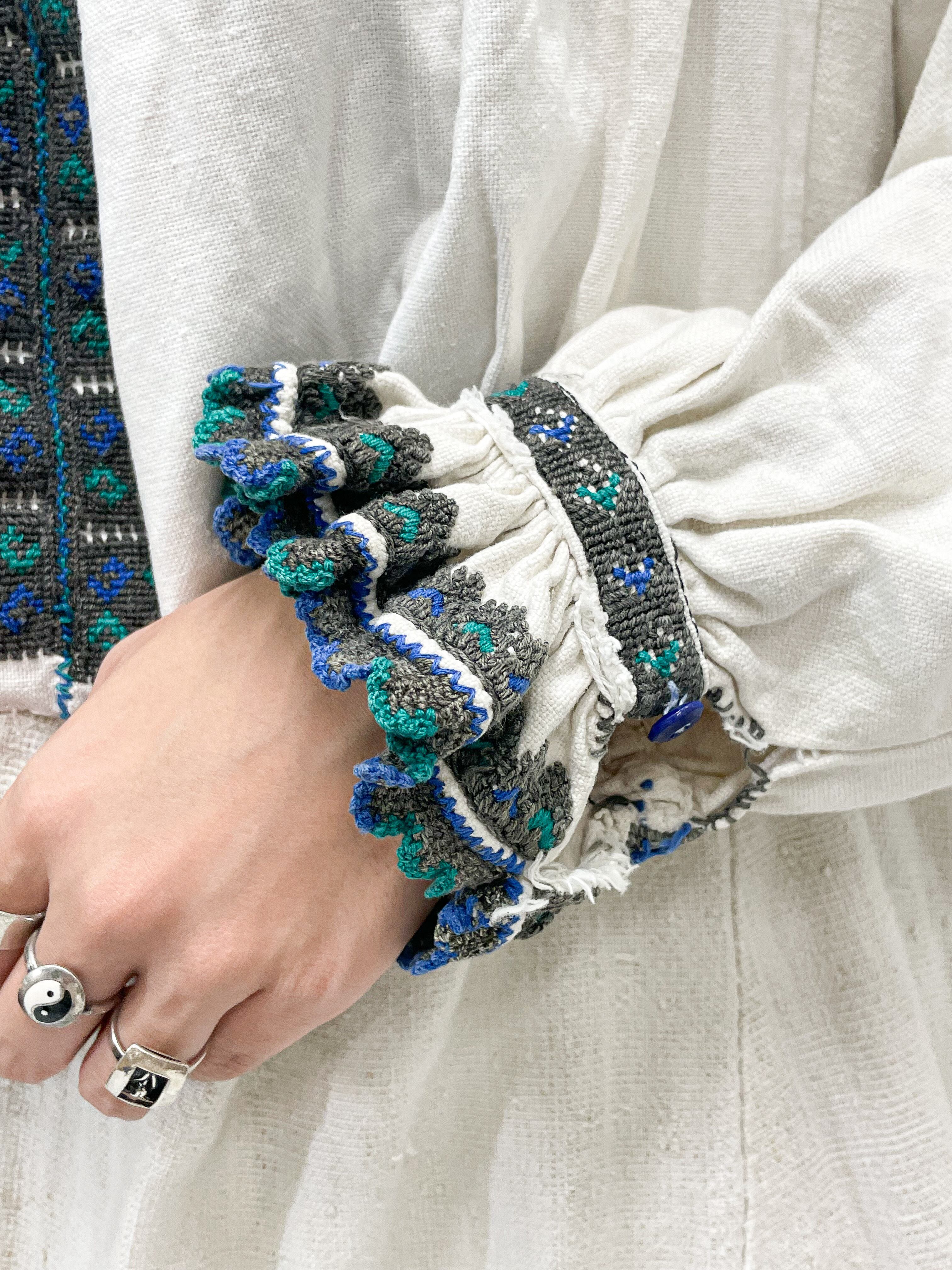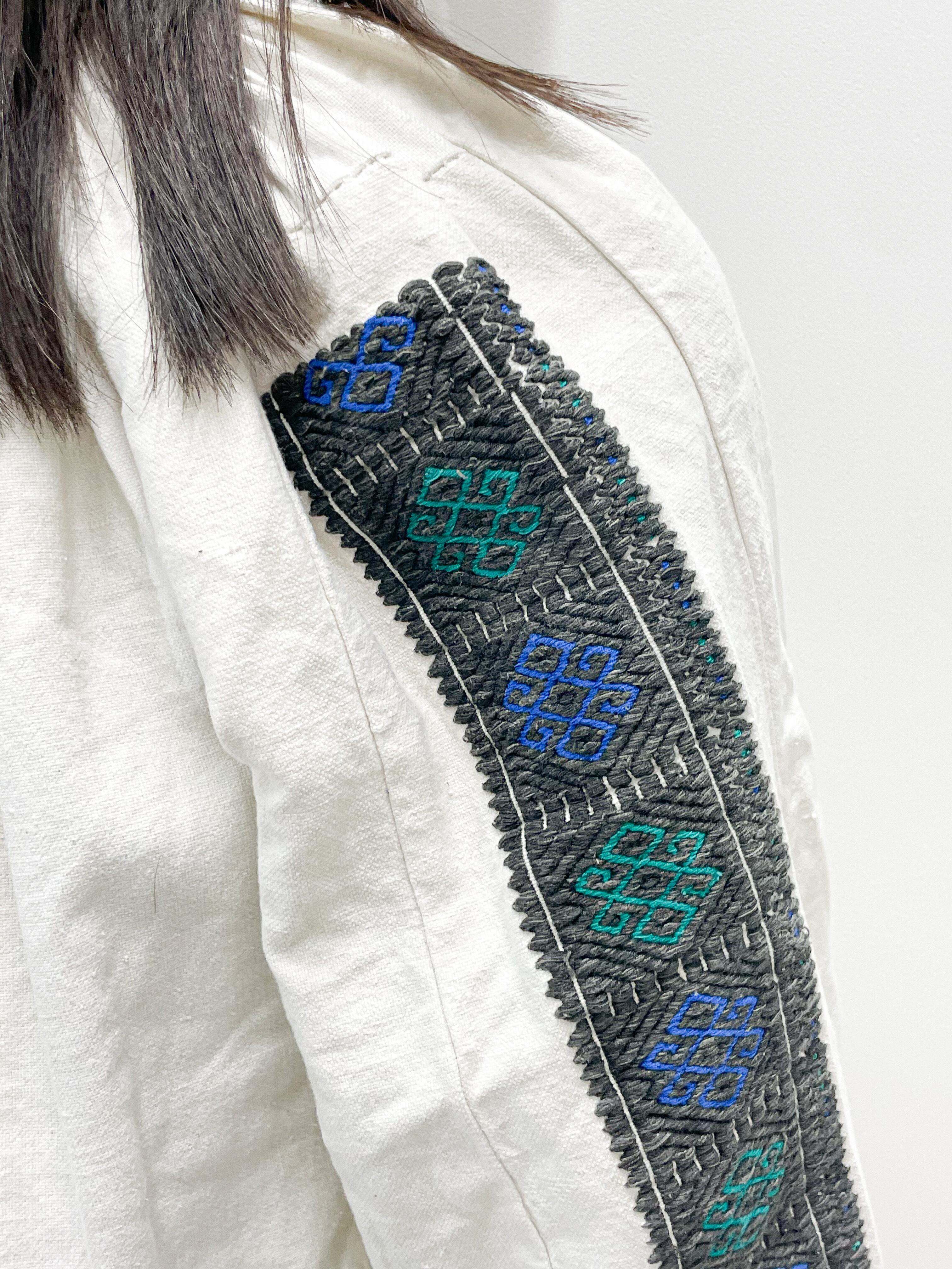 キャンバス地のようなしっかりした生地に首周り、袖先、袖裏、そして裾付近にこれでもかというほど刺された手刺繍は圧倒的な存在感を放ち、芸術的な美しさです。