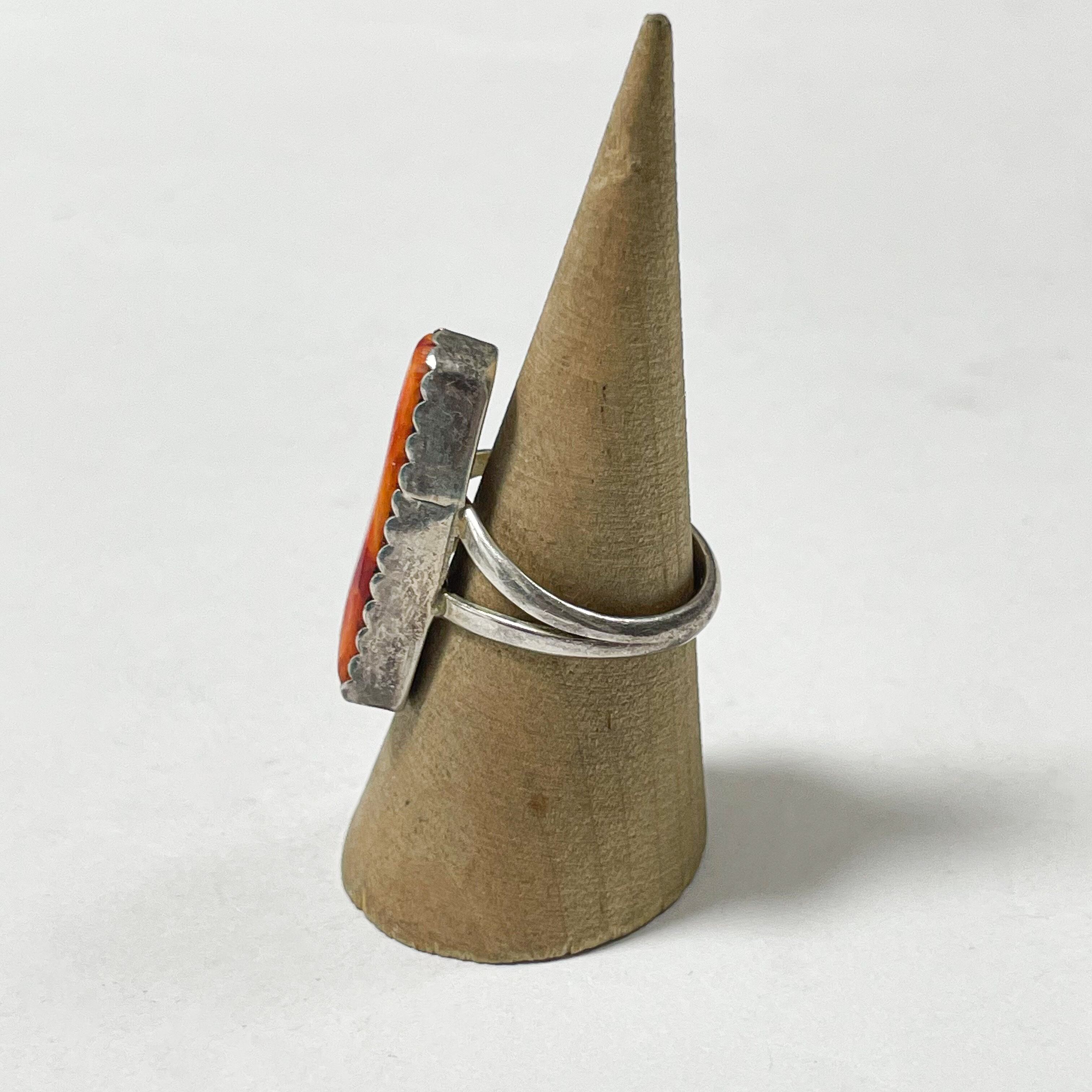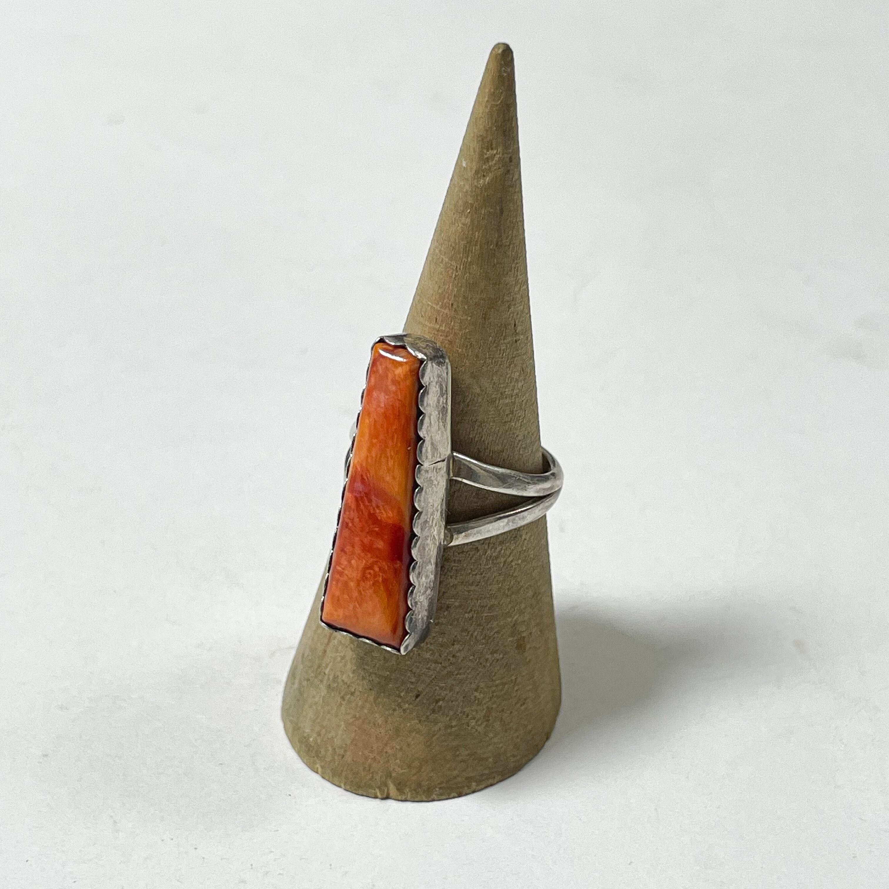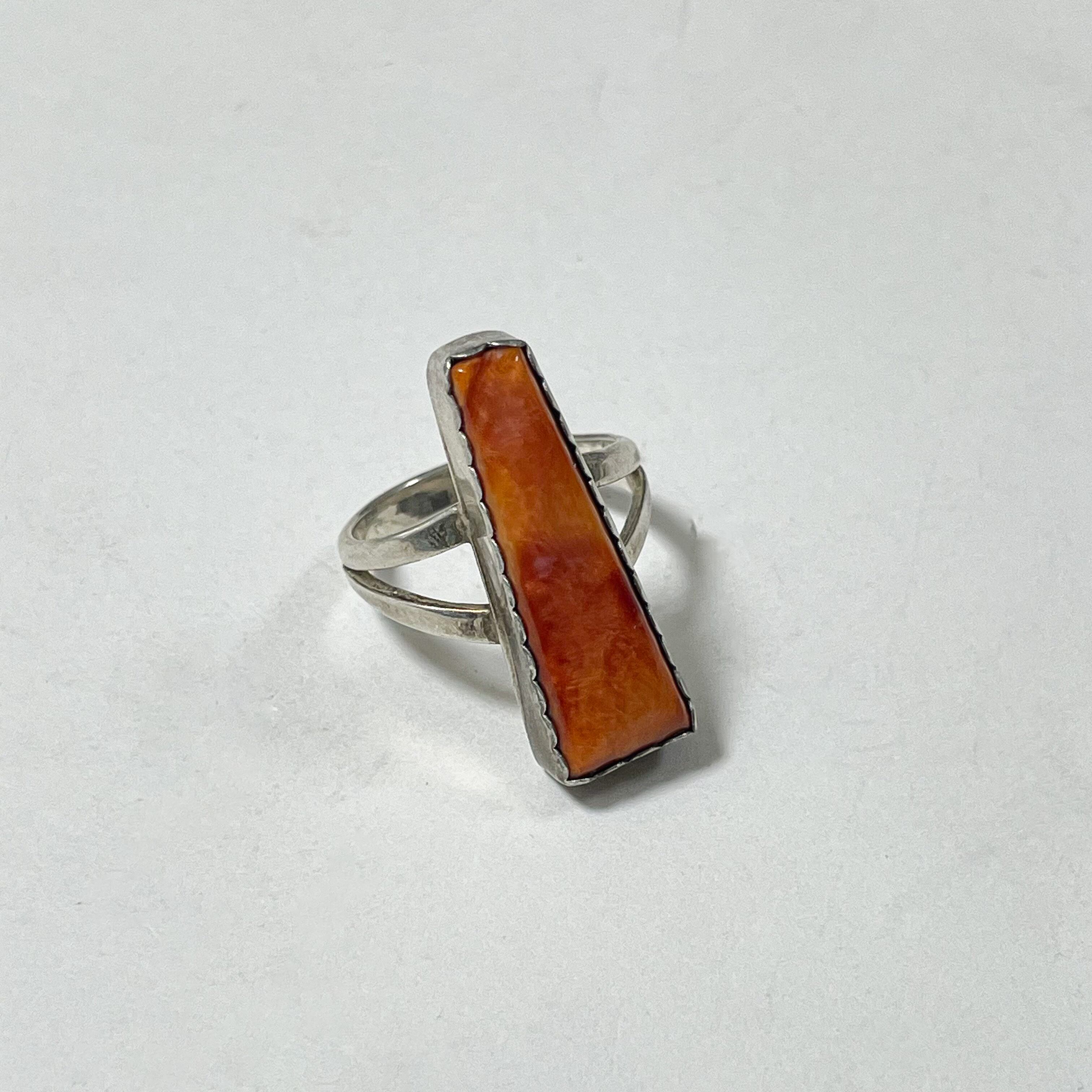 鮮やかなオレンジカラーが美しいスパイニーオイスターシェルがベゼルセットされたインディアンジュエリーのヴィンテージリングです。