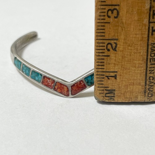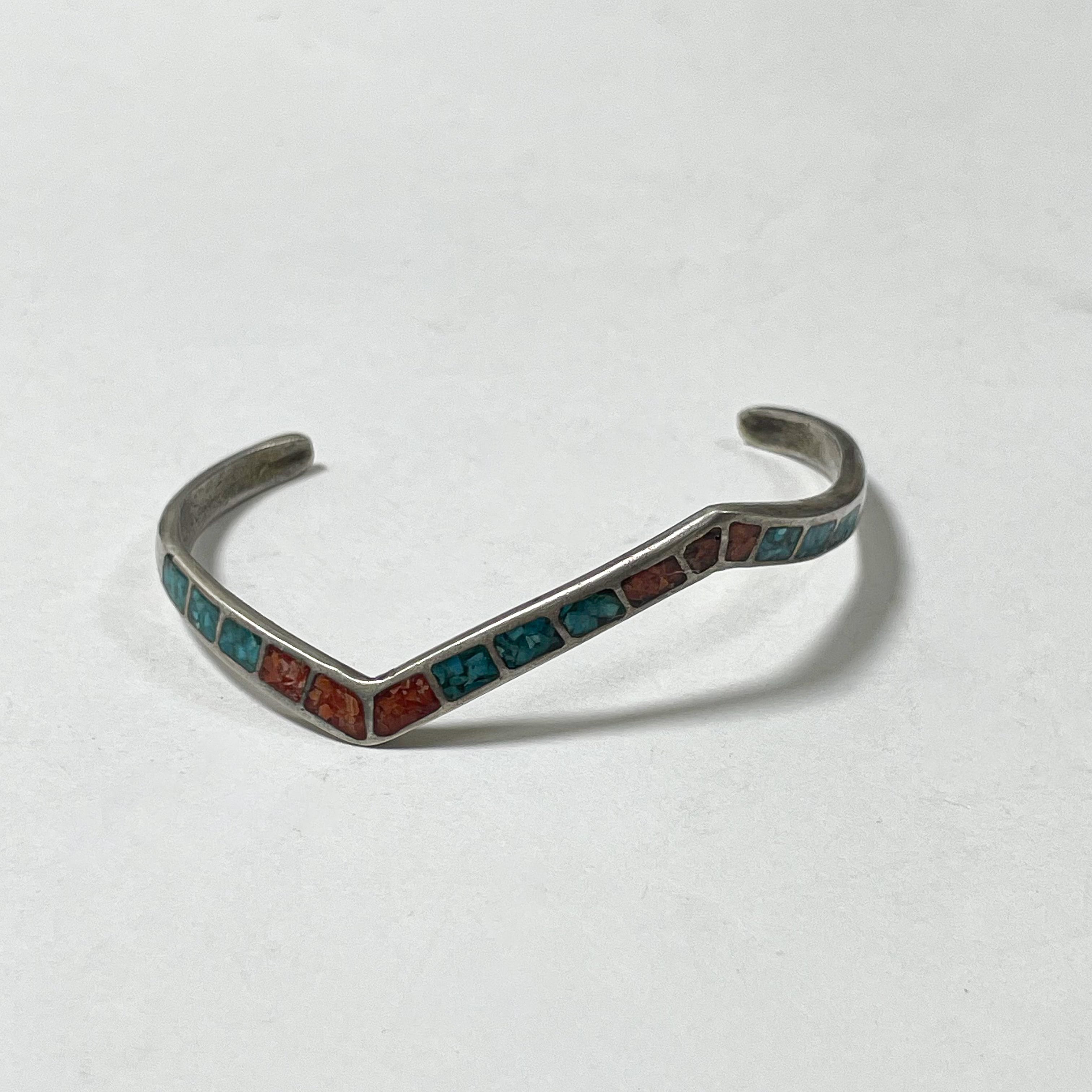 ジグザグした造形にクラッシュしたターコイズとコーラルがセットされたインディアンジュエリーらしい土臭い雰囲気で、コテコテなUS古着と相性バッチリです。