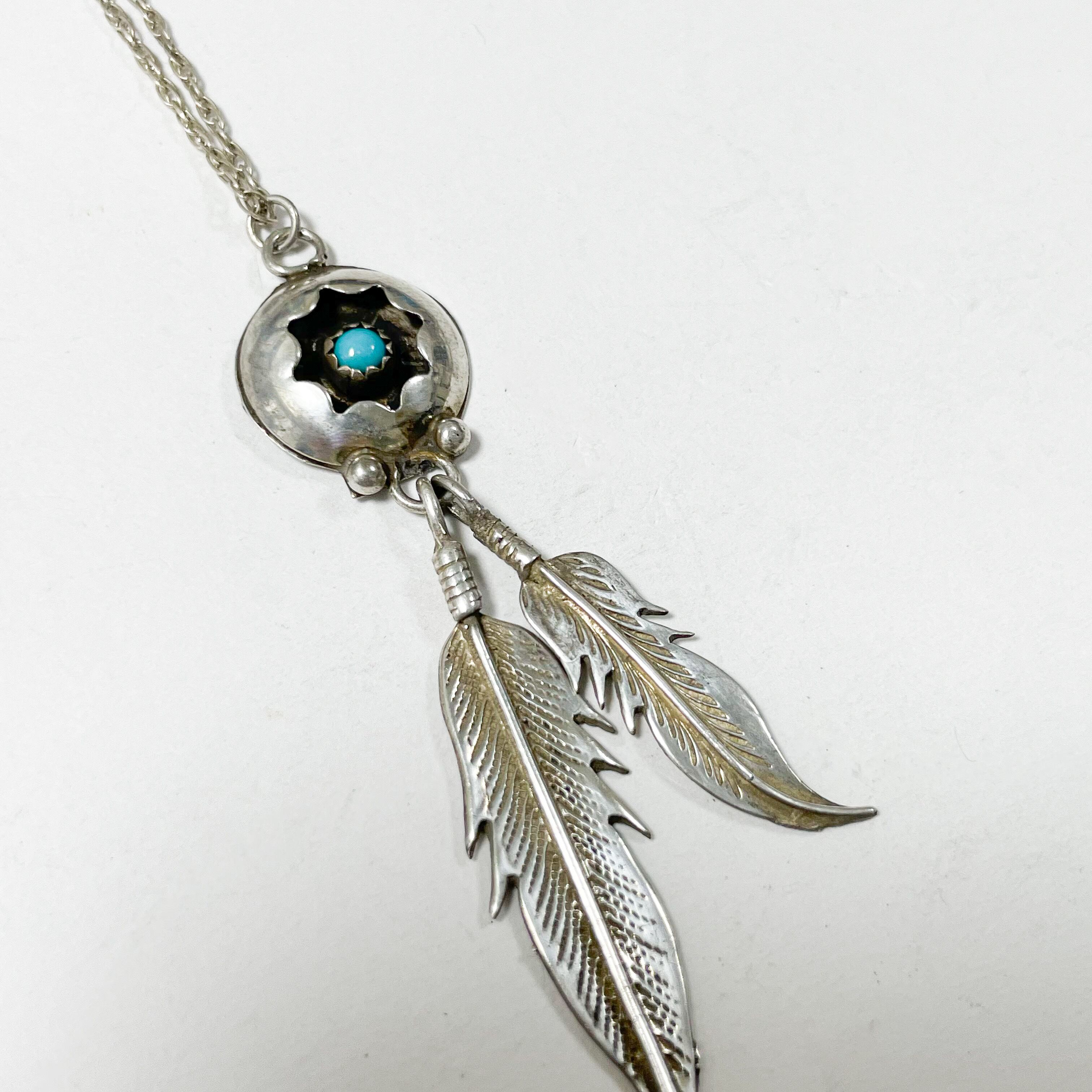 インディアンジュエリーのヴィンテージターコイズフェザーペンダントネックレスです。
