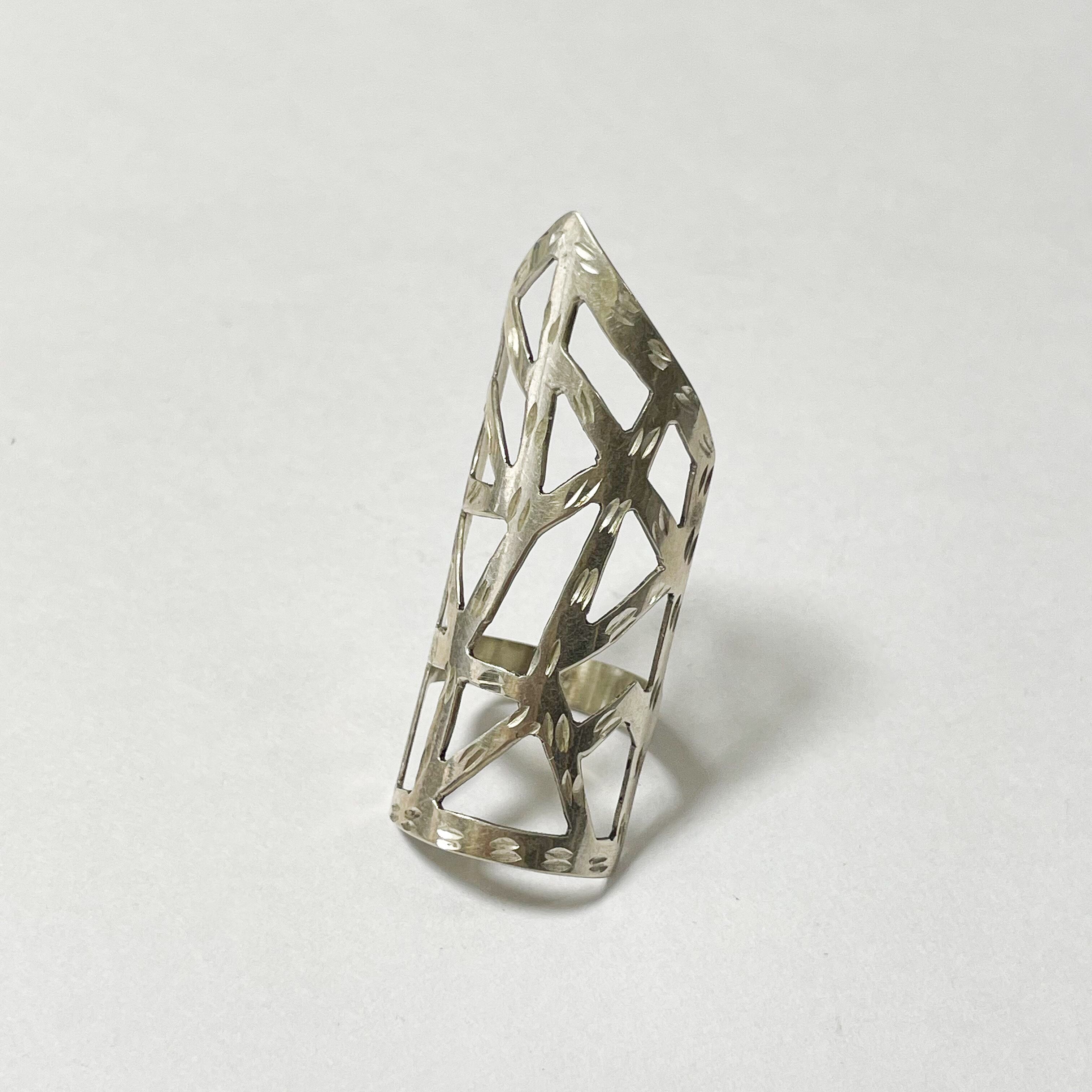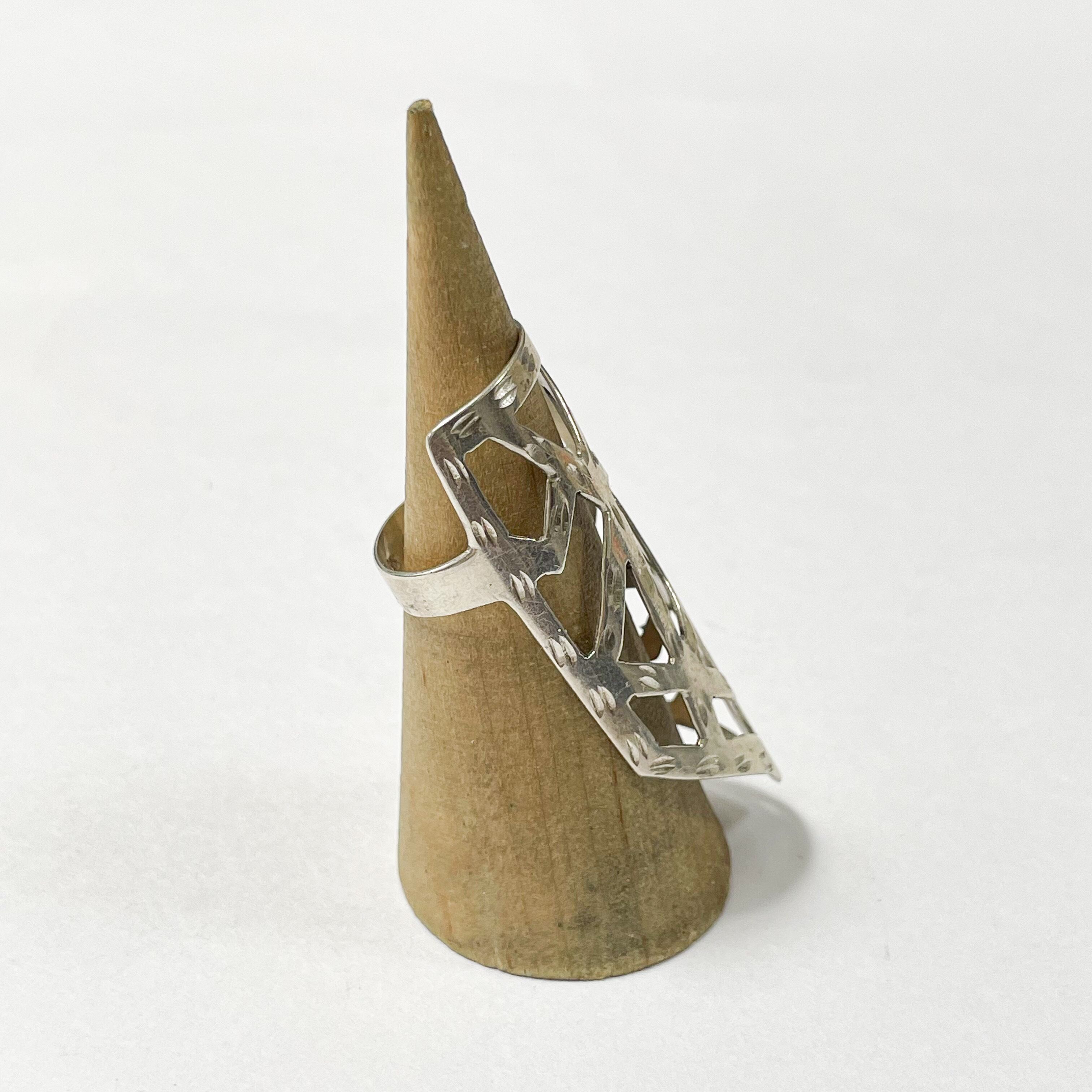 エッジの効いた造形で、大胆なオープンワーク、そしてタガネによる模様がアクセントになった個性的なデザインです。