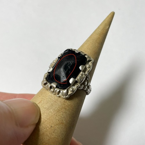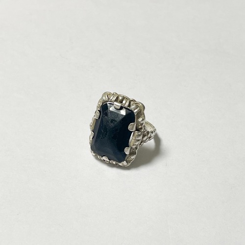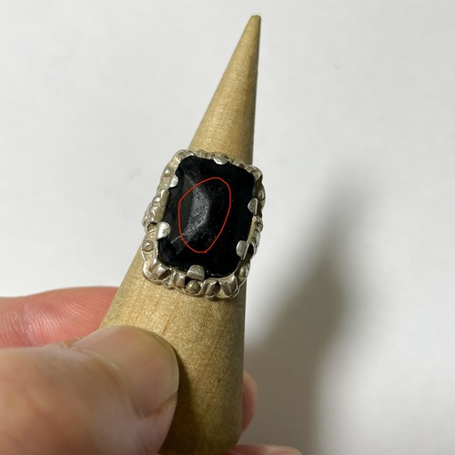マウントされたルースはブラックジェットガラスで、しっかり爪留めされています。