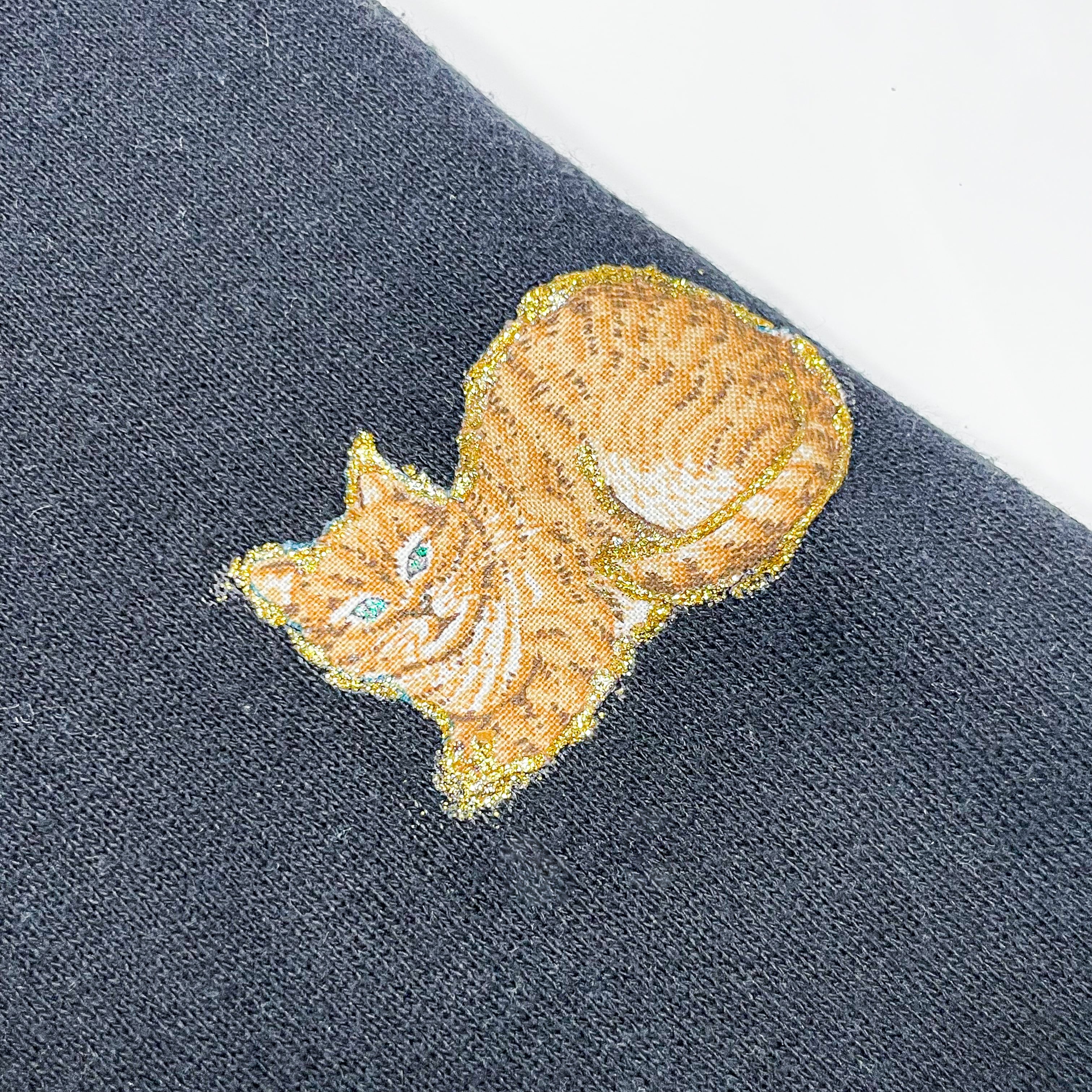 猫ちゃんがプリントされたテキスタイルがラメ入りボンドみたいもので貼り付けられています。