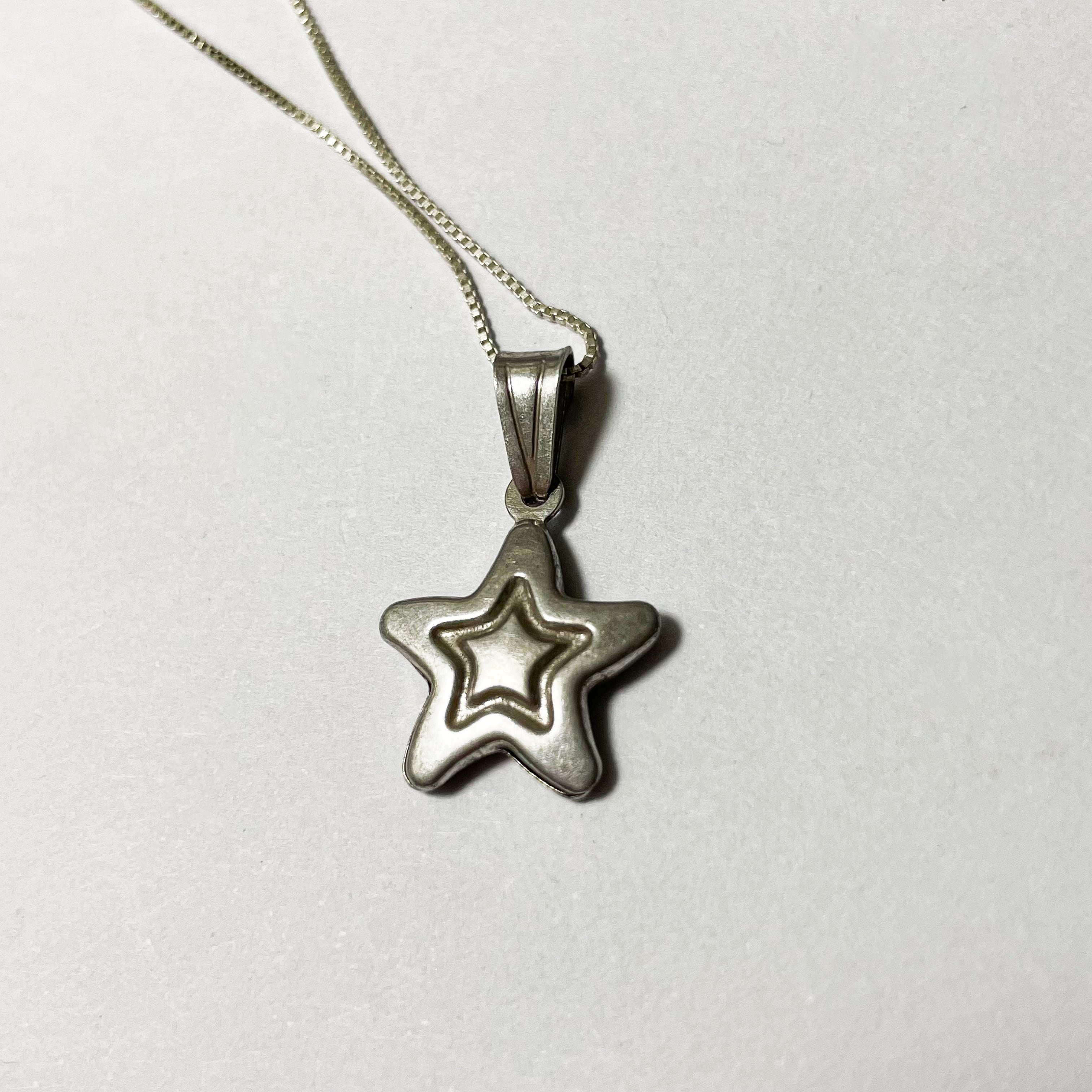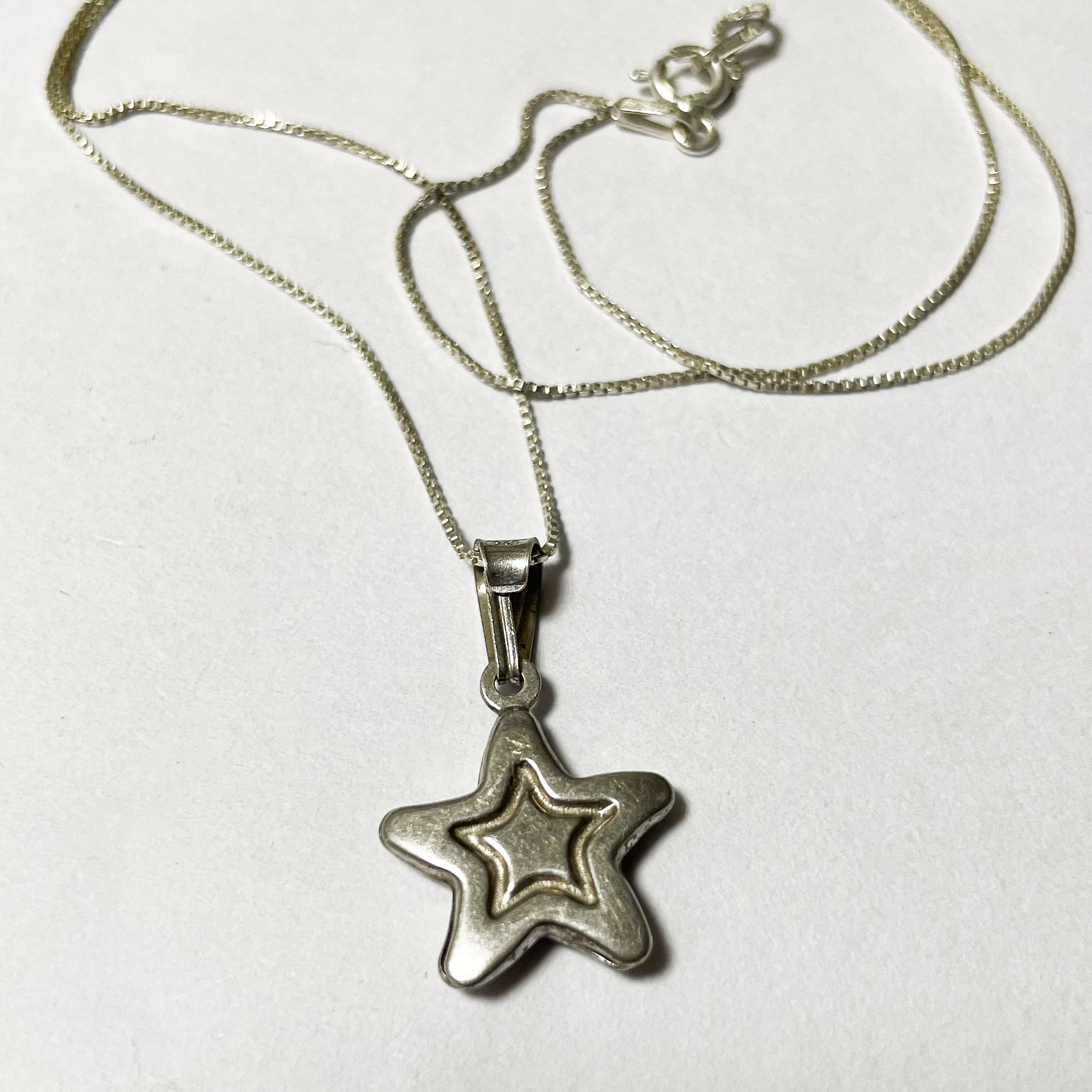 イタリア製925シルバーのヴィンテージスターペンダントネックレスです。 小さめサイズのスターデザインのトップが可愛らしいです。 バチカンにイタリア925シルバーのホールマークが確認できます。 こちら80's〜のヴィンテージです。 Weight*約2.4g Size*チェーンの長さ約46cm Condition*特に目立つダメージや汚れはなく良い状態です。 あくまで年代物ですので神経質な方や新品の様なものをお求めの方はご購入をお控え下さいませ。