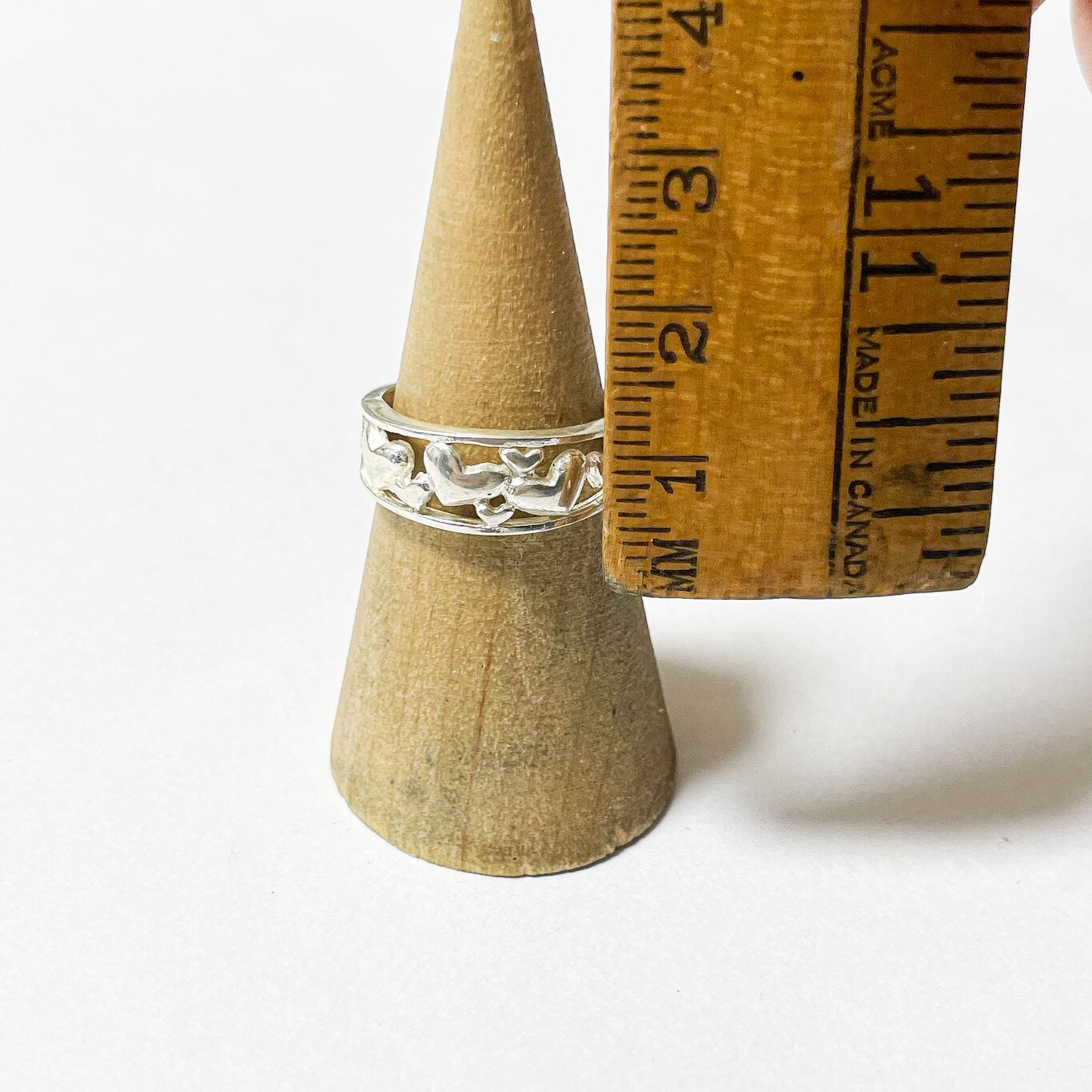 925シルバーの透かしハートリングです。 透かしになった沢山のハートデザインがとっても可愛いです。 ハンガリーで見つけたものですが925の刻印のみで、恐らくタイらへんで作られたものかと思います。 こちらは90's〜のお品です。 Weight*約2.2g Size*約15号 Condition*特に目立つダメージや汚れはなく良い状態です。 あくまで年代物ですので神経質な方や新品の様なものをお求めの方はご購入をお控え下さいませ。