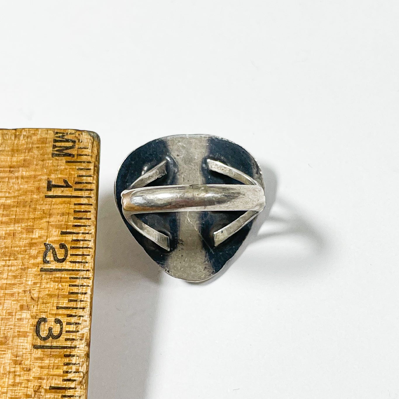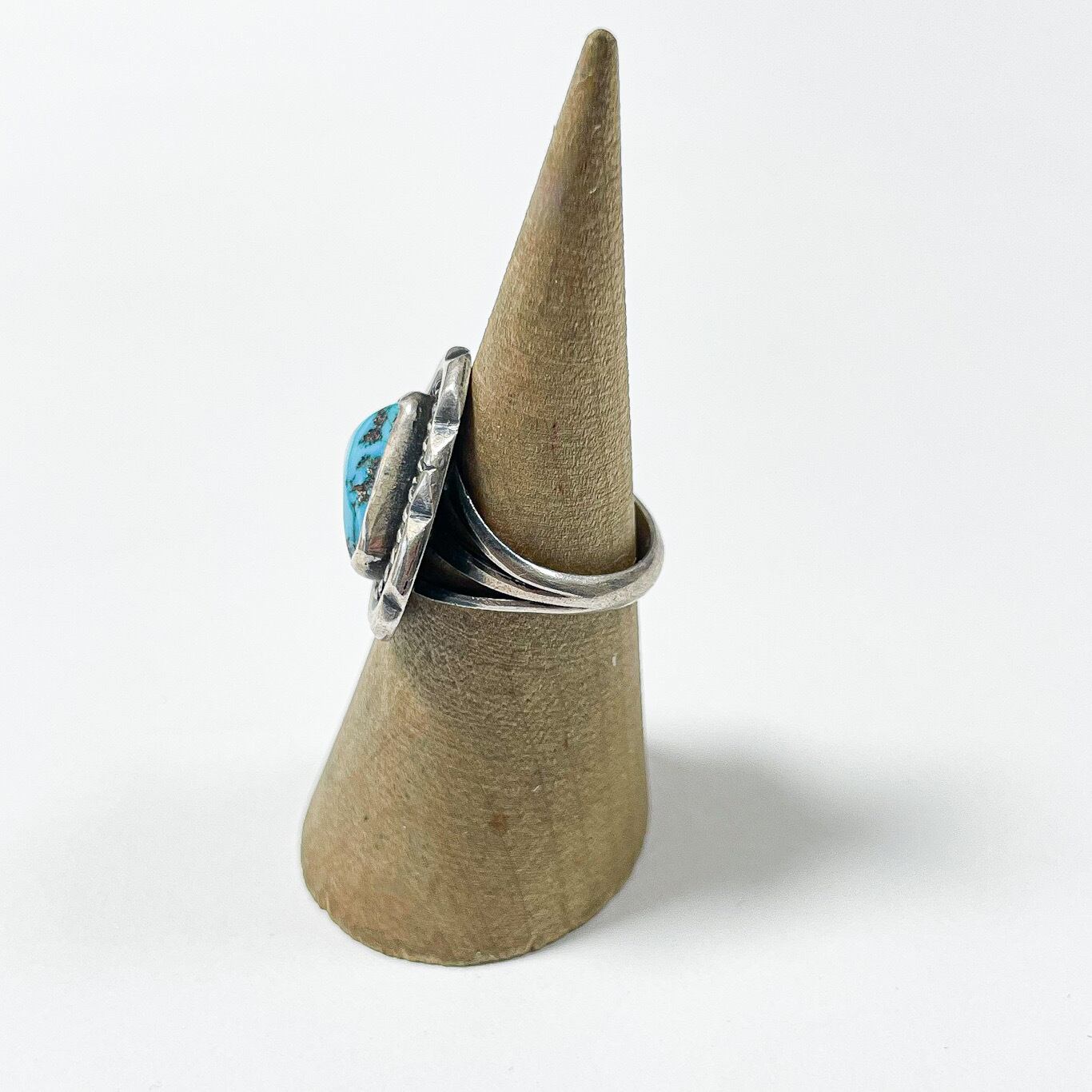 美しいブルーが際立つ三角形のターコイズがマウントされた存在感のあるリングです。