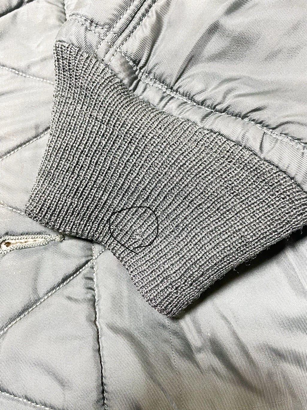 リブには小穴がございましたので、手縫いでキレイにリペアしました。裾のシミ、リペア跡は黒丸部分です。