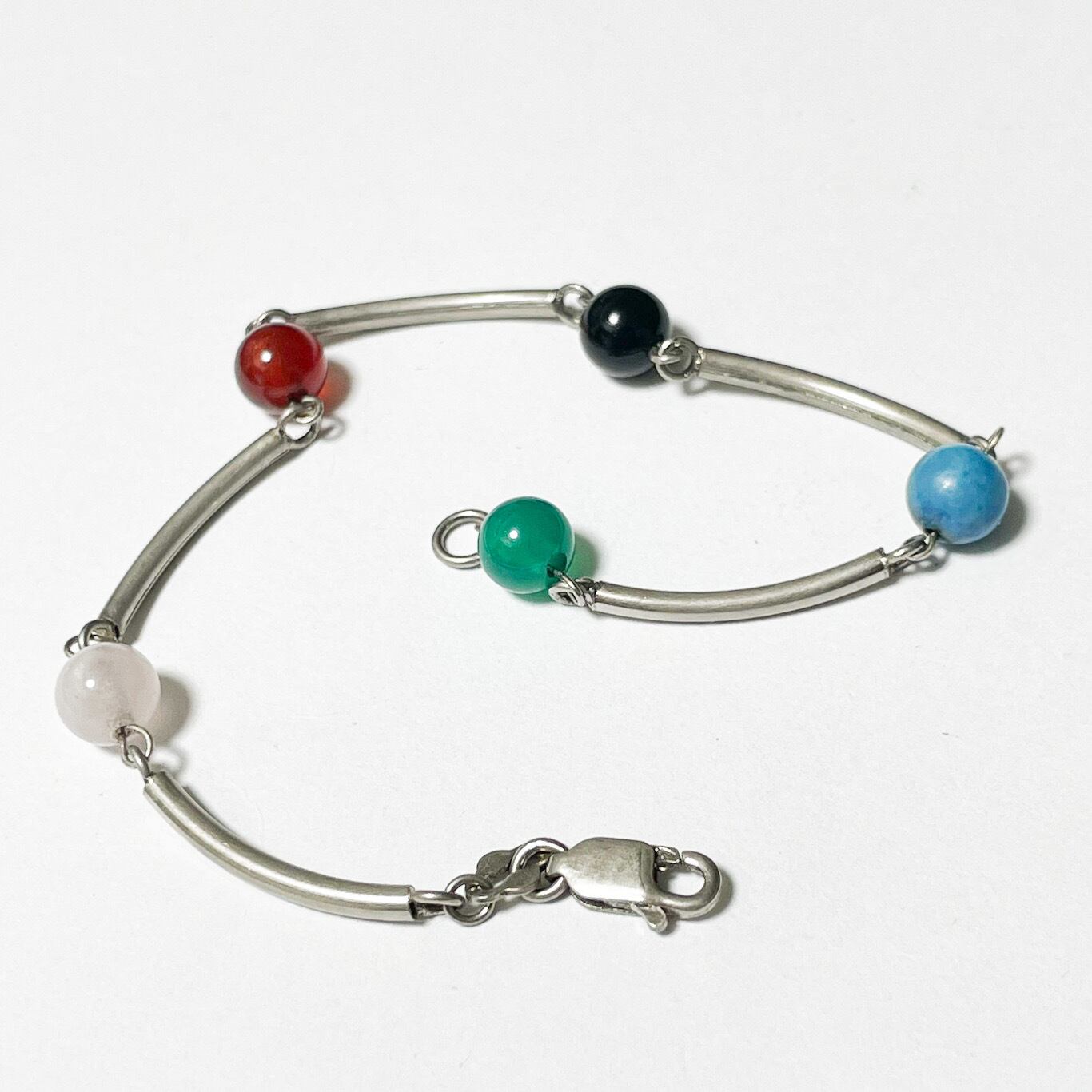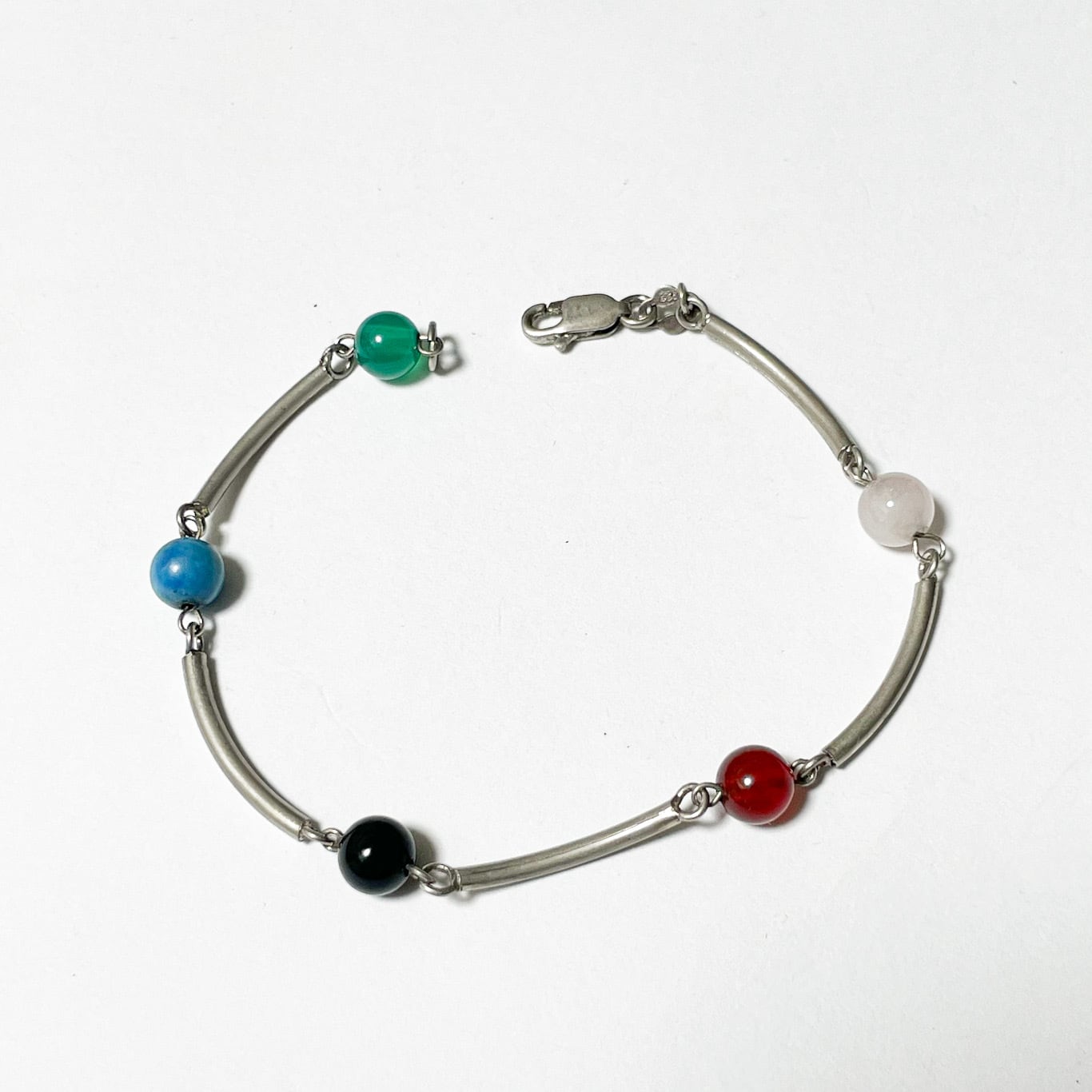 925シルバーの細身バーと、色とりどりの天然石ビーズを組み合わせた、軽やかな印象のヴィンテージブレスレットです。