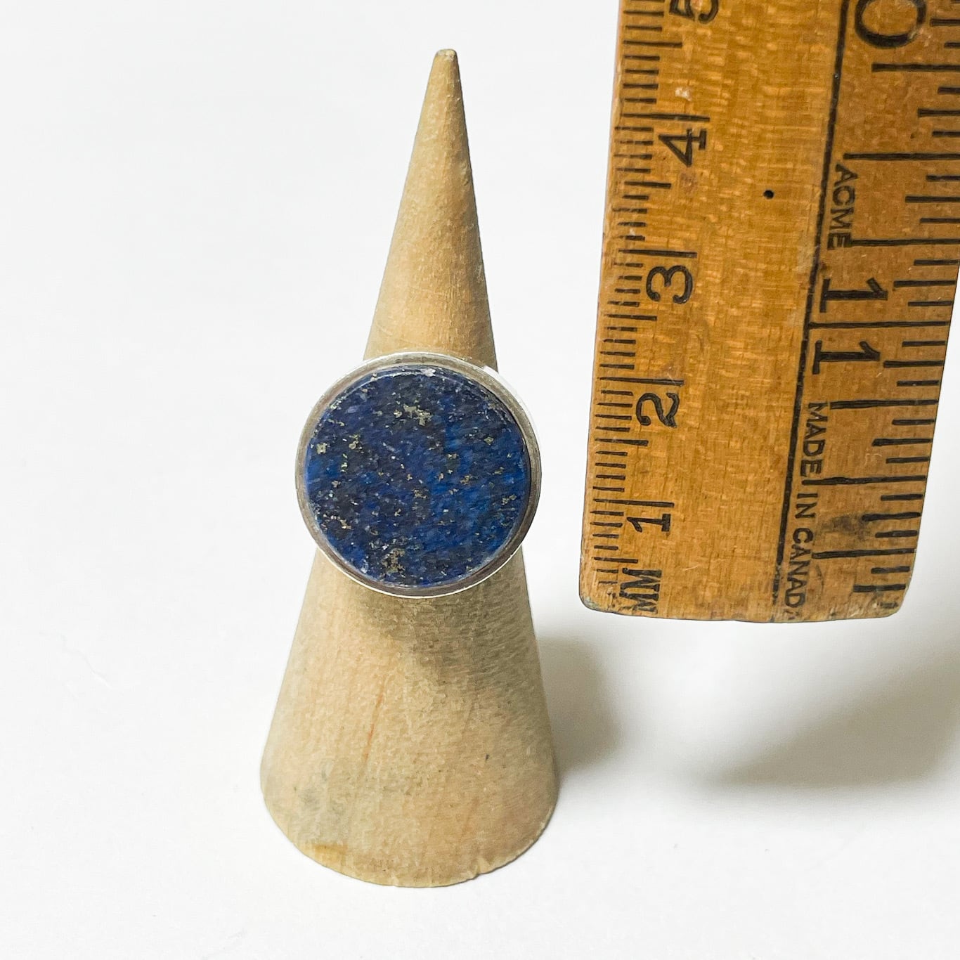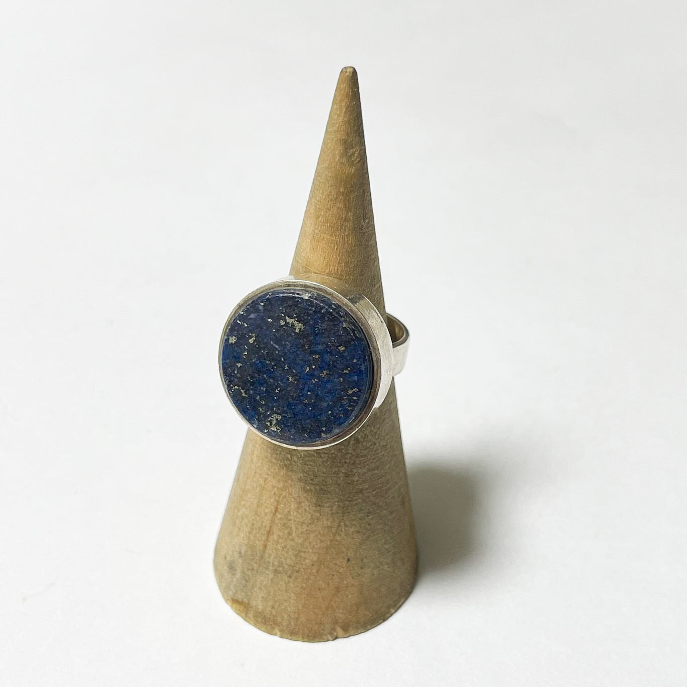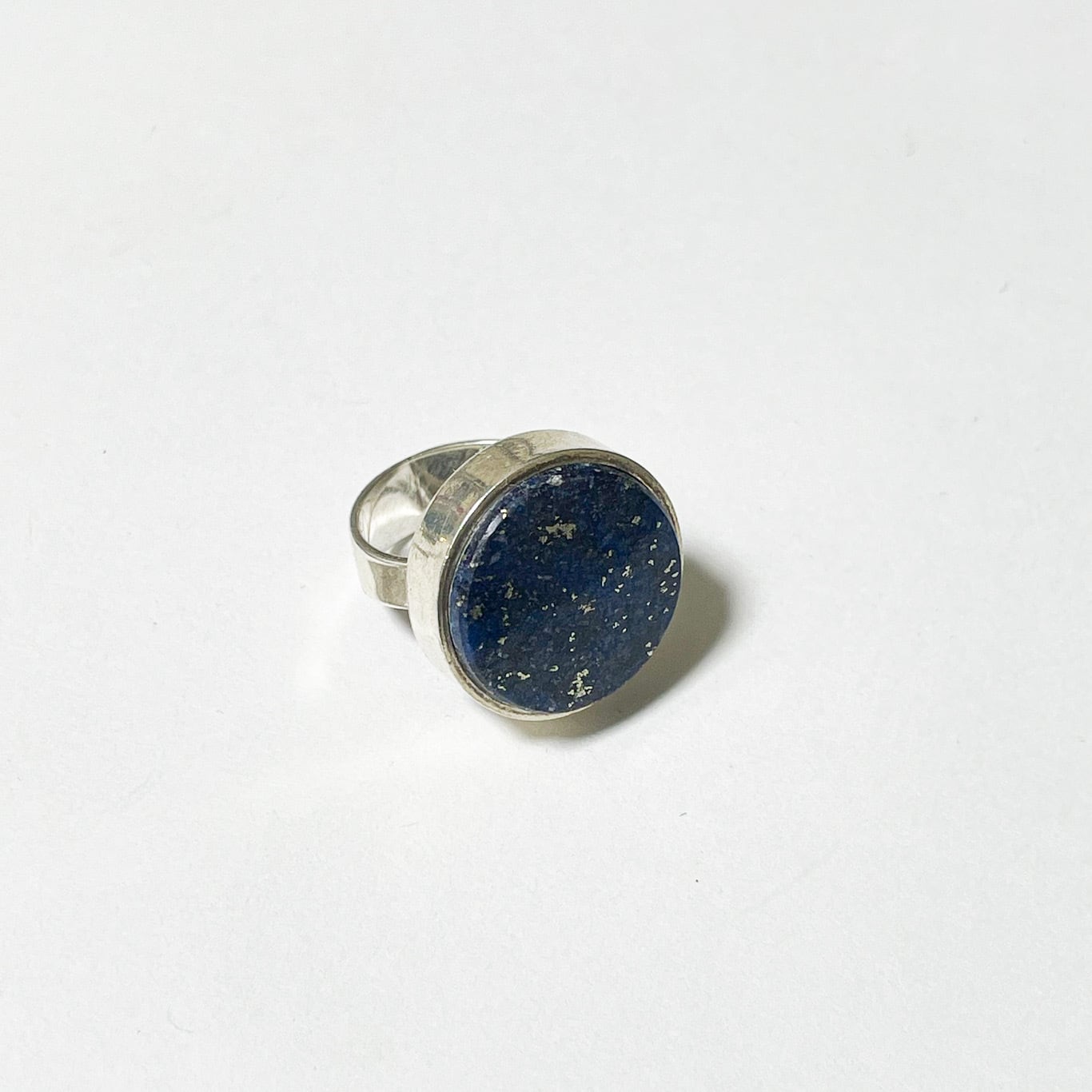 深いブルーのラウンド型ラピスラズリがセットされた、ミッドセンチュリーらしいミニマル&モダンなデザインが魅力の一品です。