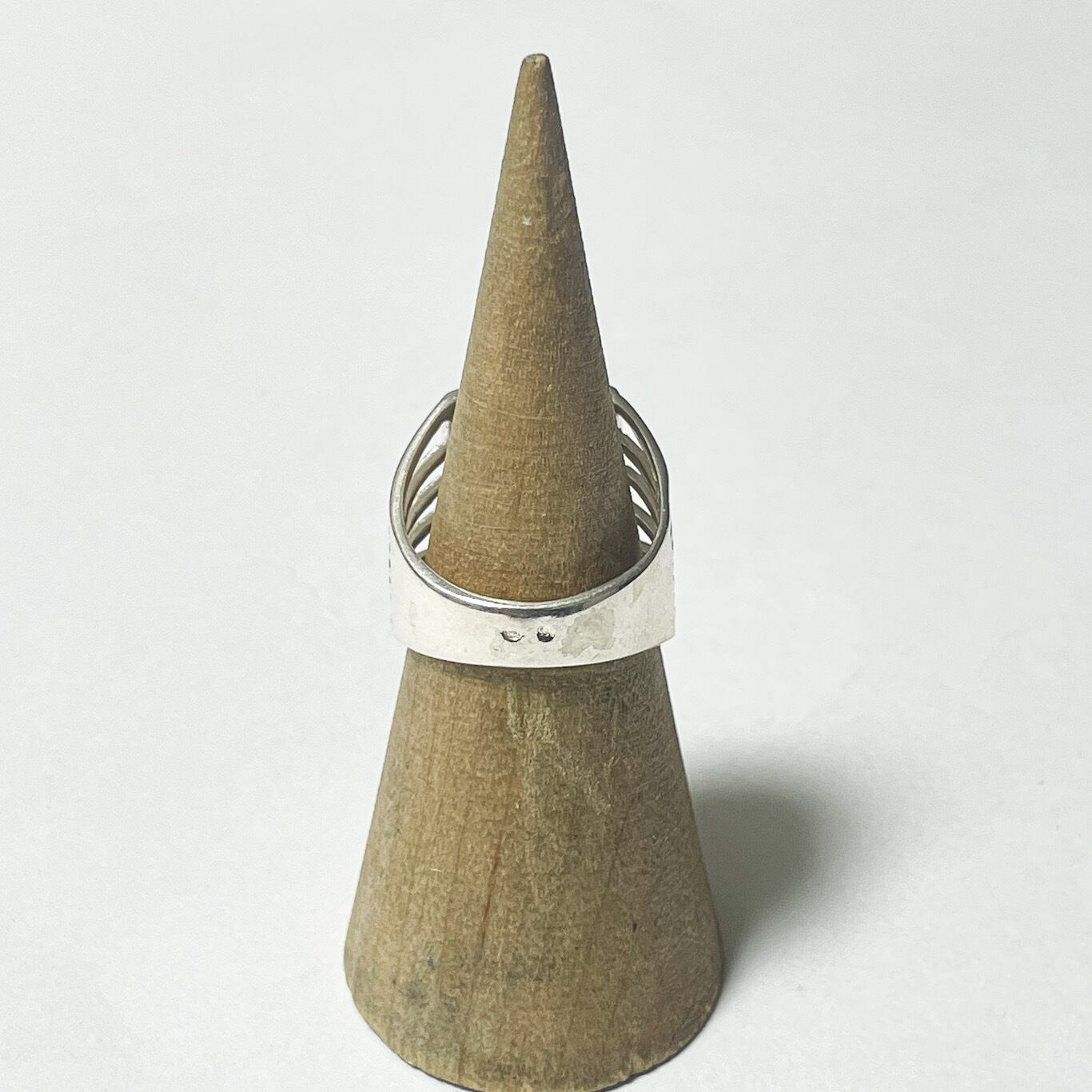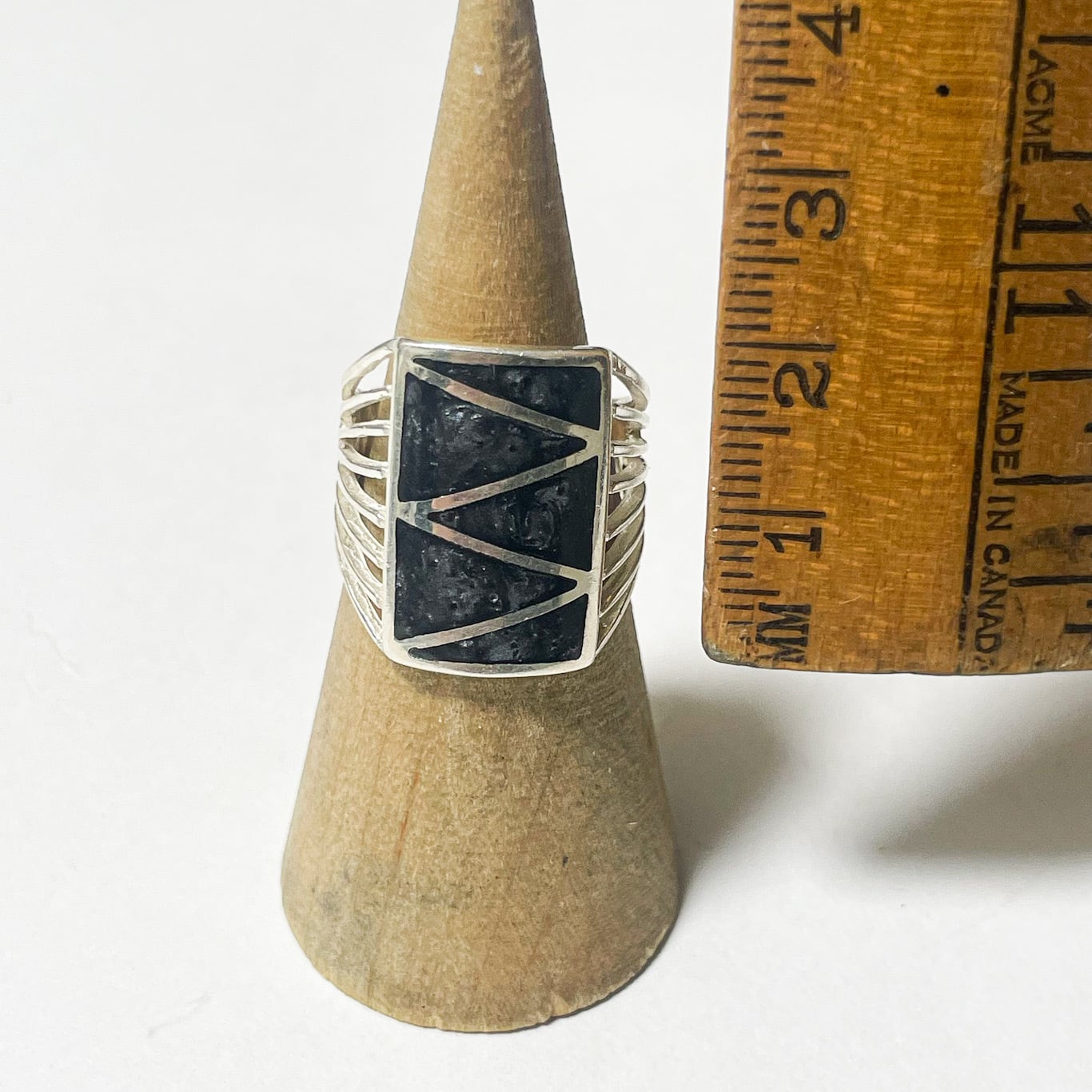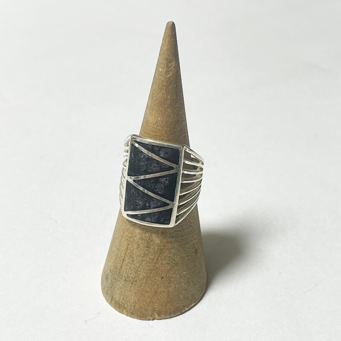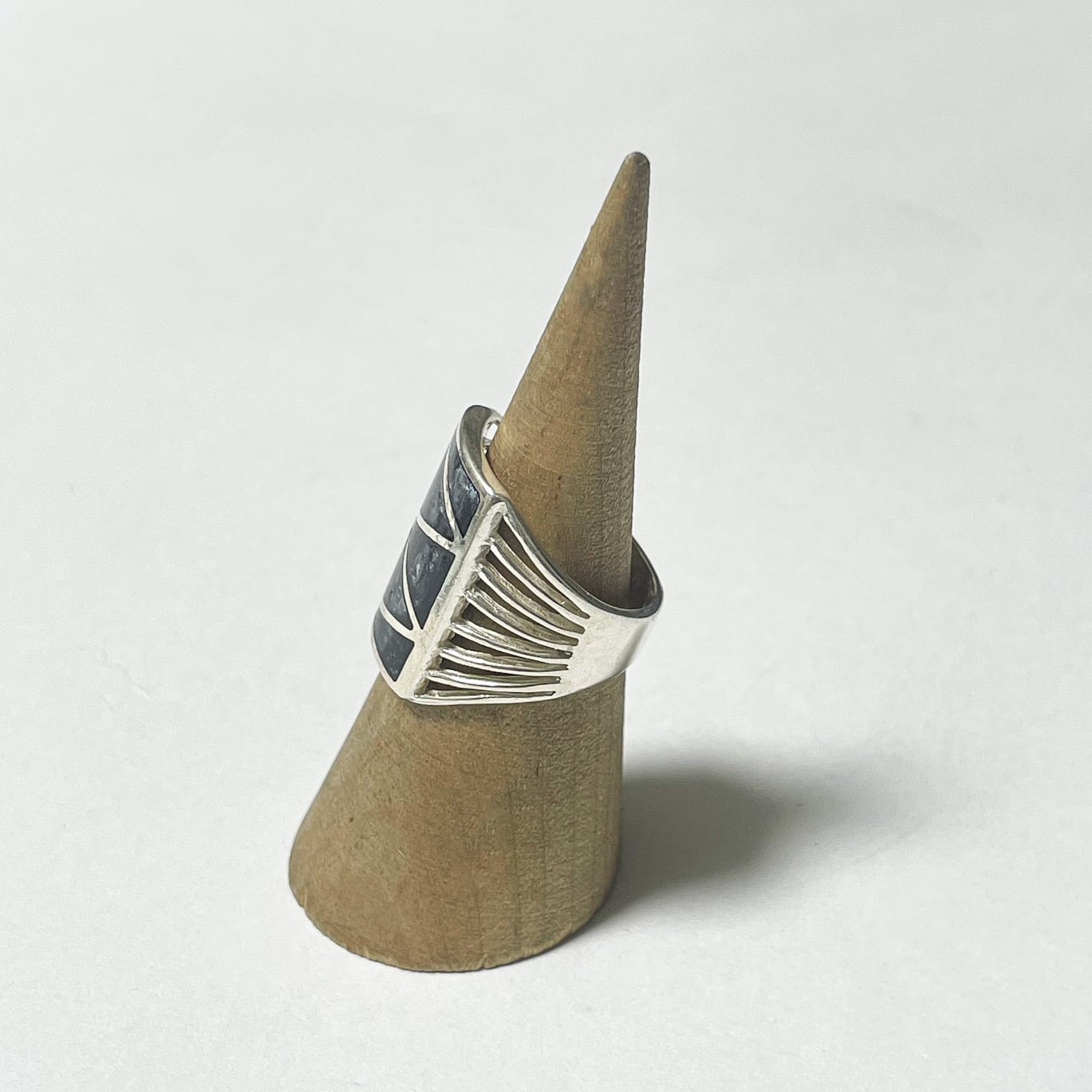 フロントにはブラックカラーの天然石がインレイされ、幾何学なシルバーのラインがシャープなアクセントとなっています。