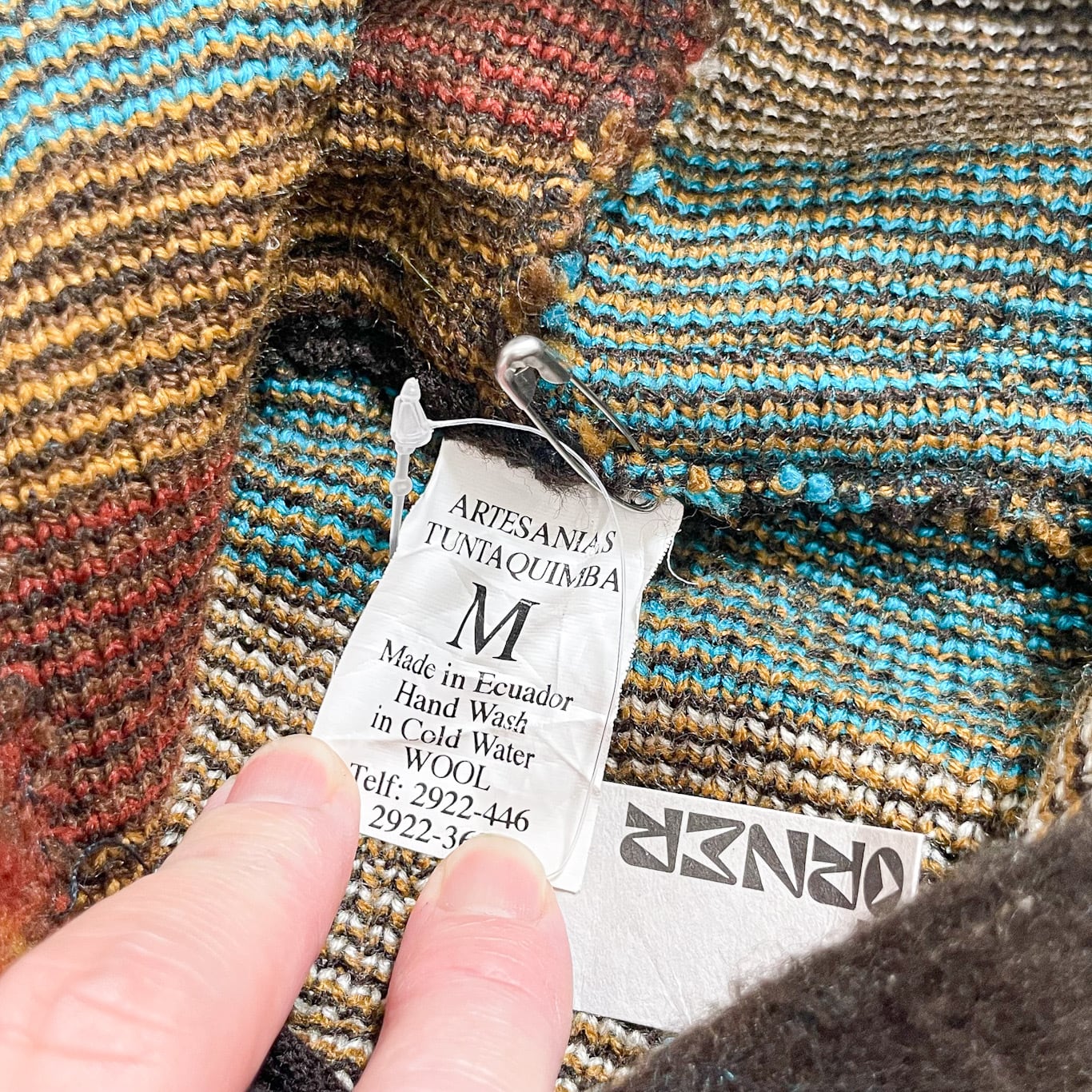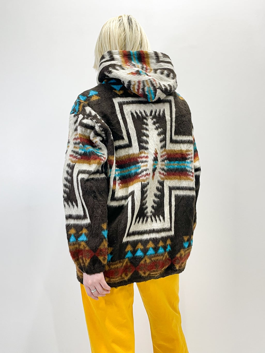 ブラウンを基調に、ターコイズ・レッド・マスタードなど多色を織り交ぜたネイティブパターンは存在感があります。