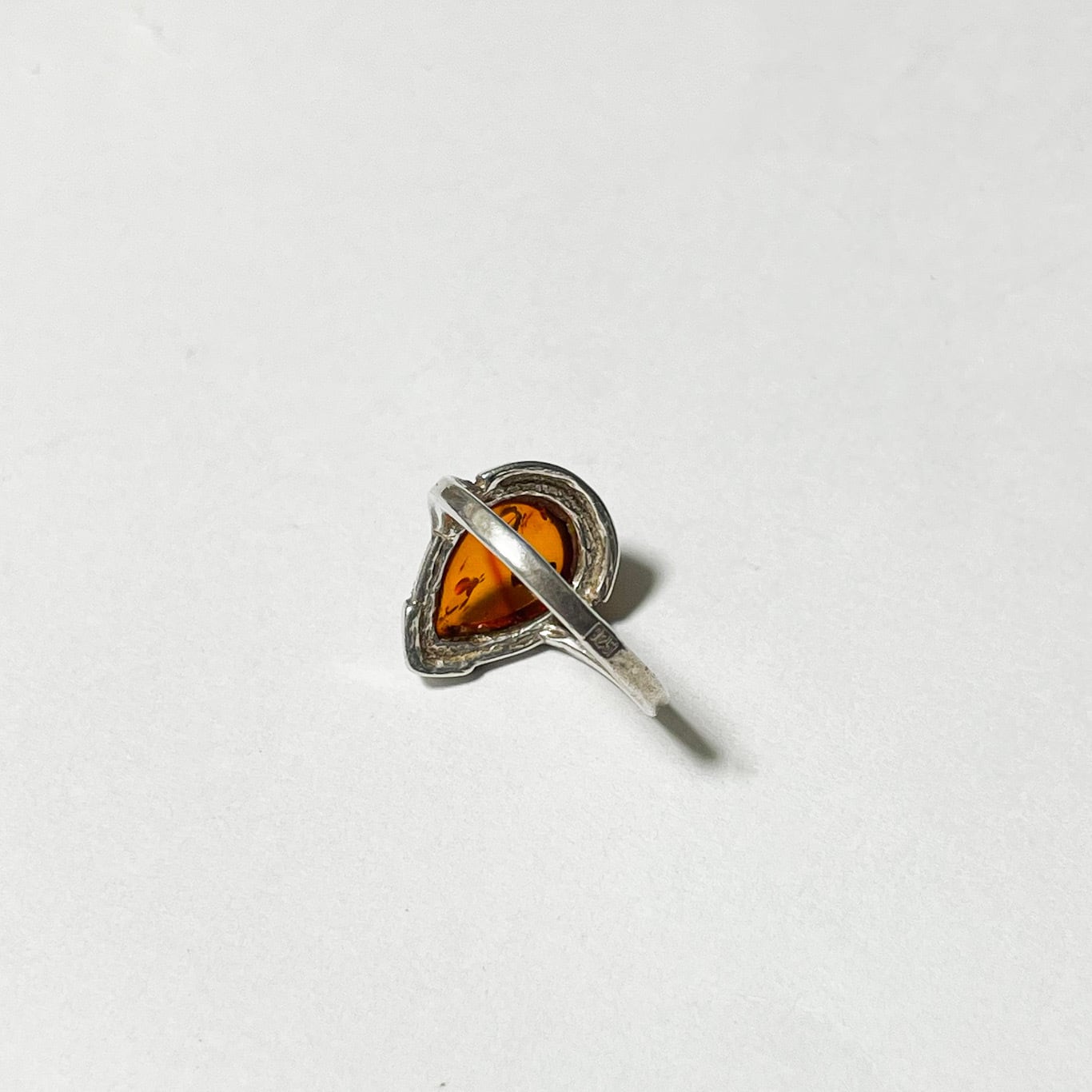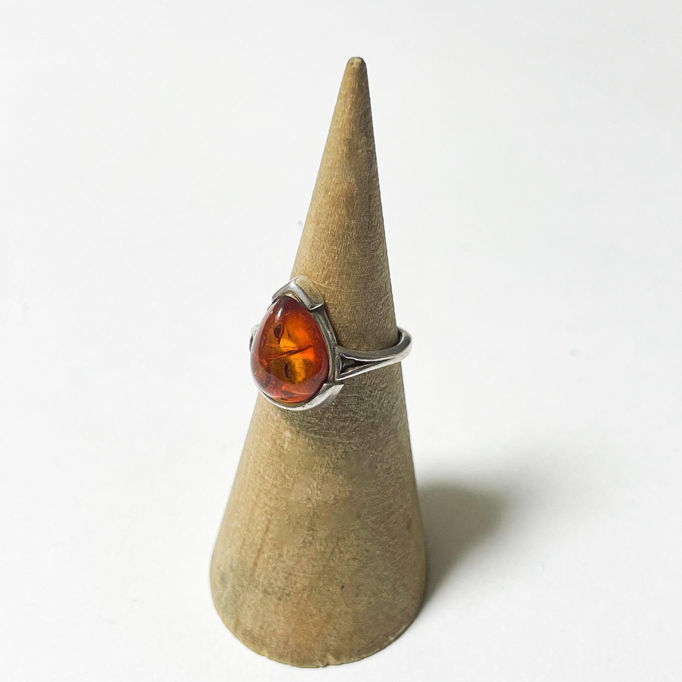 コニャックカラーの雫型アンバーのルースを、シルバーのアームで包み込んだクラシックなデザインです。