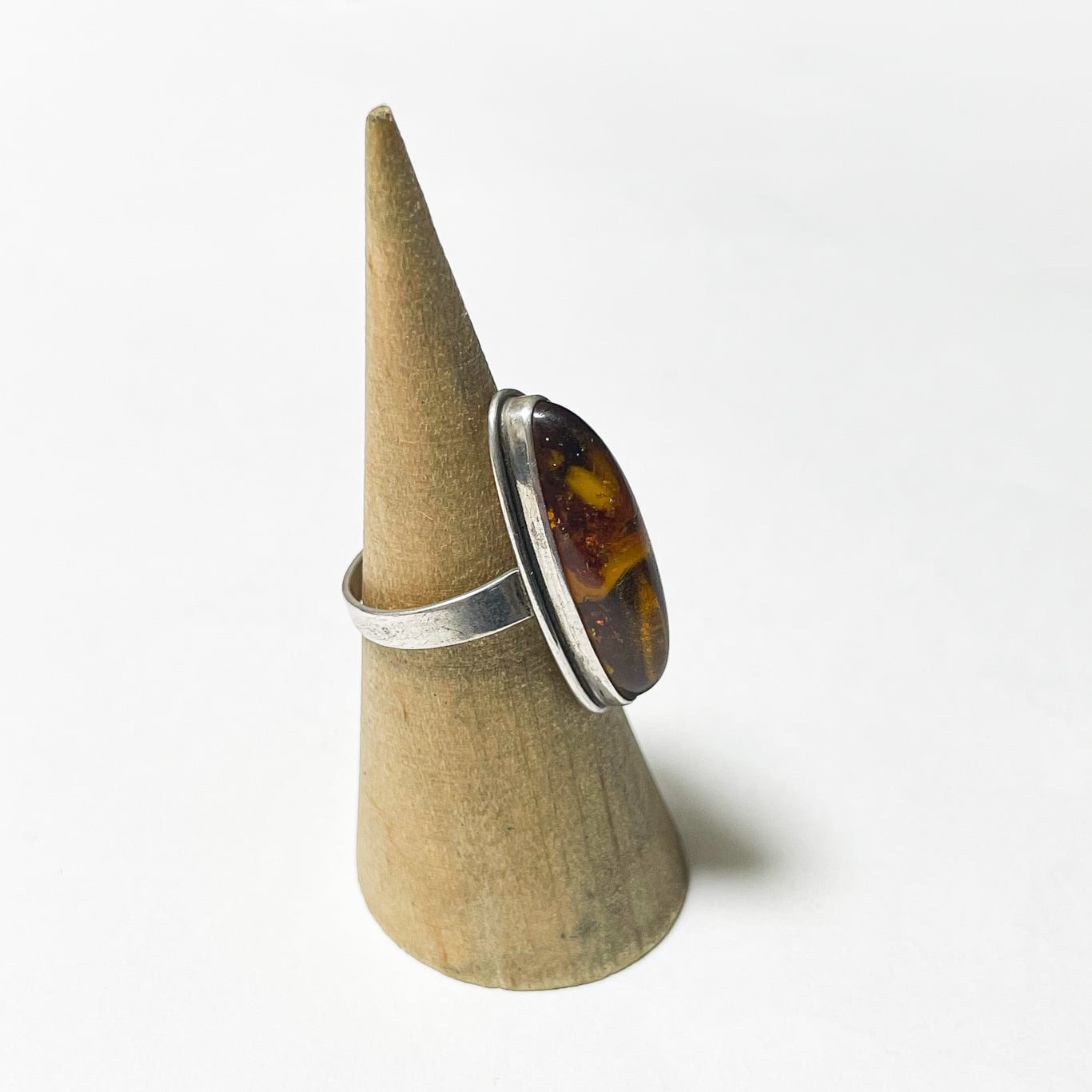 深いコニャックカラーが美しいオーバル型のアンバーカボションには、は植物片のようなインクルージョンとグリッター浮かび、まるで小さな景色を閉じ込めたような表情をしています。