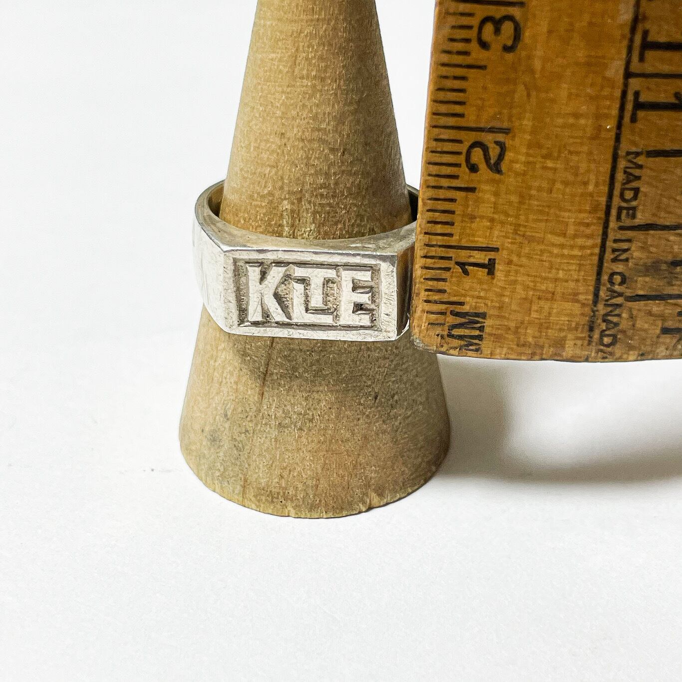 シグネットリングらしい重厚感のあるフォルムとエッジの効いた KLTE のレタリングが特徴で、使用感や細かな擦れがヴィンテージならではの雰囲気を引き立てています。