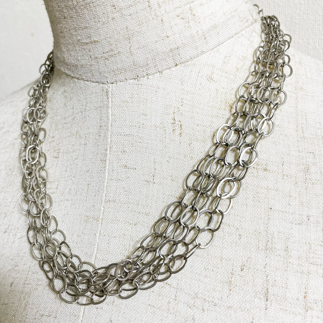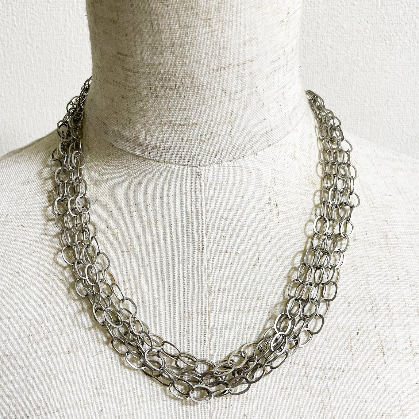 925シルバーの5連チェーンのネックレスです。細かなオーバルチェーンを幾重にも束ねることで、軽やかさとボリュームの両方を備えたデザインに仕上がっています。