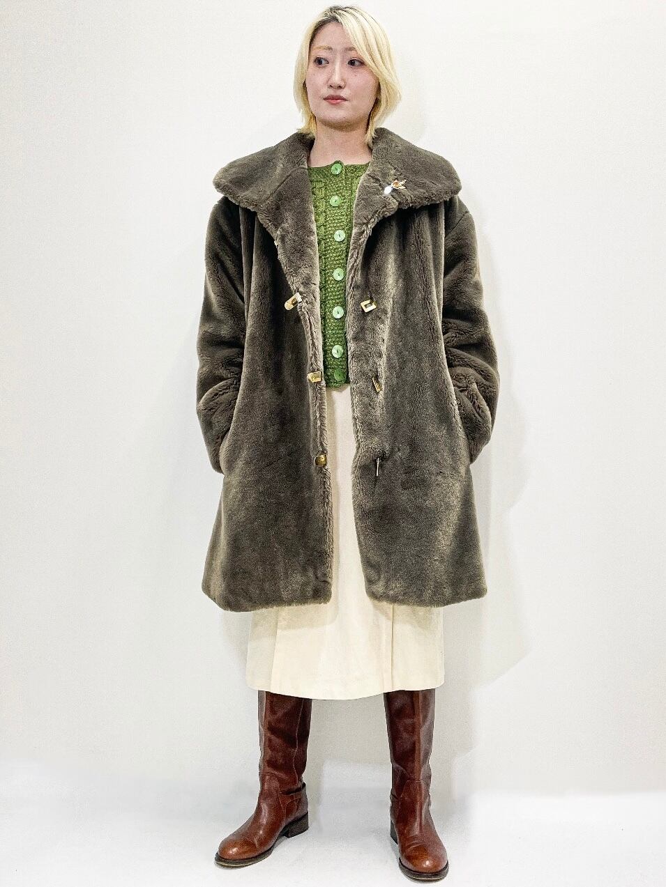 グレーにベージュを溶かしたような奥行きのあるカラーリングで、大きめの襟がお顔まわりを華やかに演出してくれます。