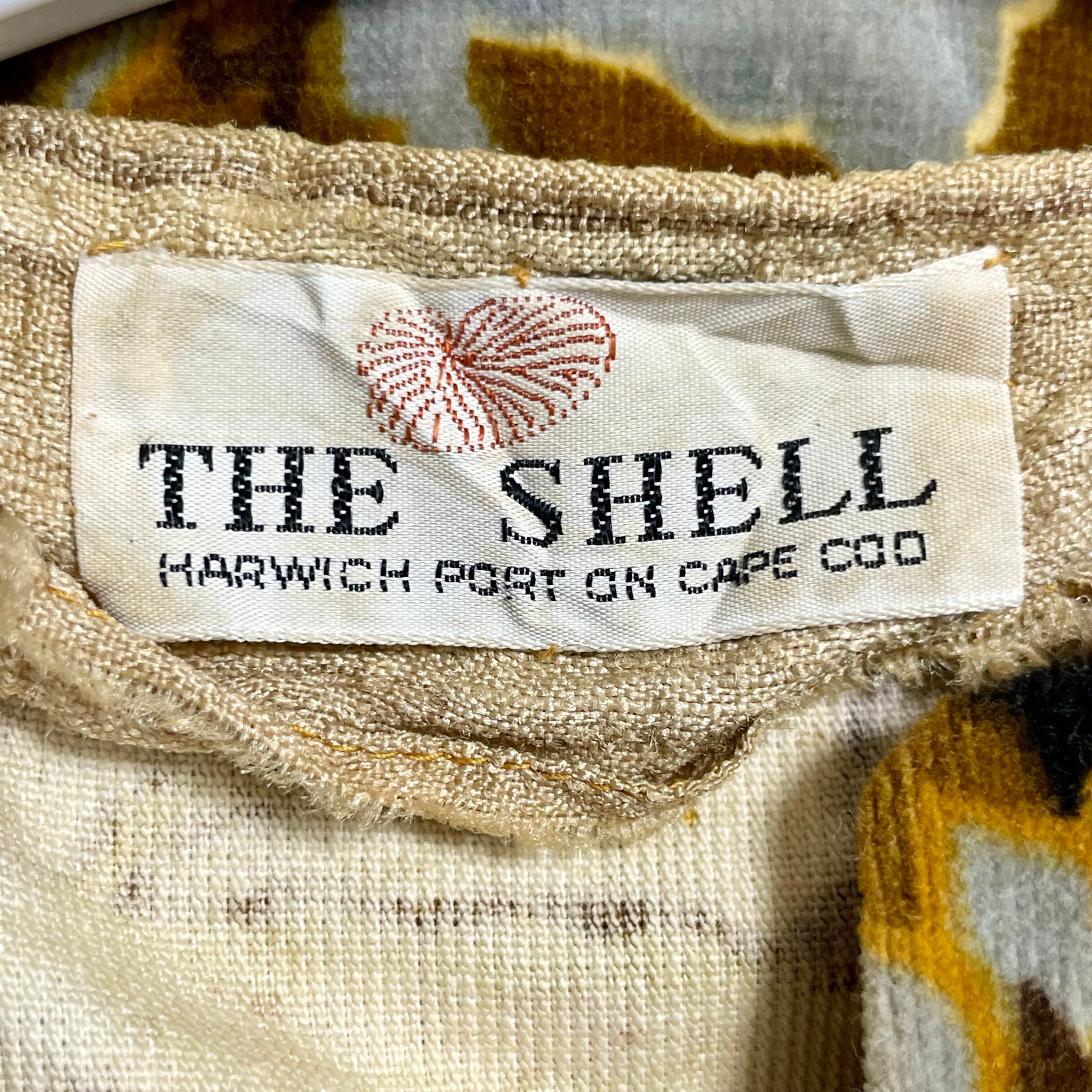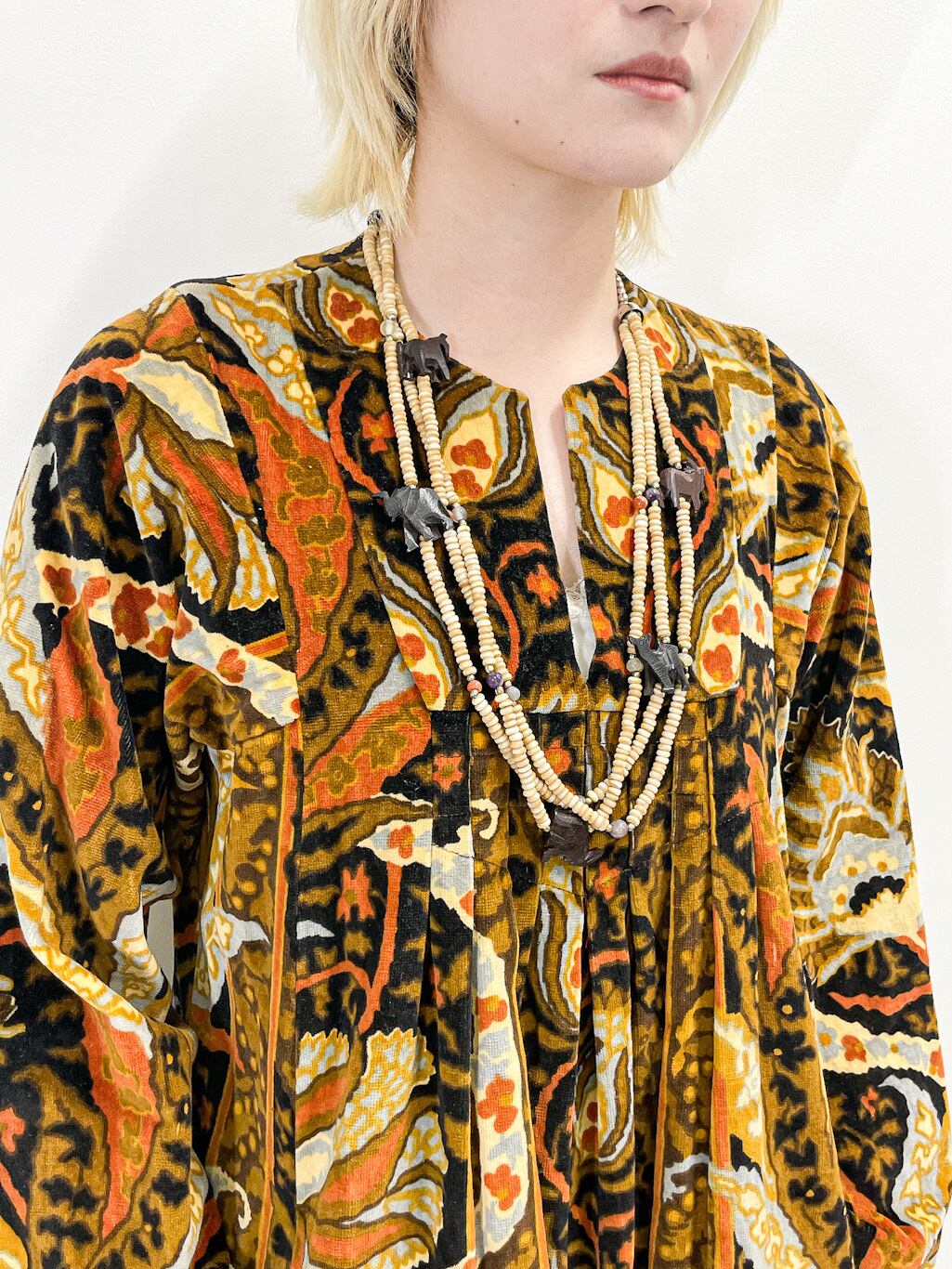 深みのあるブラウンやマスタードをベースに、有機的な曲線や植物モチーフを思わせる総柄が印象的な一着です。