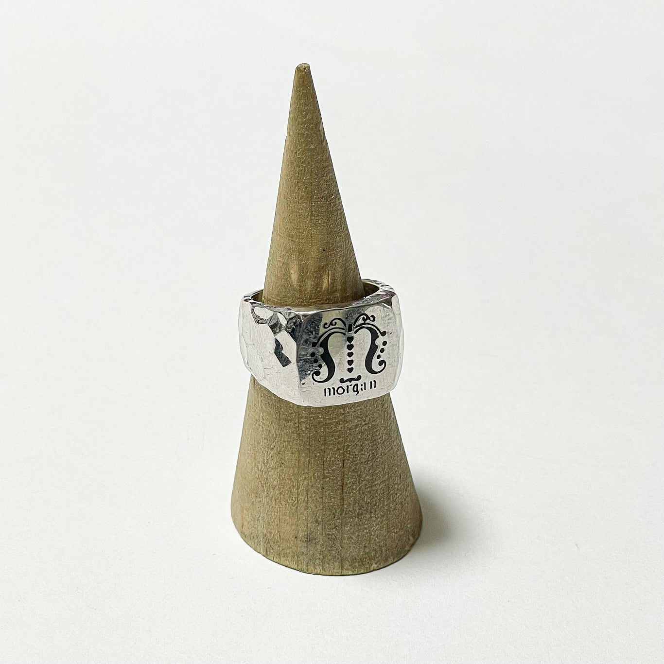 アルファベットのMを、蝶のような虫モチーフに見立てた左右対称デザインのシグネットタイプ。