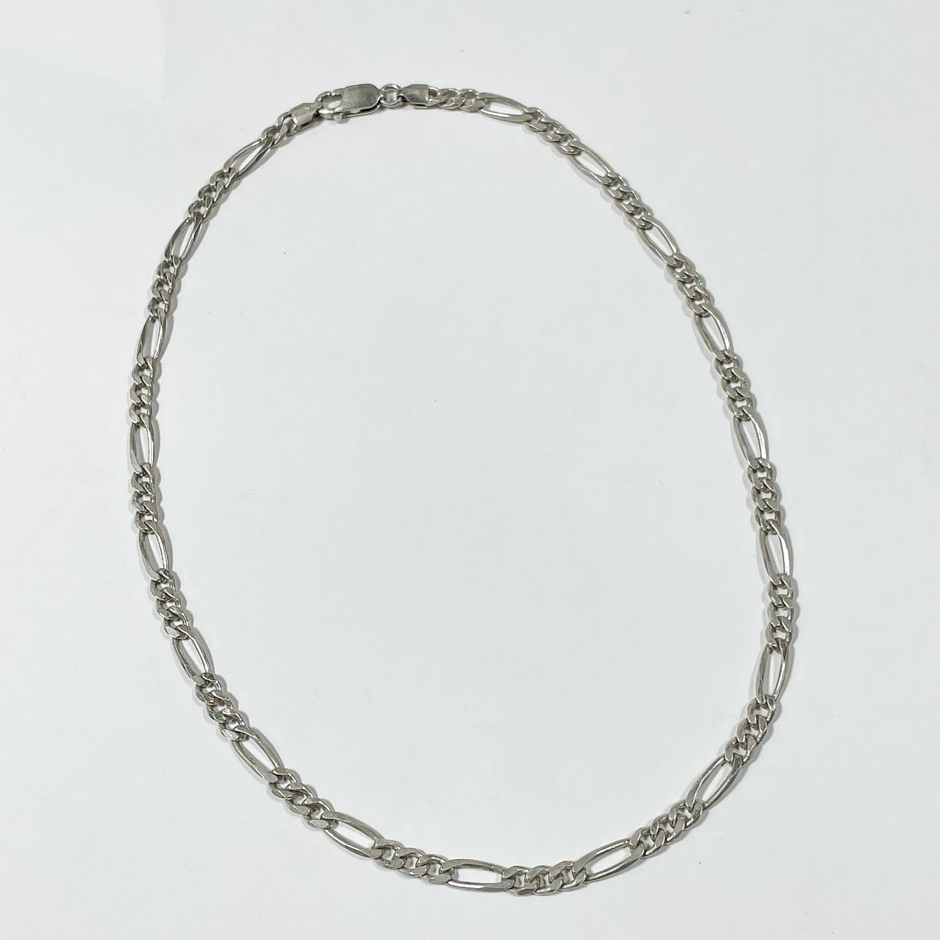 長短のコマがリズミカルに連なるフィガロチェーンならではの造形が、首元に力強いアクセントを与えます。