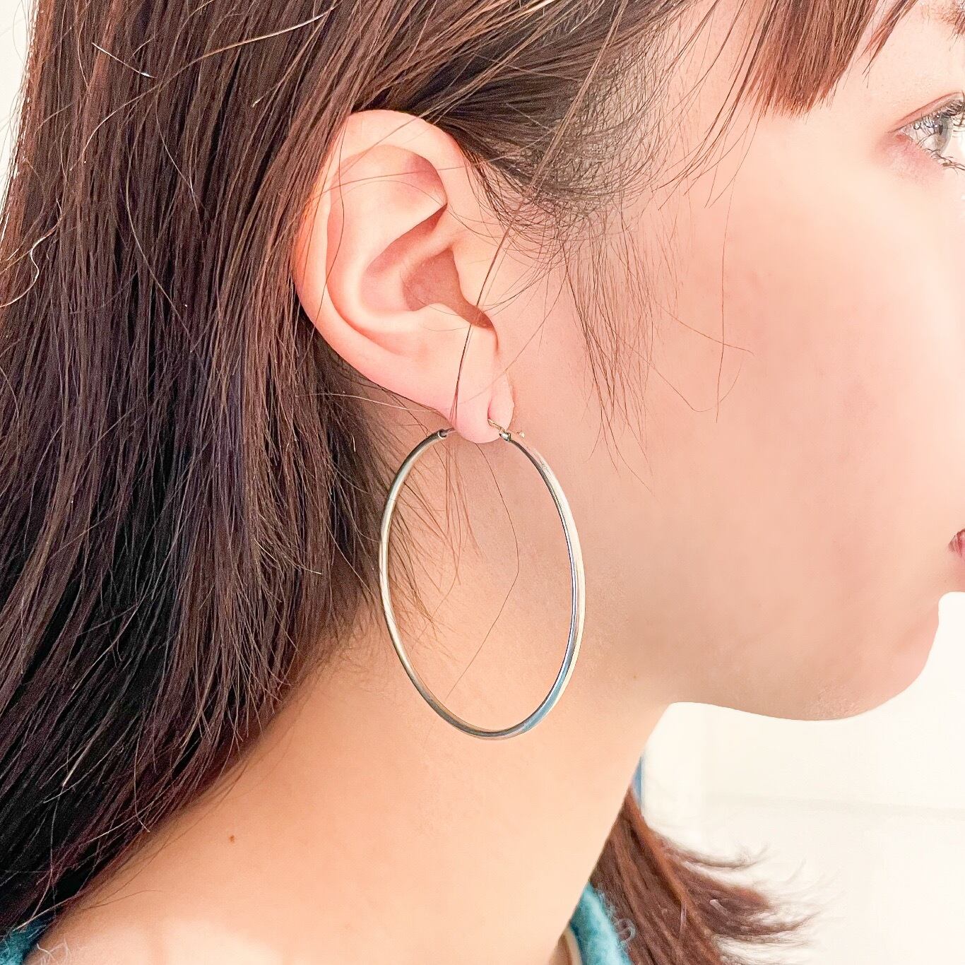 大きめのフープは顔まわりにしっかりとした存在感を放ち、スタイリングのアクセントになります。