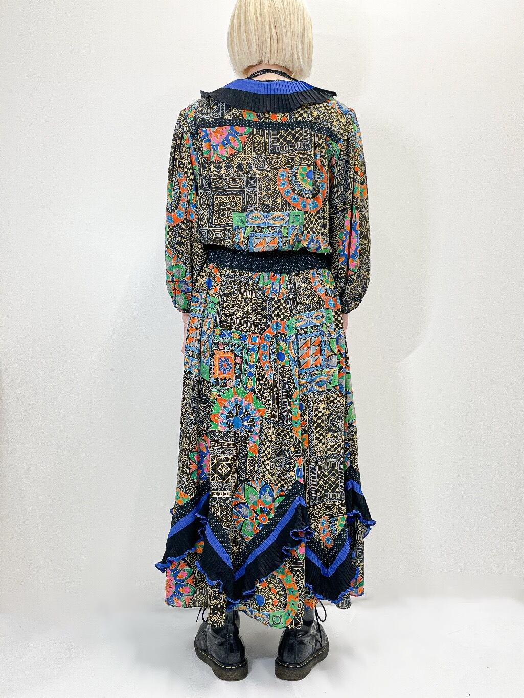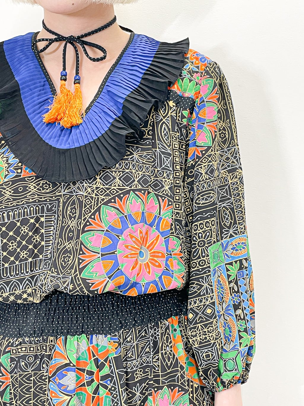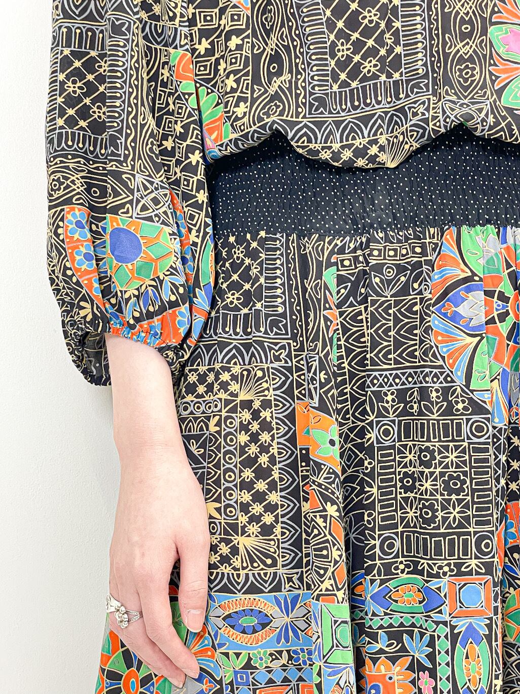 Diane Freisからの強い影響を感じる幾何学模様や、花のモチーフを組み合わせた大胆な総柄は抜群のインパクトです。