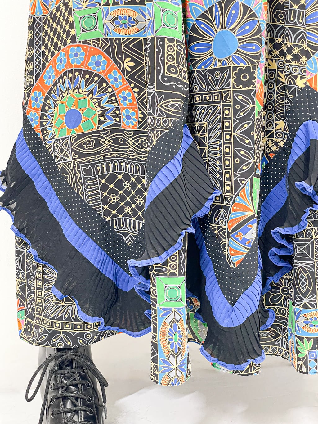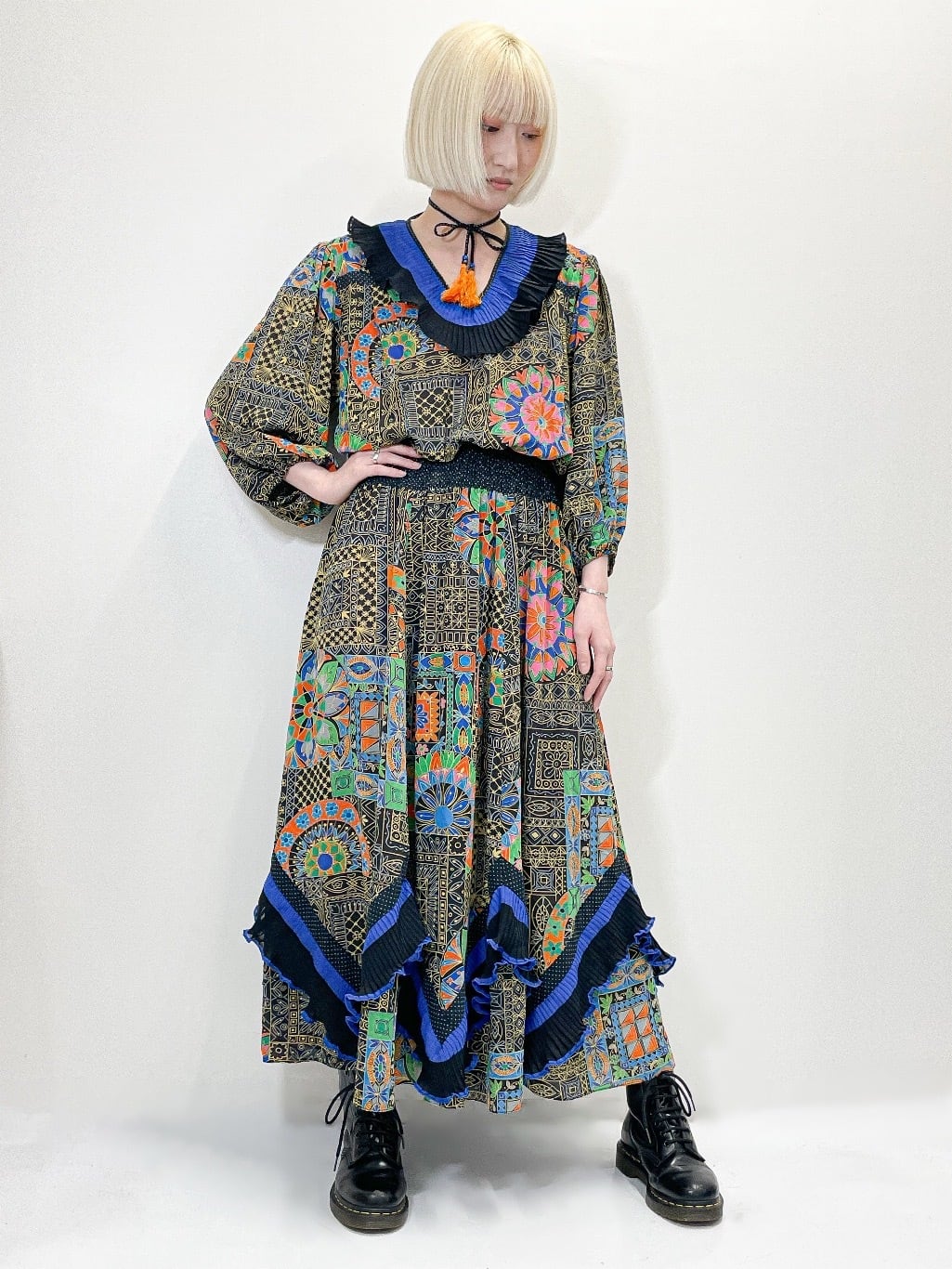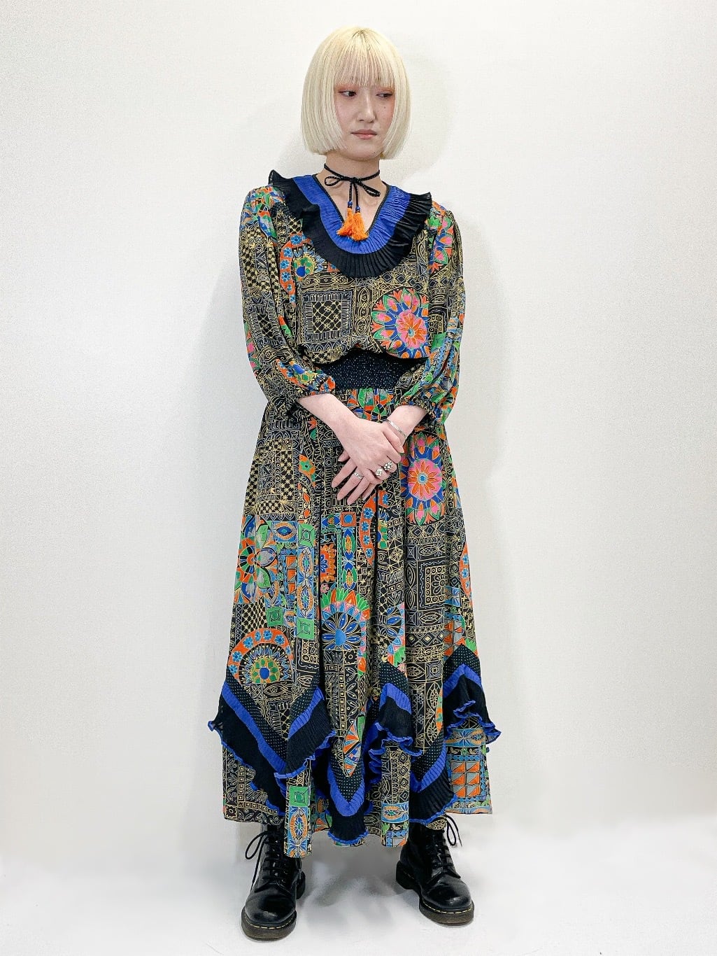 Diane Freisからの強い影響を感じる幾何学模様や、花のモチーフを組み合わせた大胆な総柄は抜群のインパクトです。
