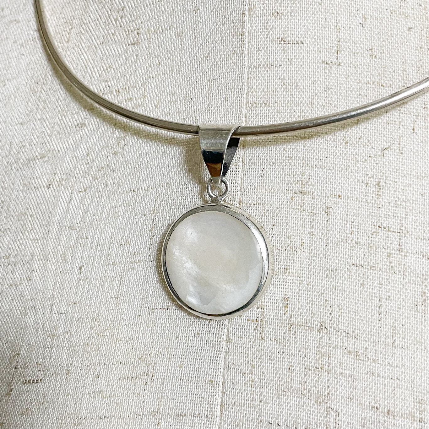 ラウンド型のトップに白蝶貝がセットされた、やわらかな白蝶貝の光沢が胸元で上品に輝きます。