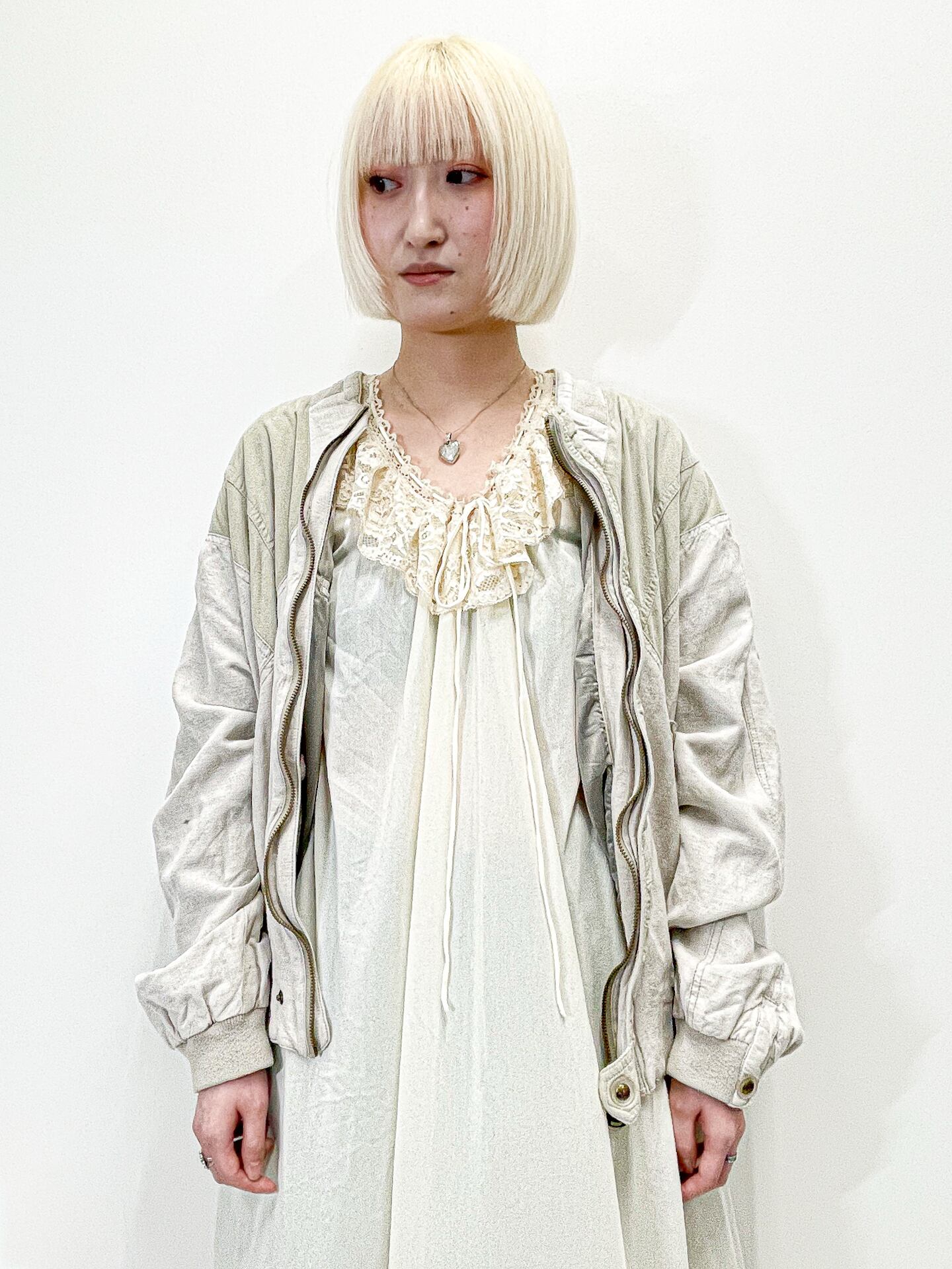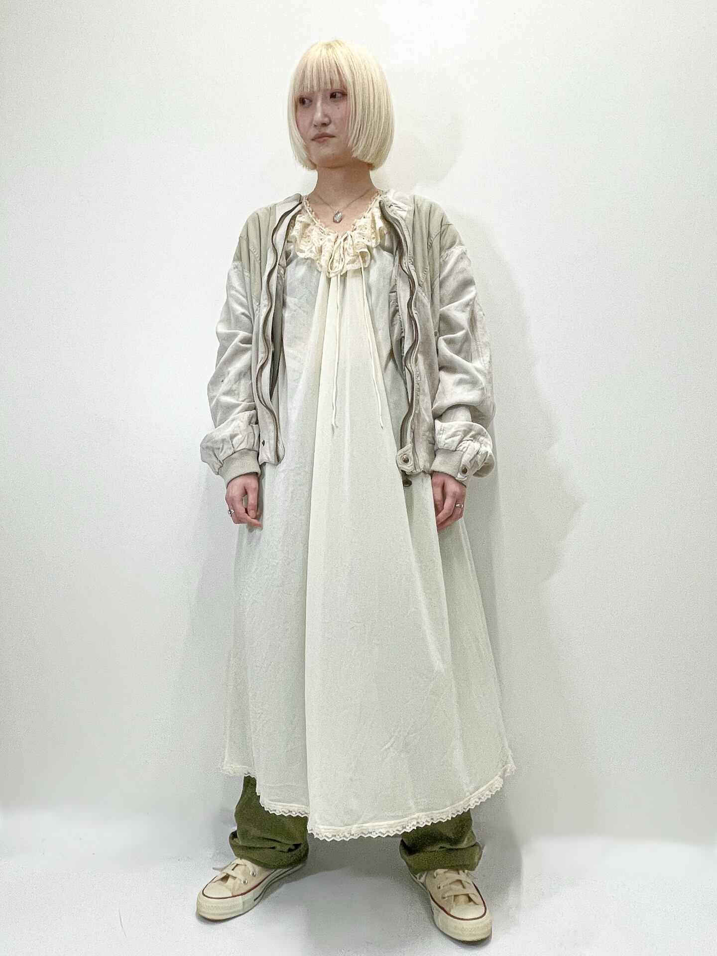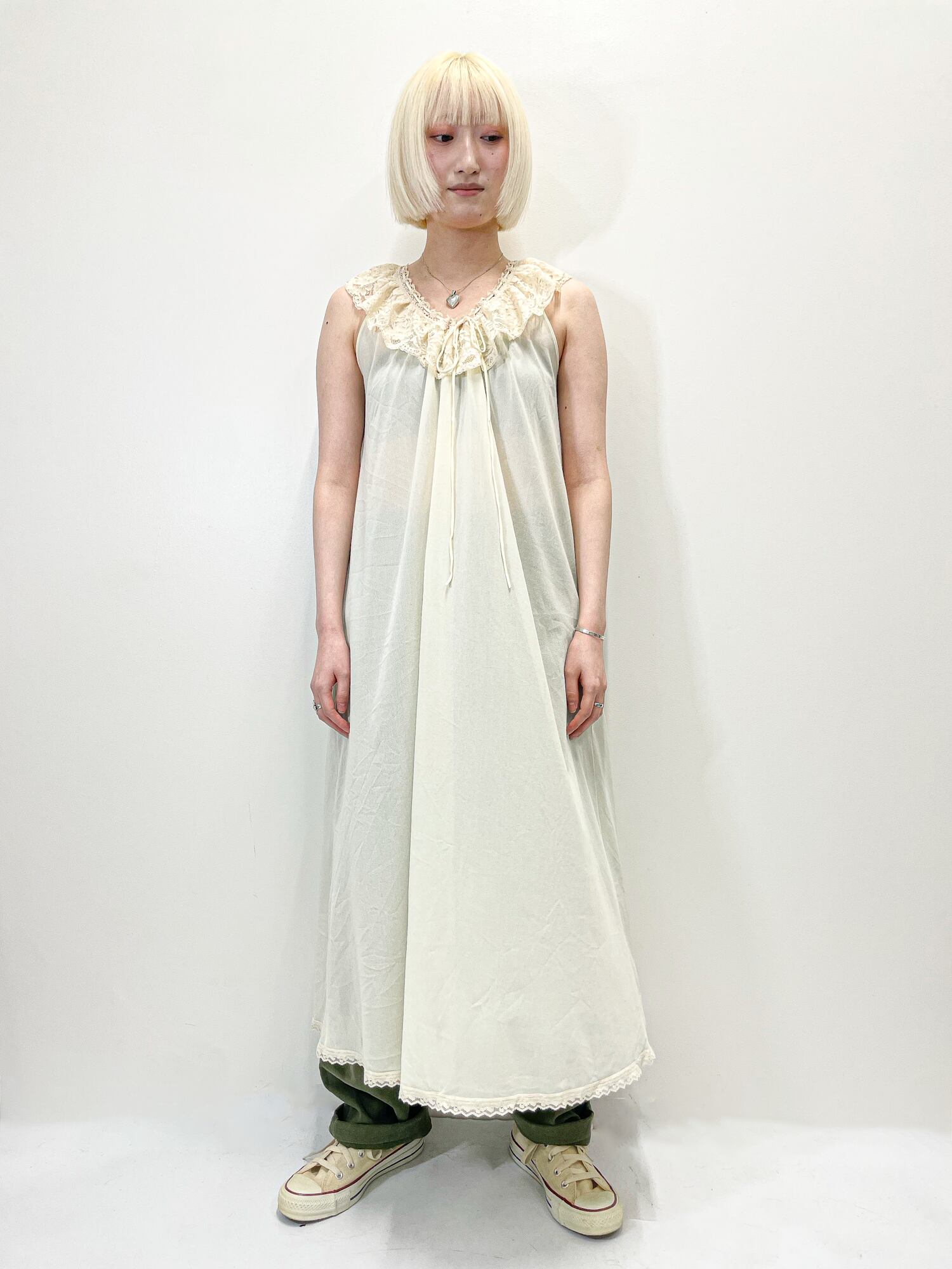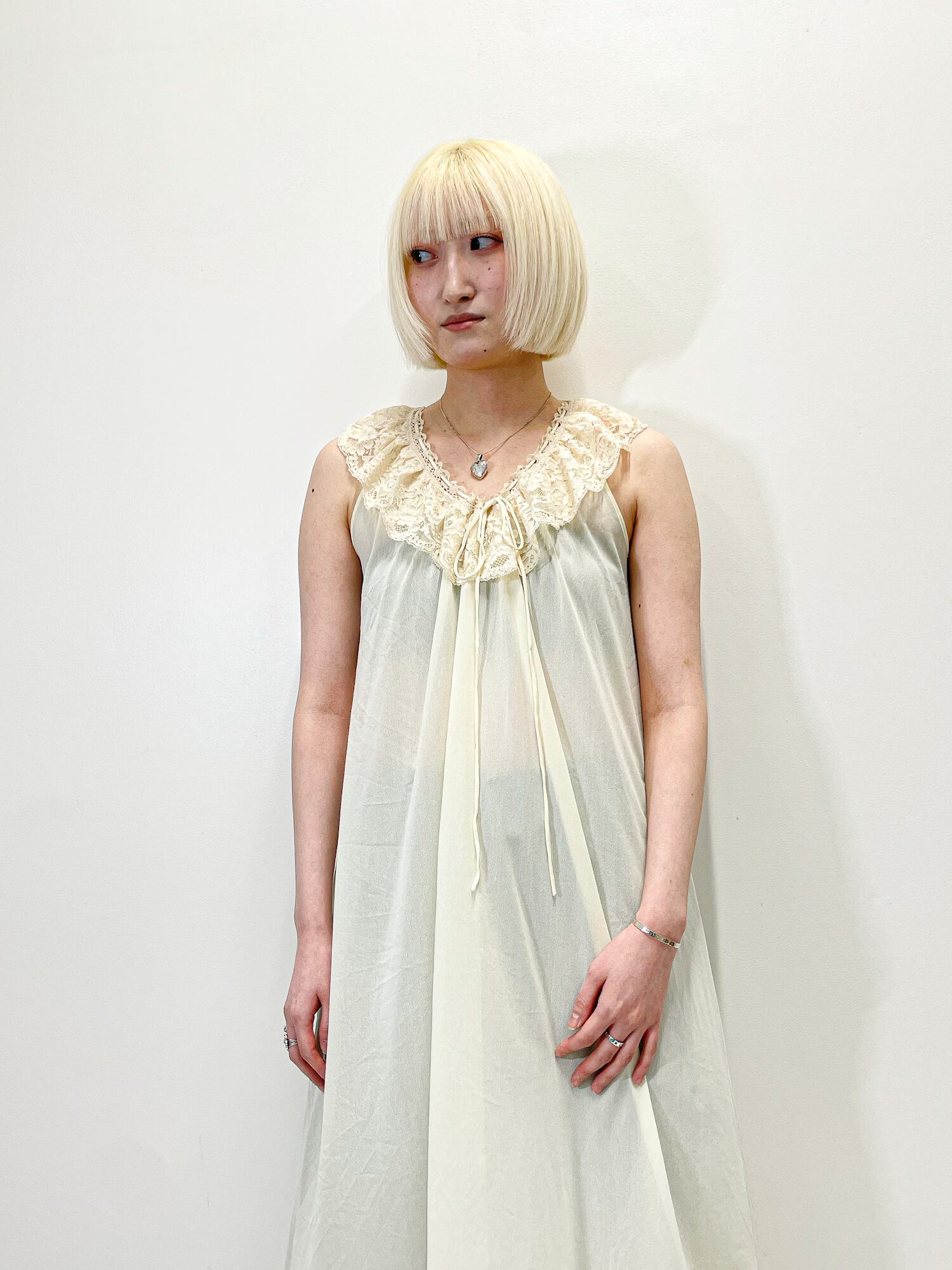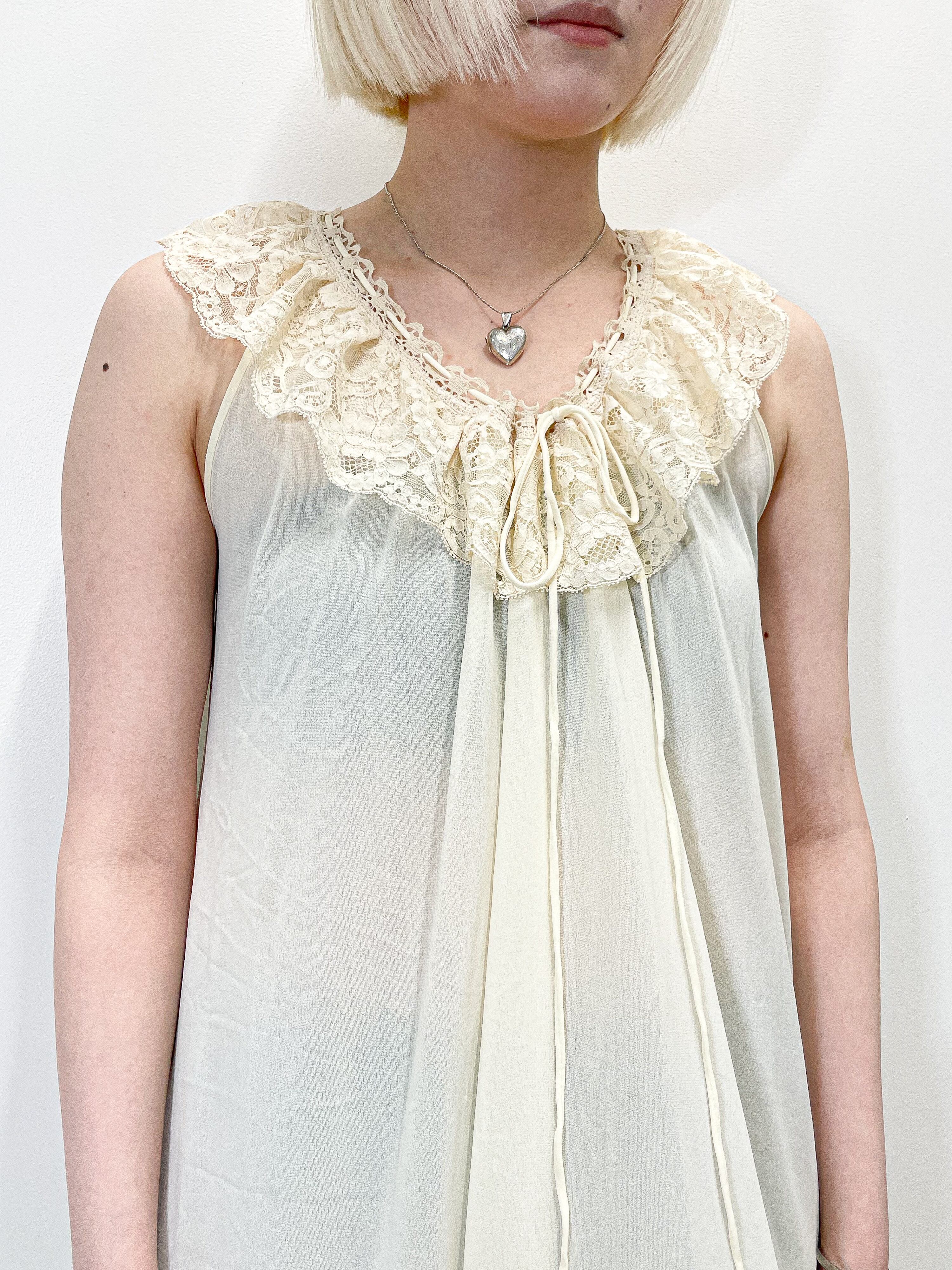 襟元と裾には上品なレースがあしらわれ、柔らかく女性らしい印象です。。