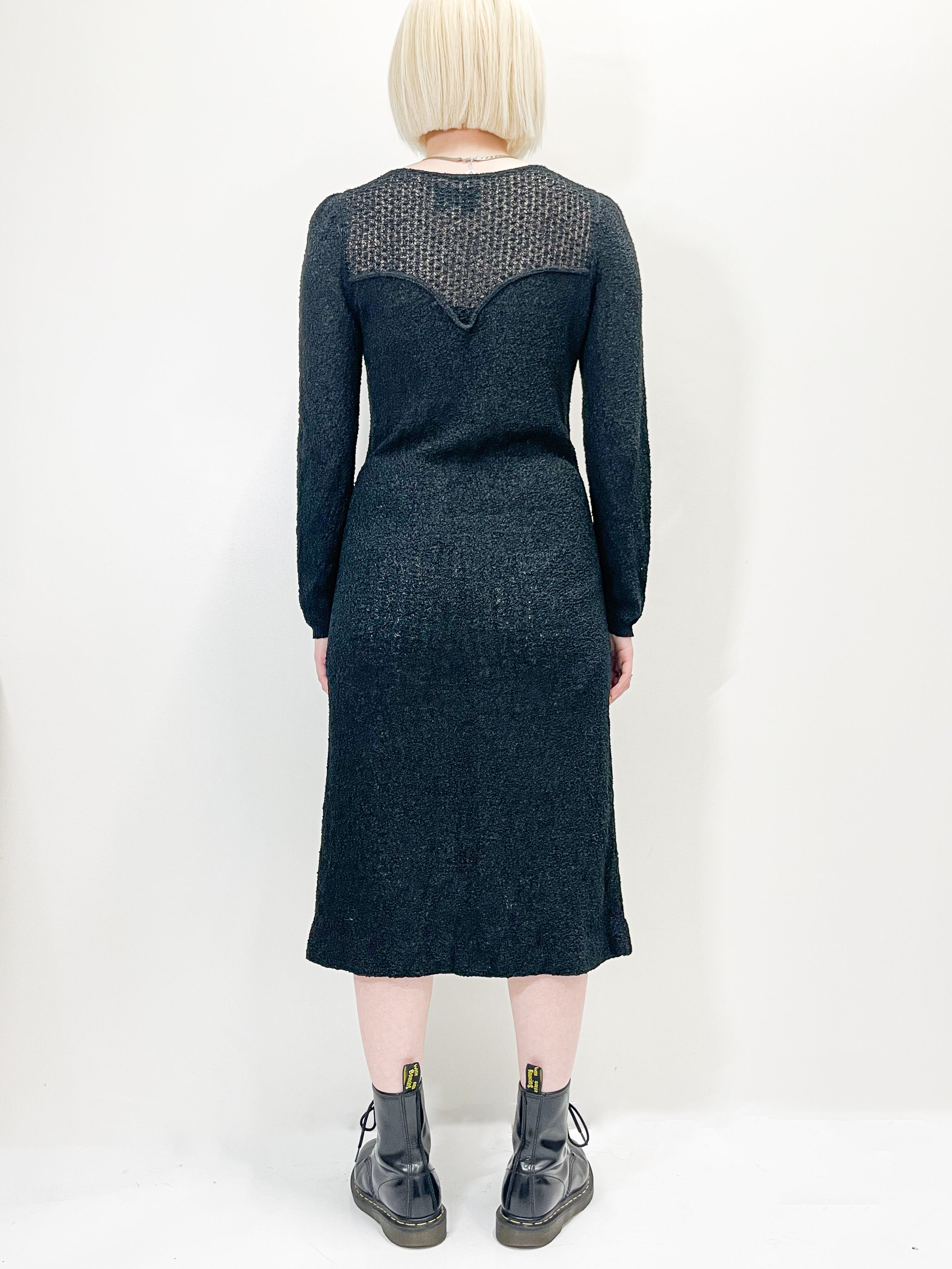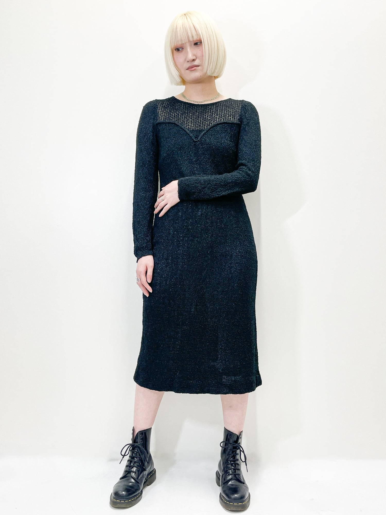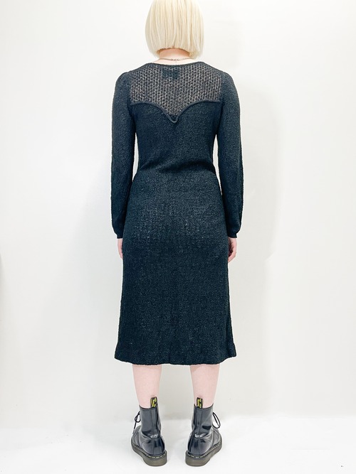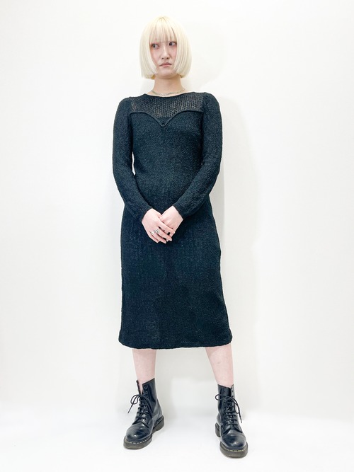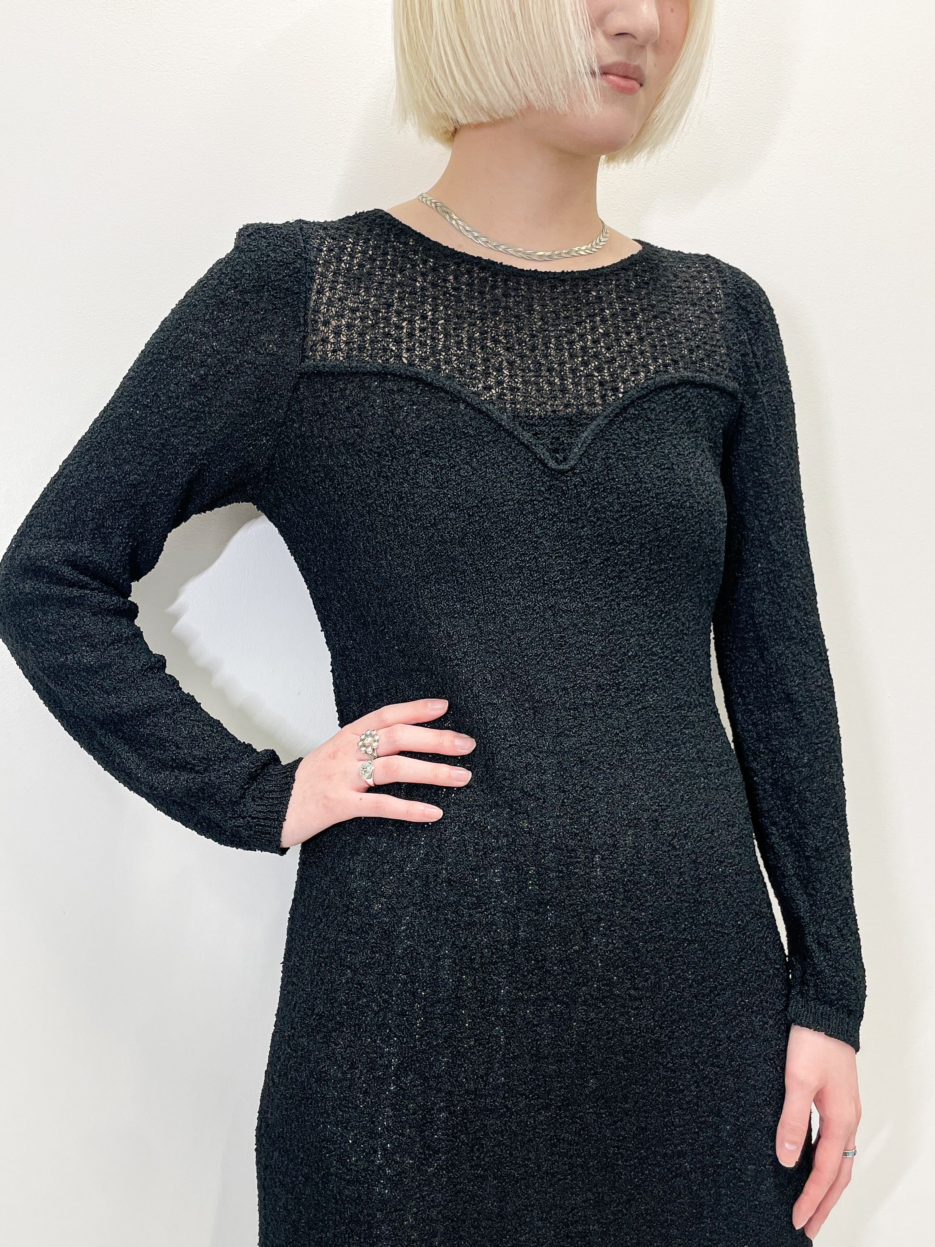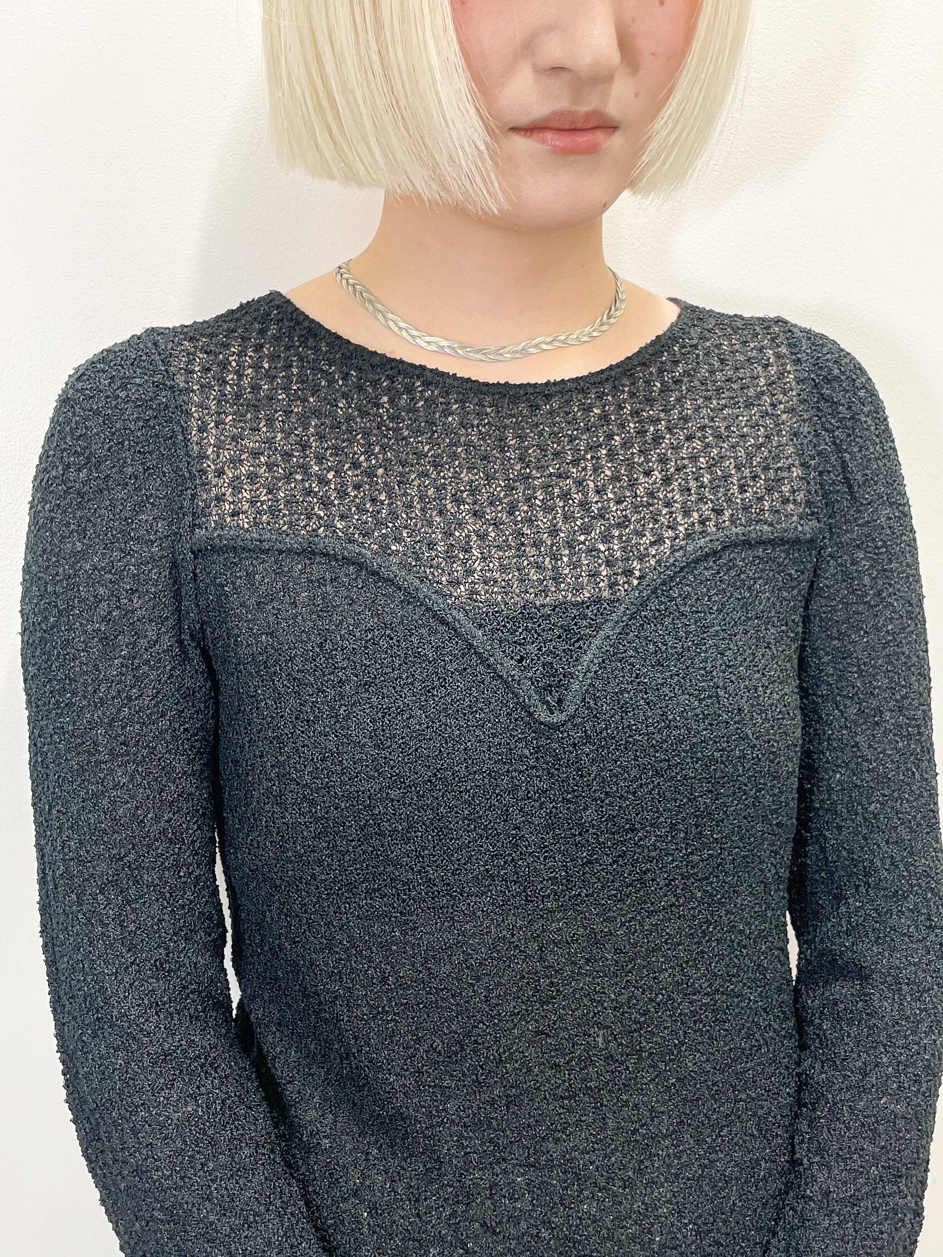 胸元は緩やかなカーブの切り替えになっており、首元からデコルテにかけて編みの変化による透け感がございます。