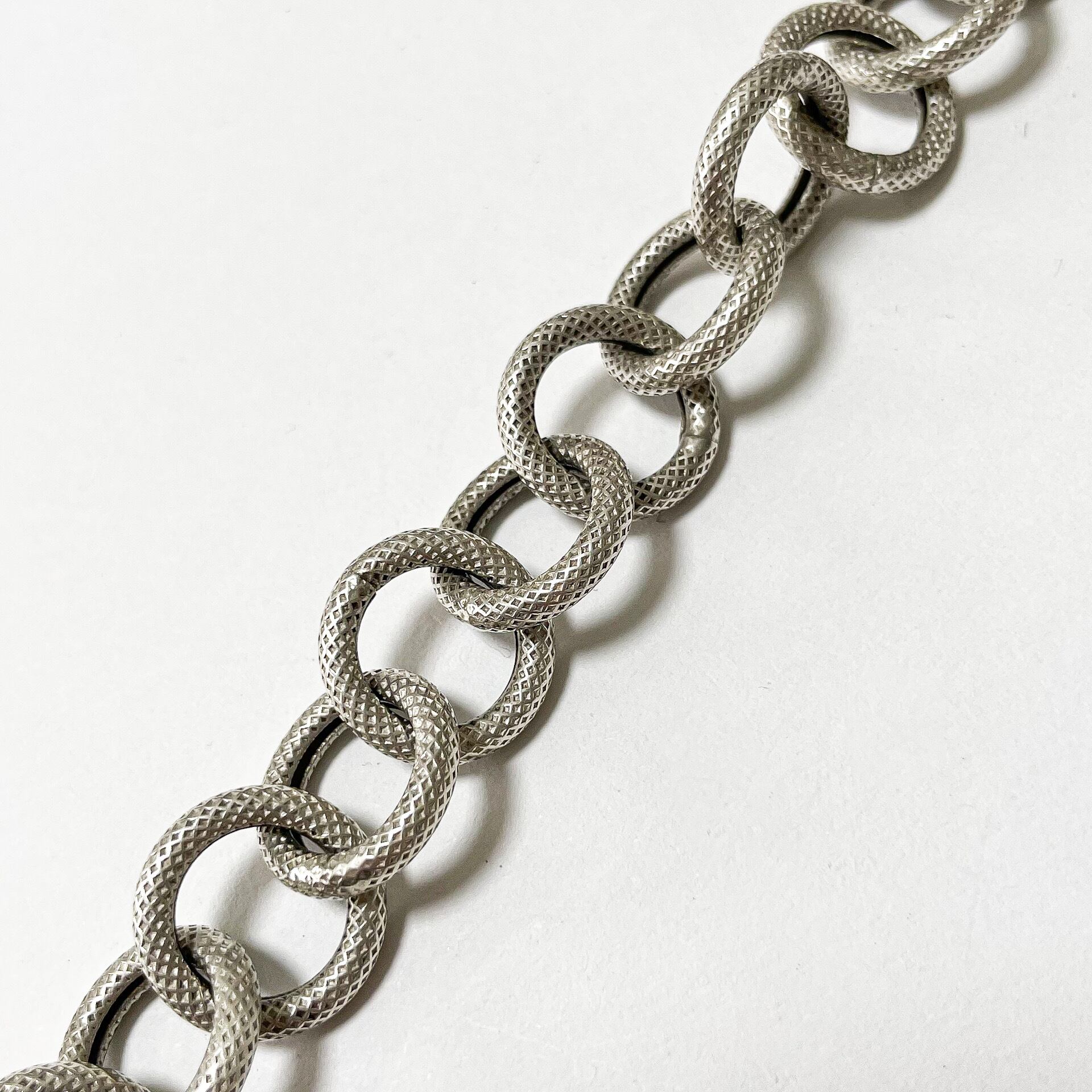 細かい菱形の凹凸が表面に施された表情豊かなラウンドチェーンは、繊細なテクスチャーが光を細かく反射し単調になりがちなチェーンに奥行きと陰影を与えています。
