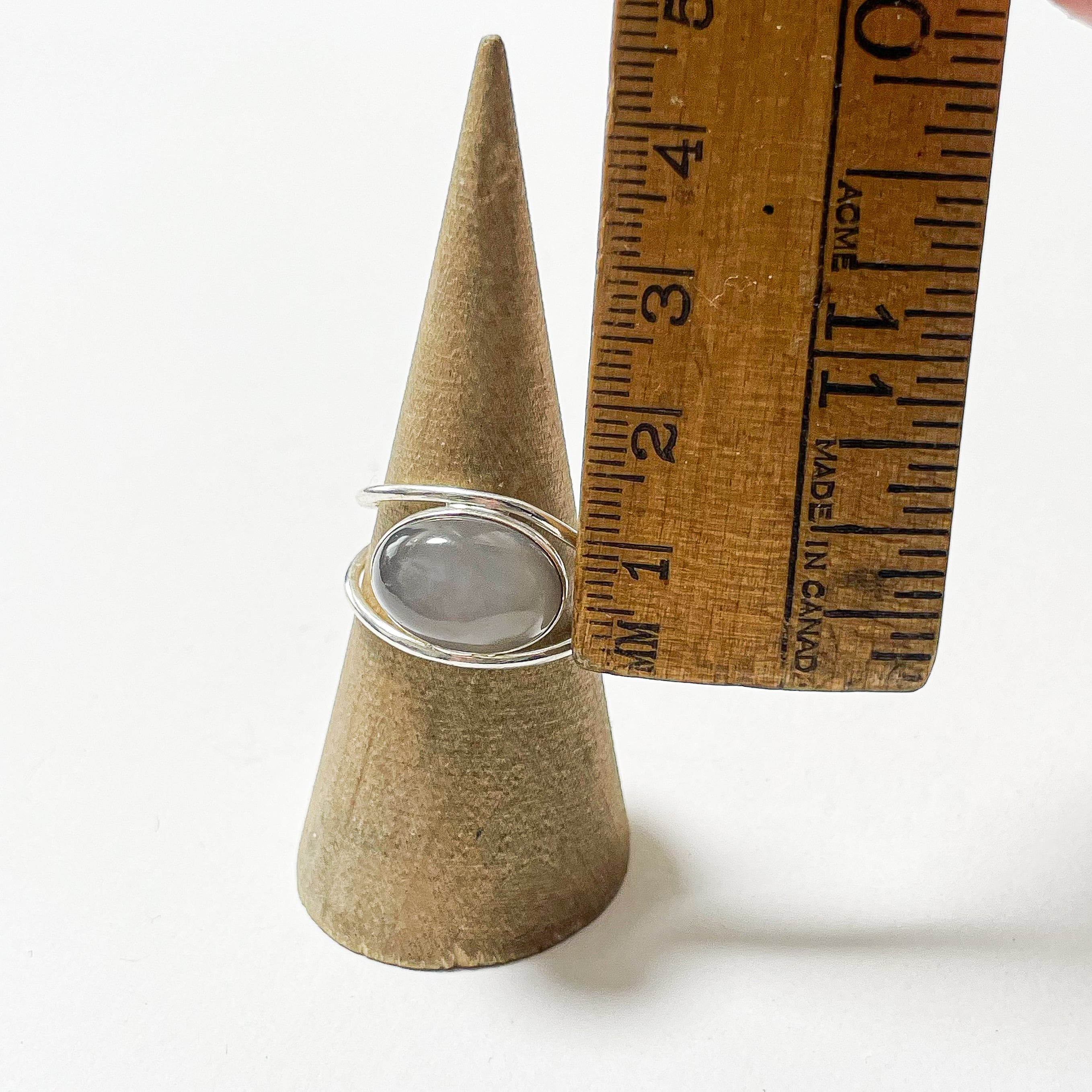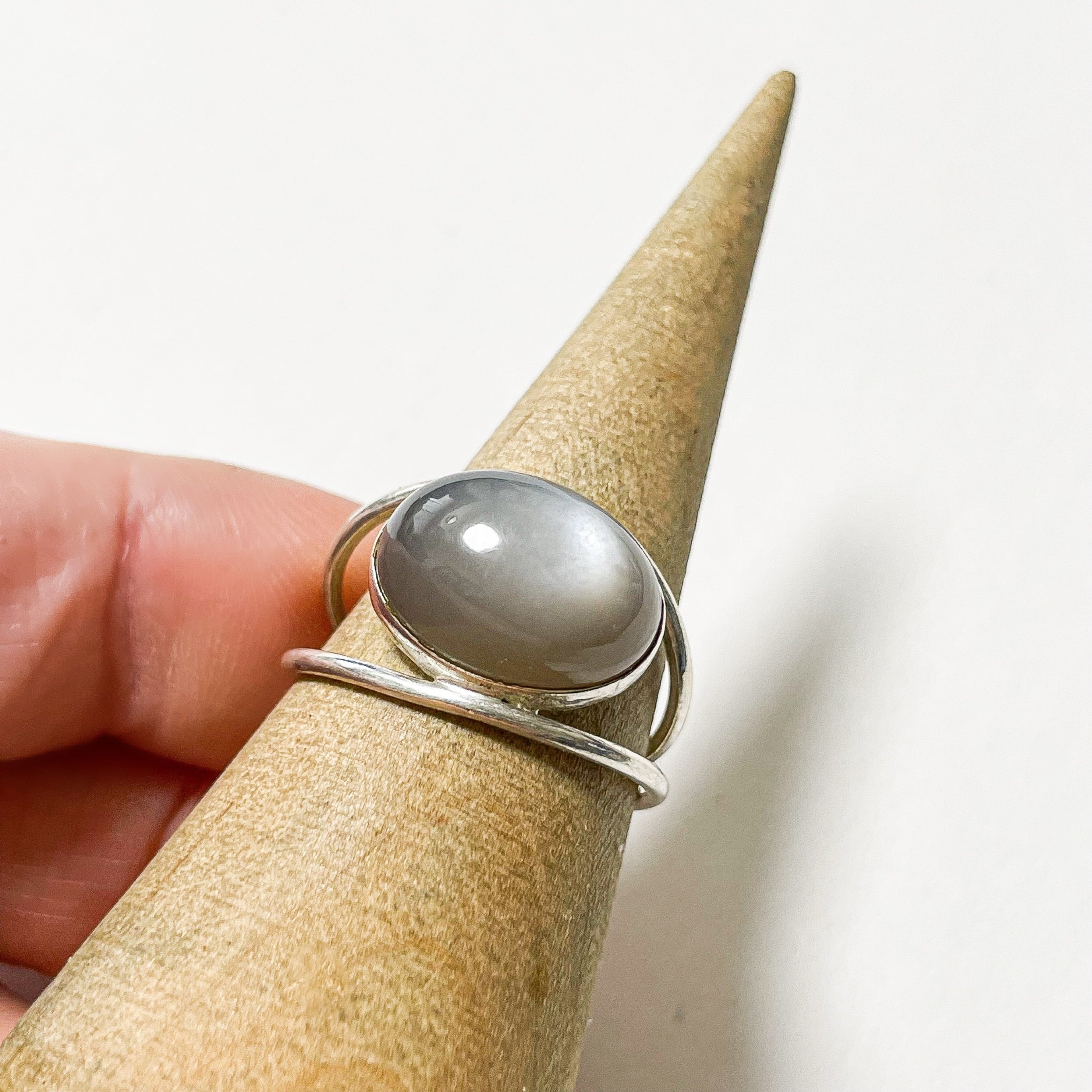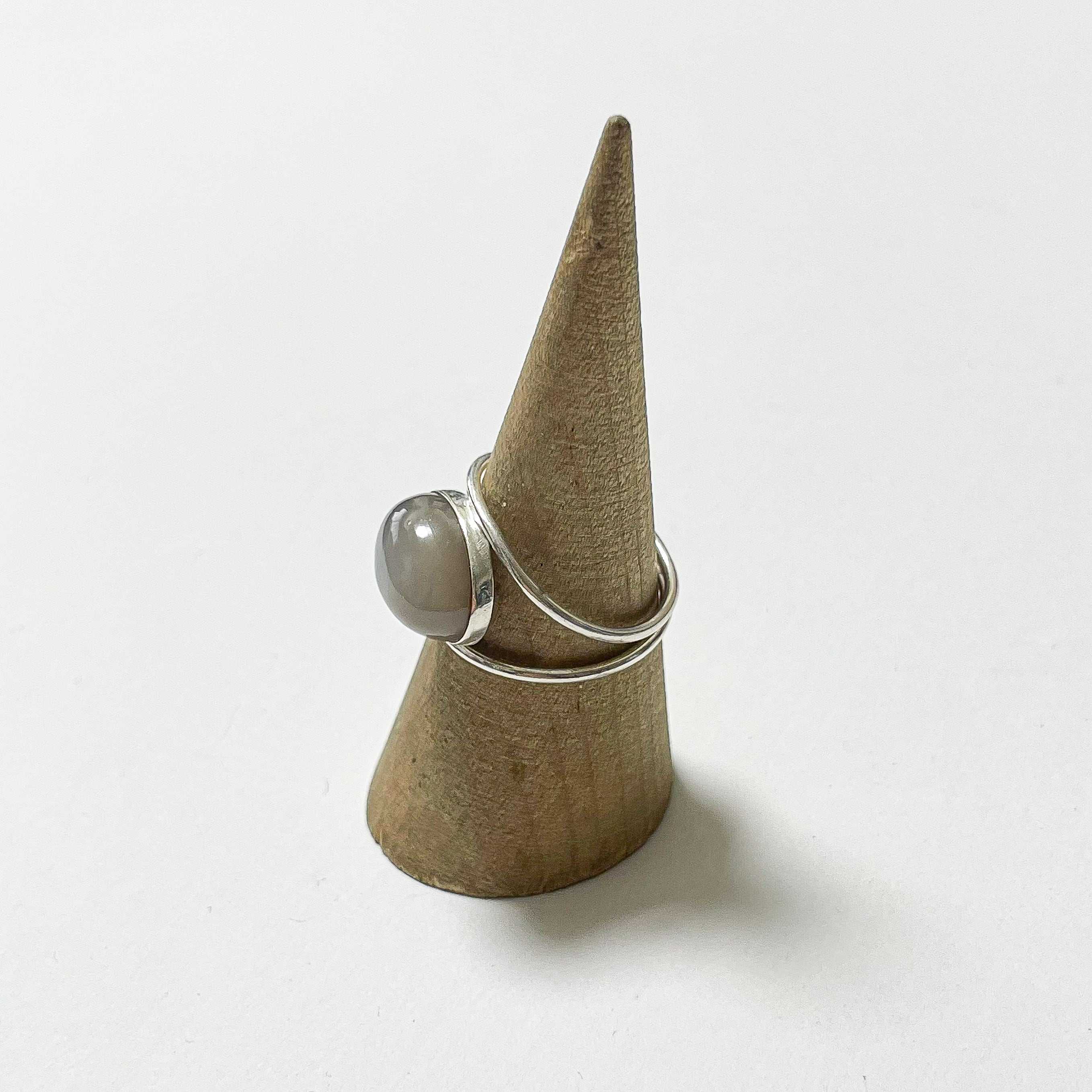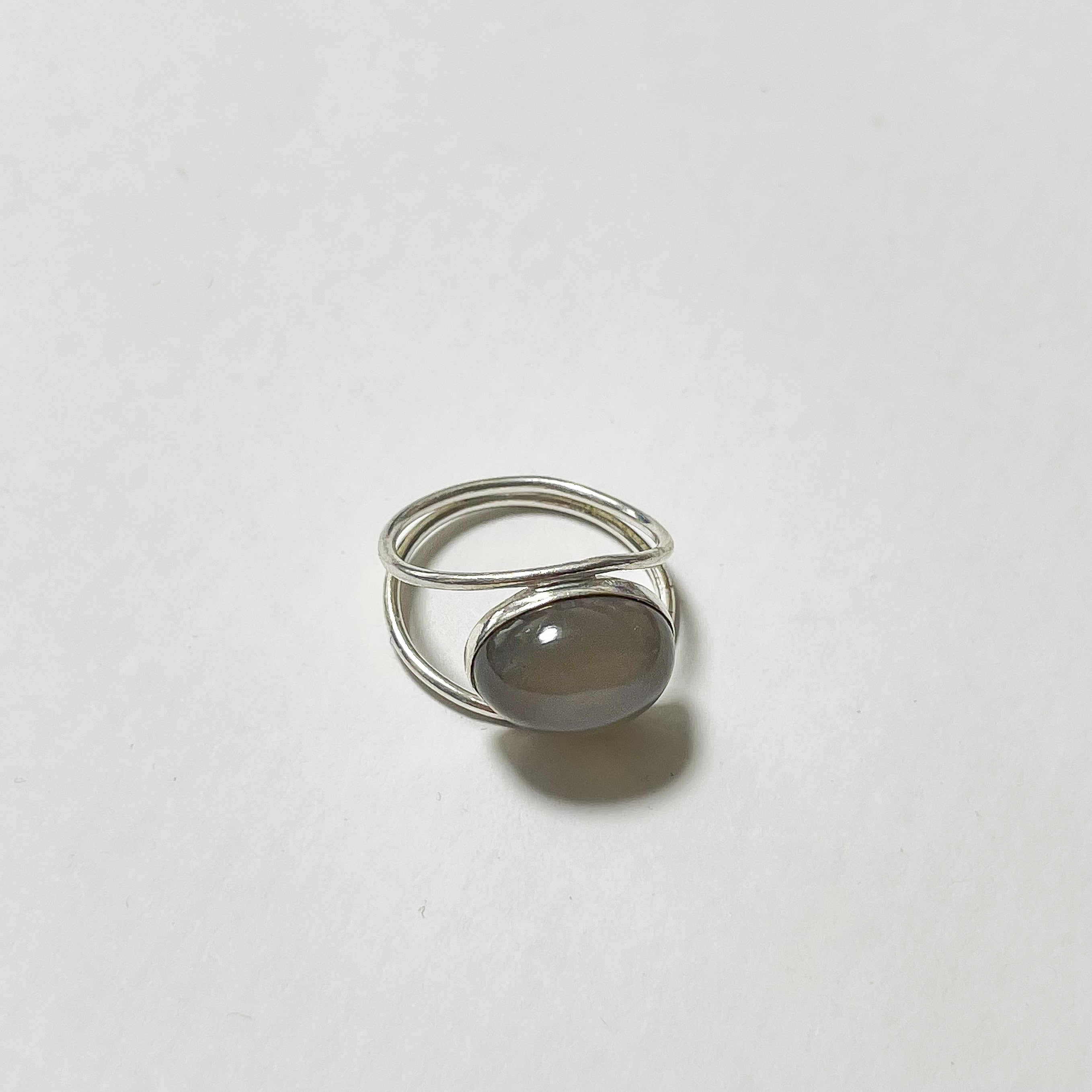 柔らかな光を内側に宿すグレームーンストーンのカボションがセットされています。