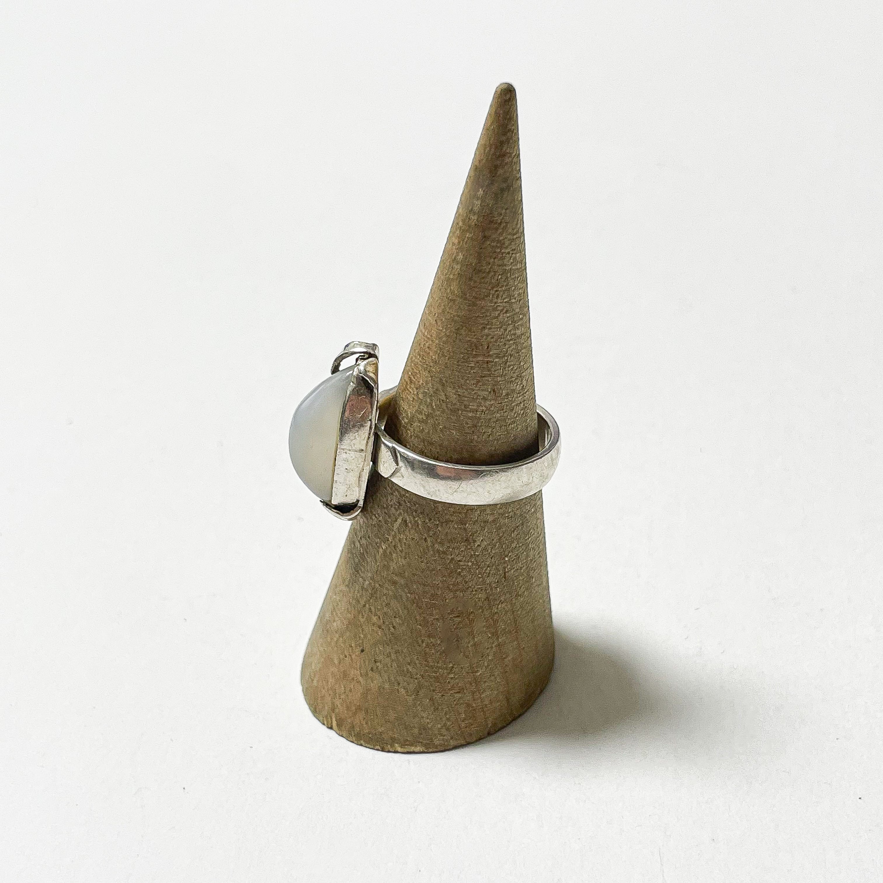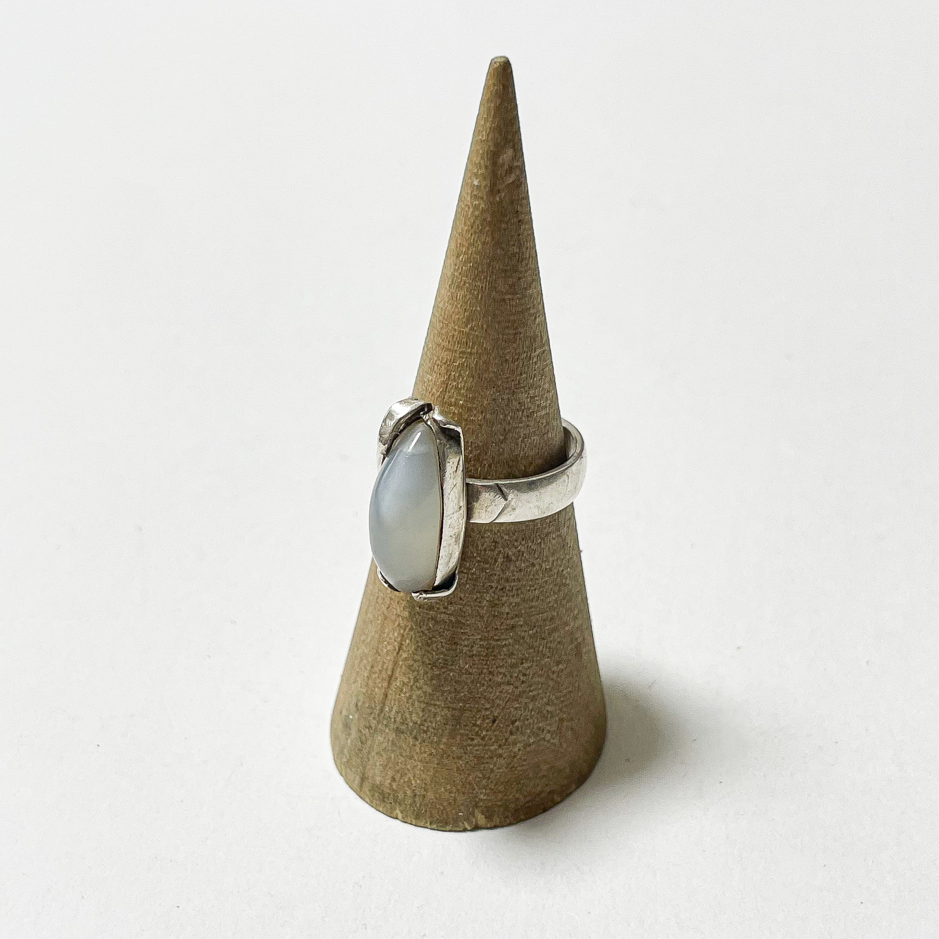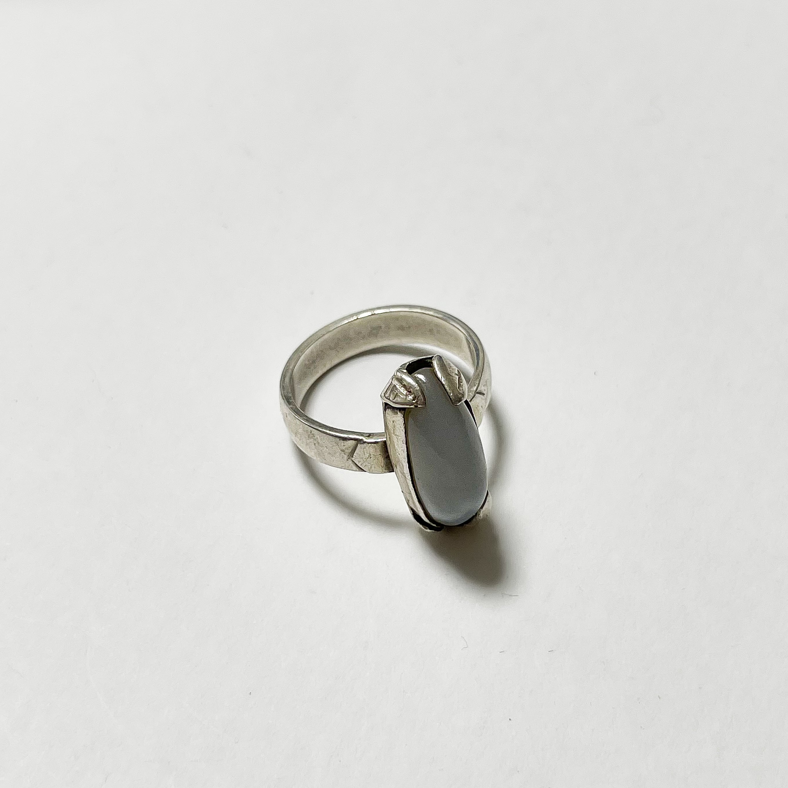 ムーンストーンのような表情を持つ樹脂のカボションがセットされた925シルバーのリングでです。 ムーンストーンのシラー効果のように角度によって柔らかく変化する色合いが美しく、縦長のフォルムが指をすっきりと見せてくれます。 刻印ございませんが925シルバーです。 Weight*約5.0g Size*約13号 Condition*特に目立つダメージや汚れはなく良い状態です。 あくまでUSEDですので神経質な方や新品の様なものをお求めの方はご購入をお控え下さいませ。