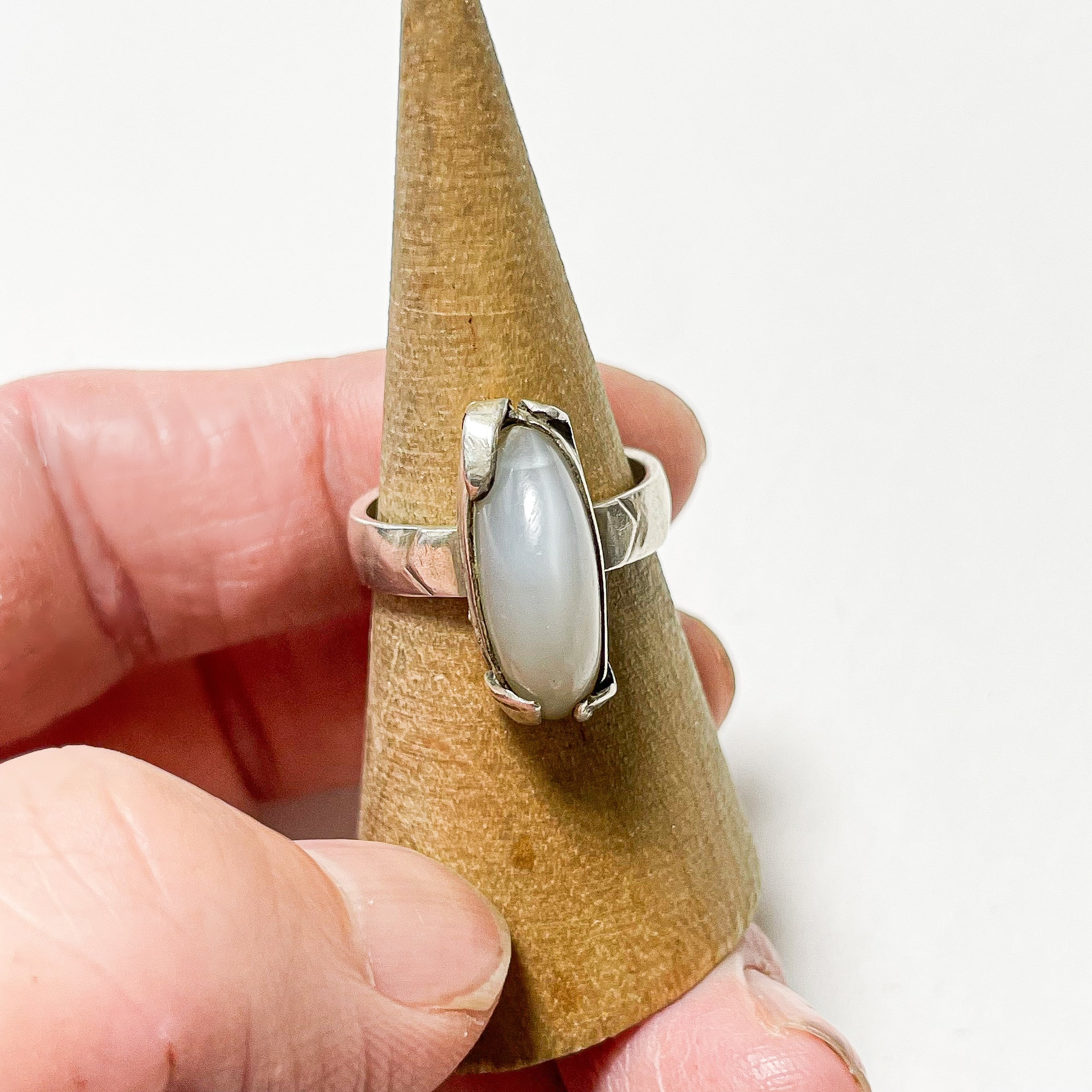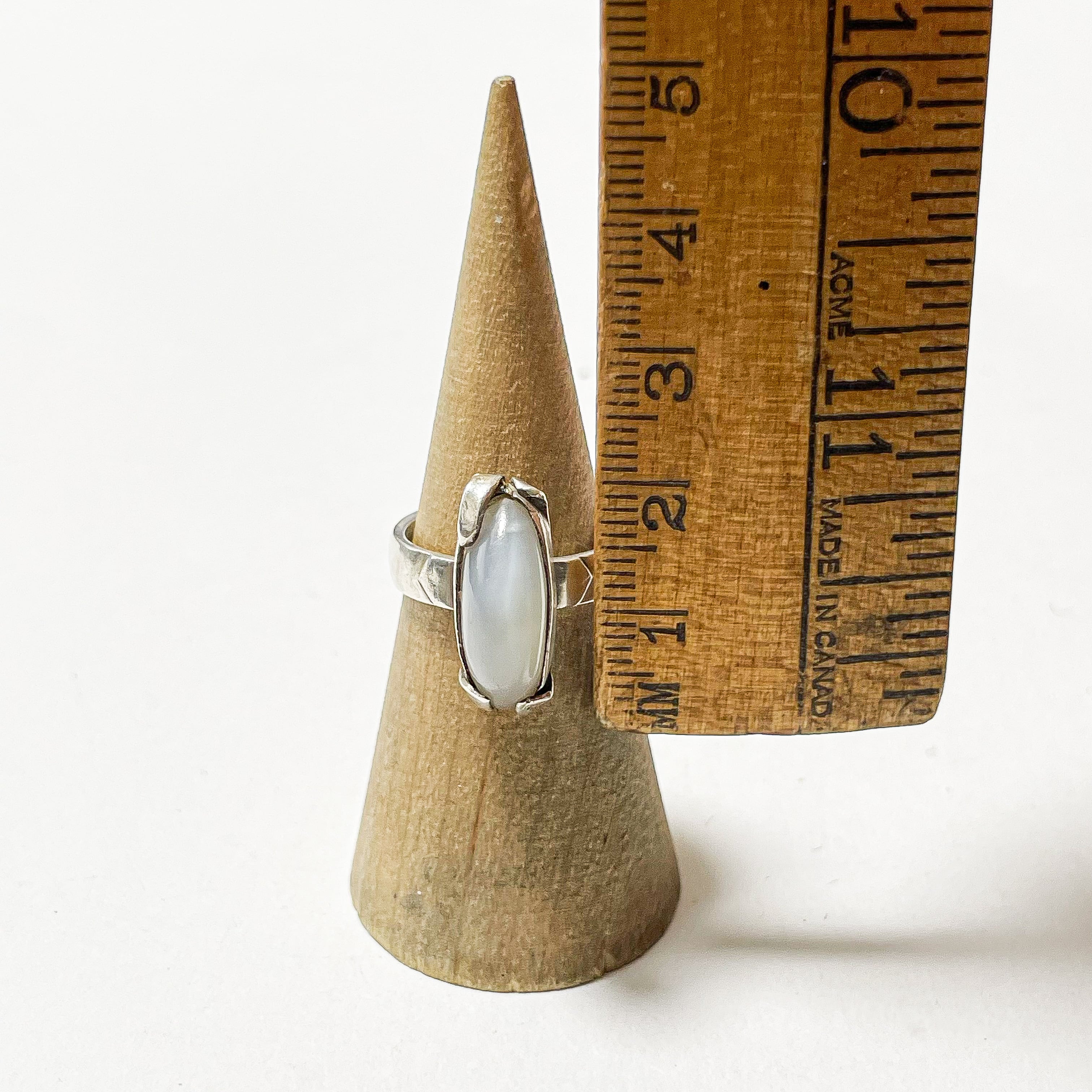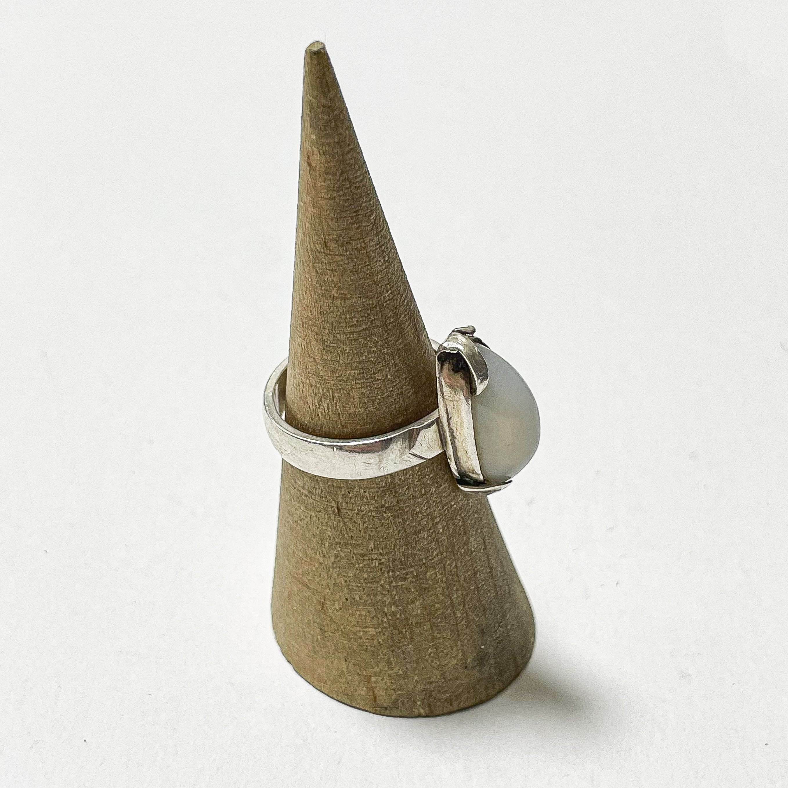 ムーンストーンのような表情を持つ樹脂のカボションがセットされた925シルバーのリングでです。 ムーンストーンのシラー効果のように角度によって柔らかく変化する色合いが美しく、縦長のフォルムが指をすっきりと見せてくれます。 刻印ございませんが925シルバーです。 Weight*約5.0g Size*約13号 Condition*特に目立つダメージや汚れはなく良い状態です。 あくまでUSEDですので神経質な方や新品の様なものをお求めの方はご購入をお控え下さいませ。
