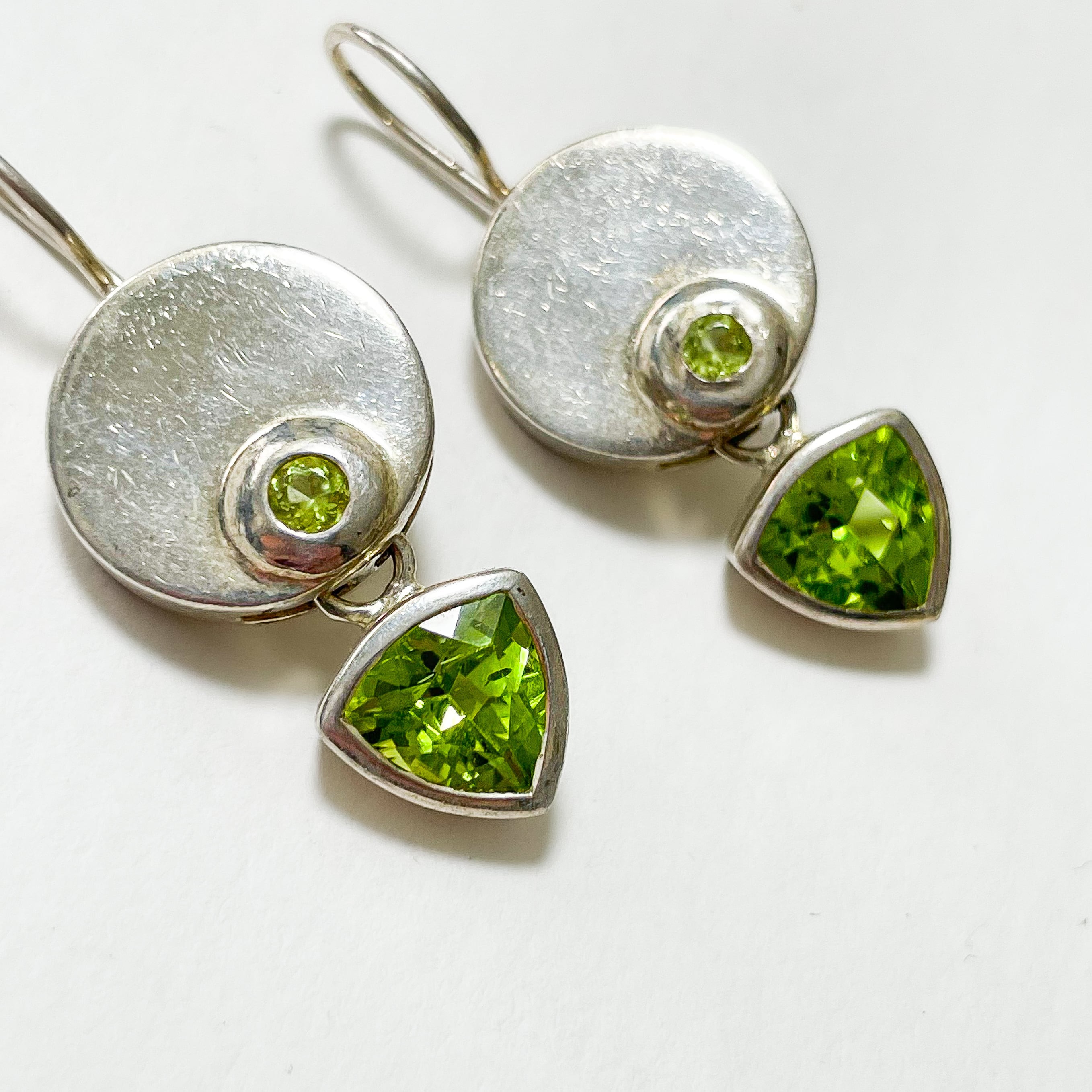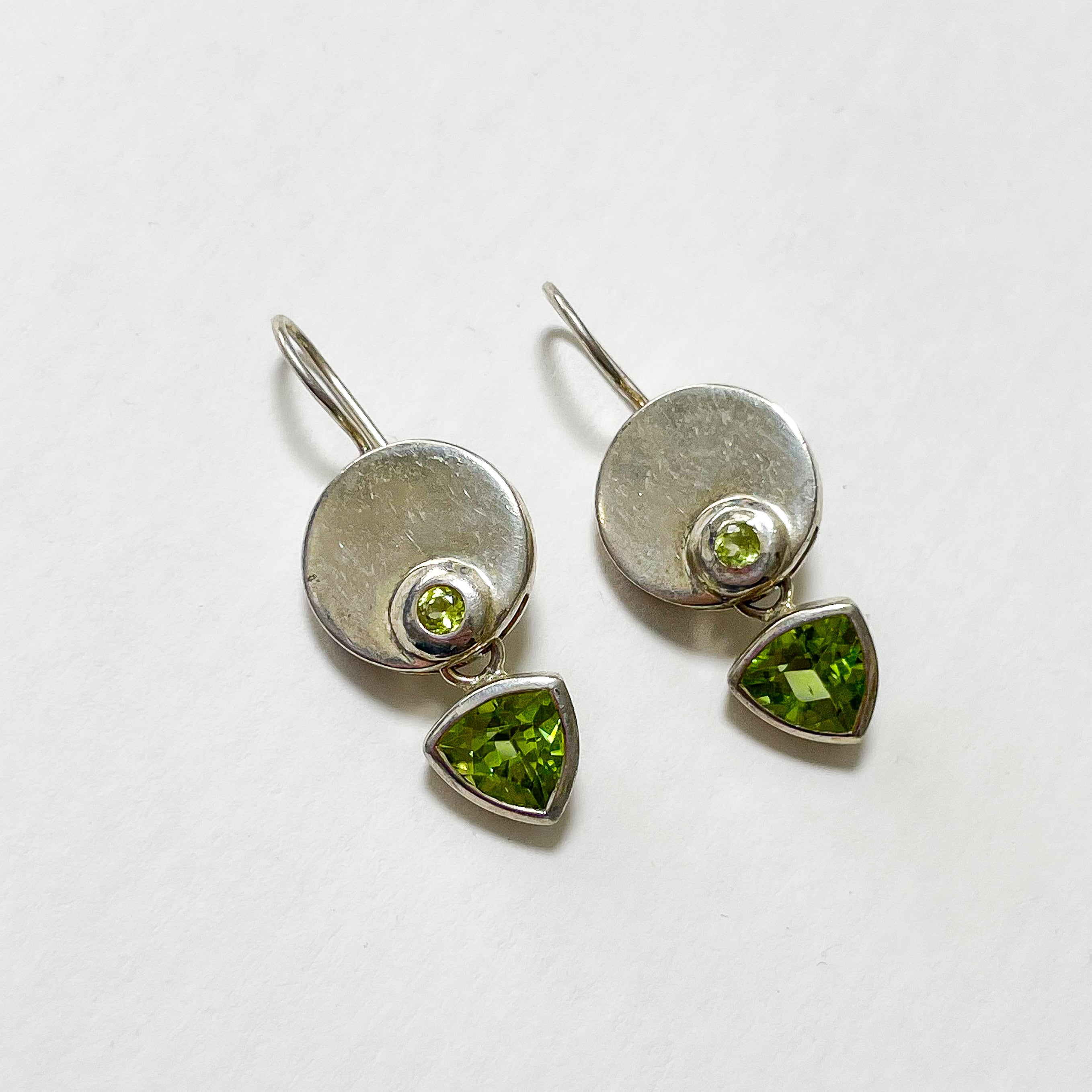 透明感のあるペリドットのルースは裏取りが施されており、光をしっかりと取り込むことでよりクリアな発色を引き出す作りになっています。ポストに925 INDIAの刻印が確認できます。