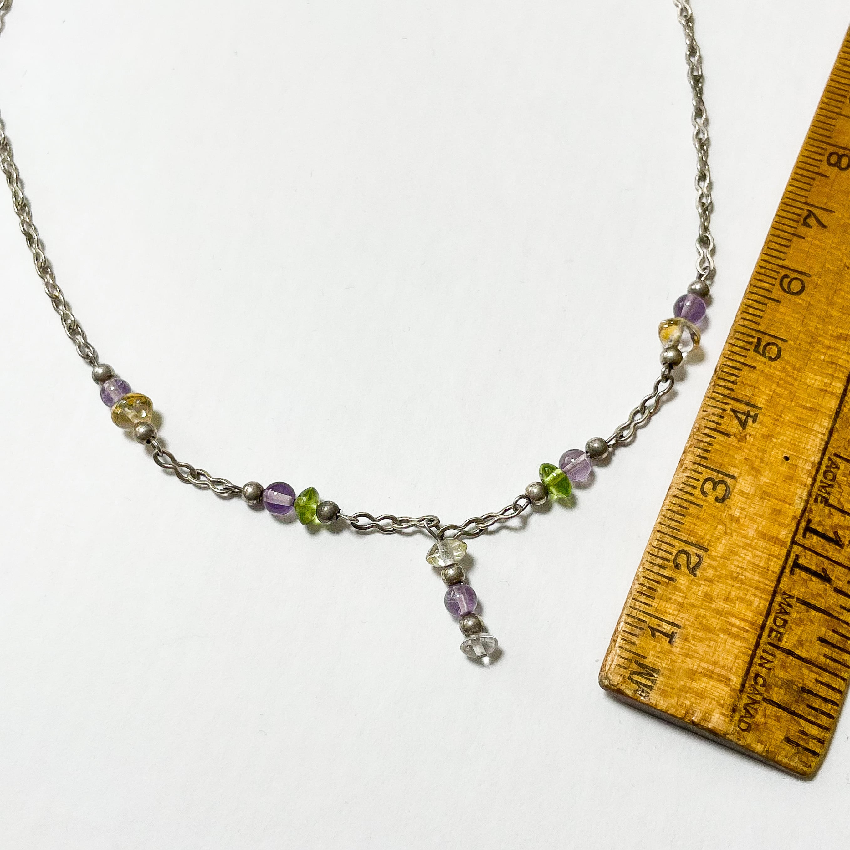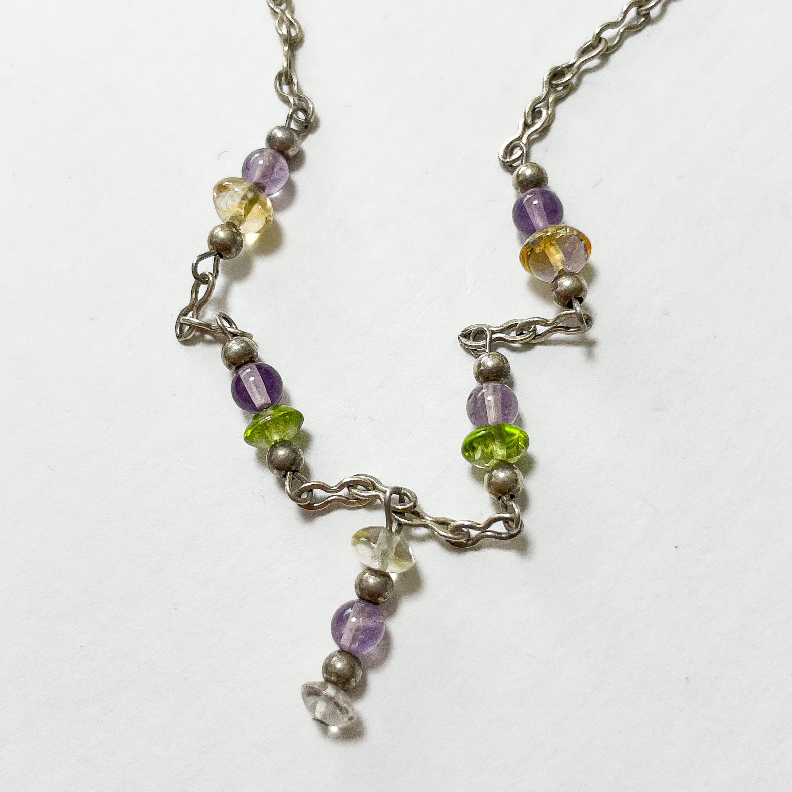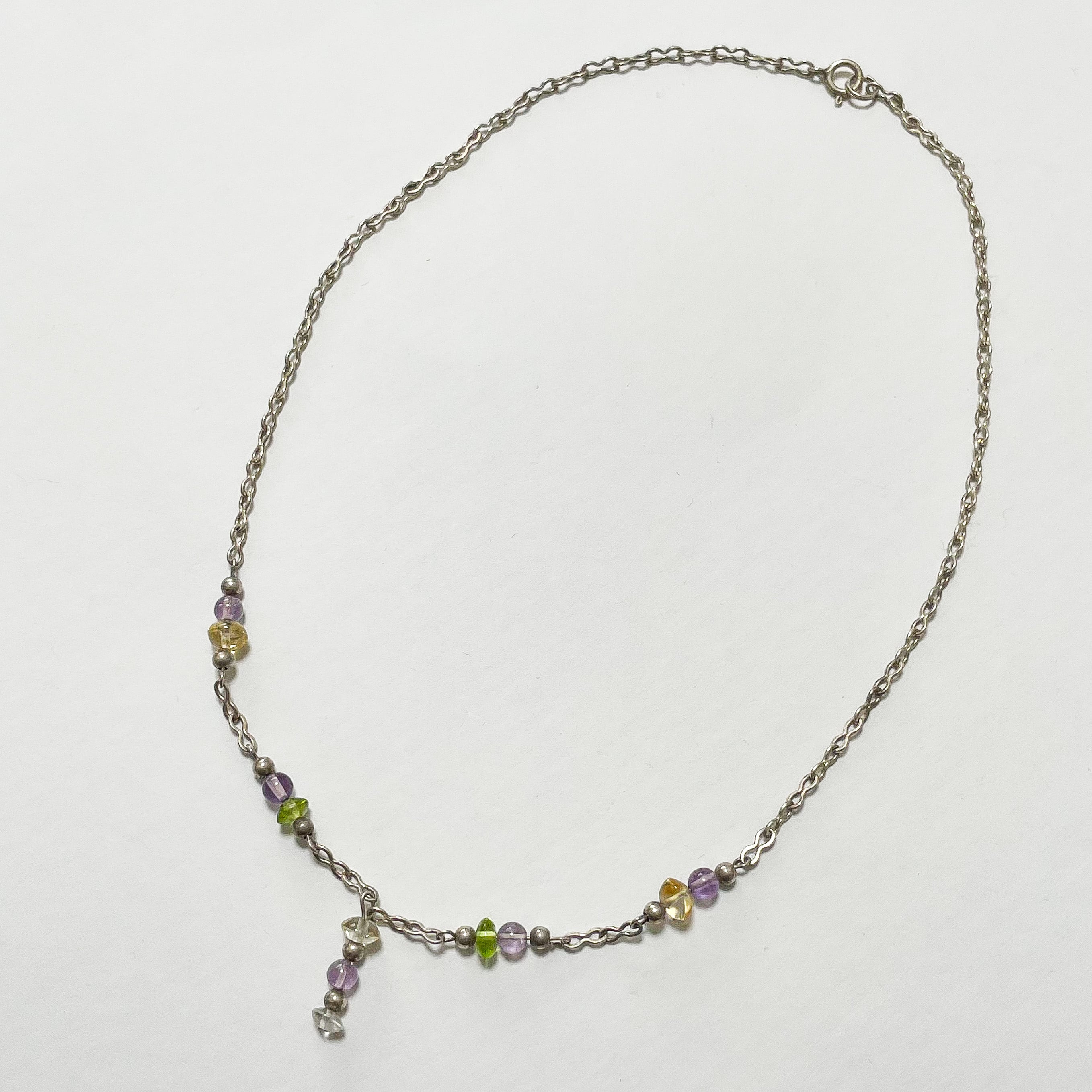 ペリドット、アメジストのパープル、クォーツと、異なるトーンの天然石をバランスよく連ねた925シルバーのビーズネックレスです。