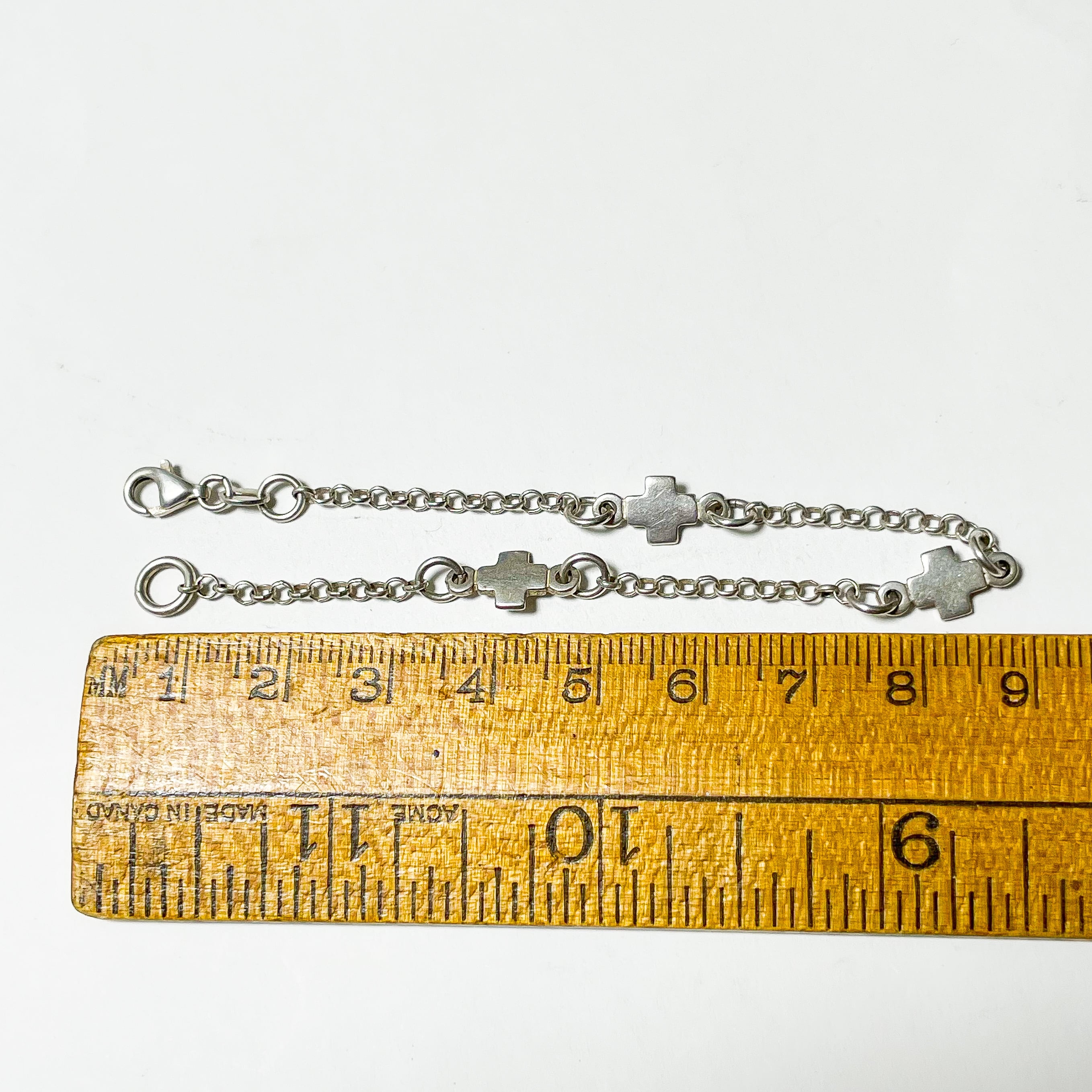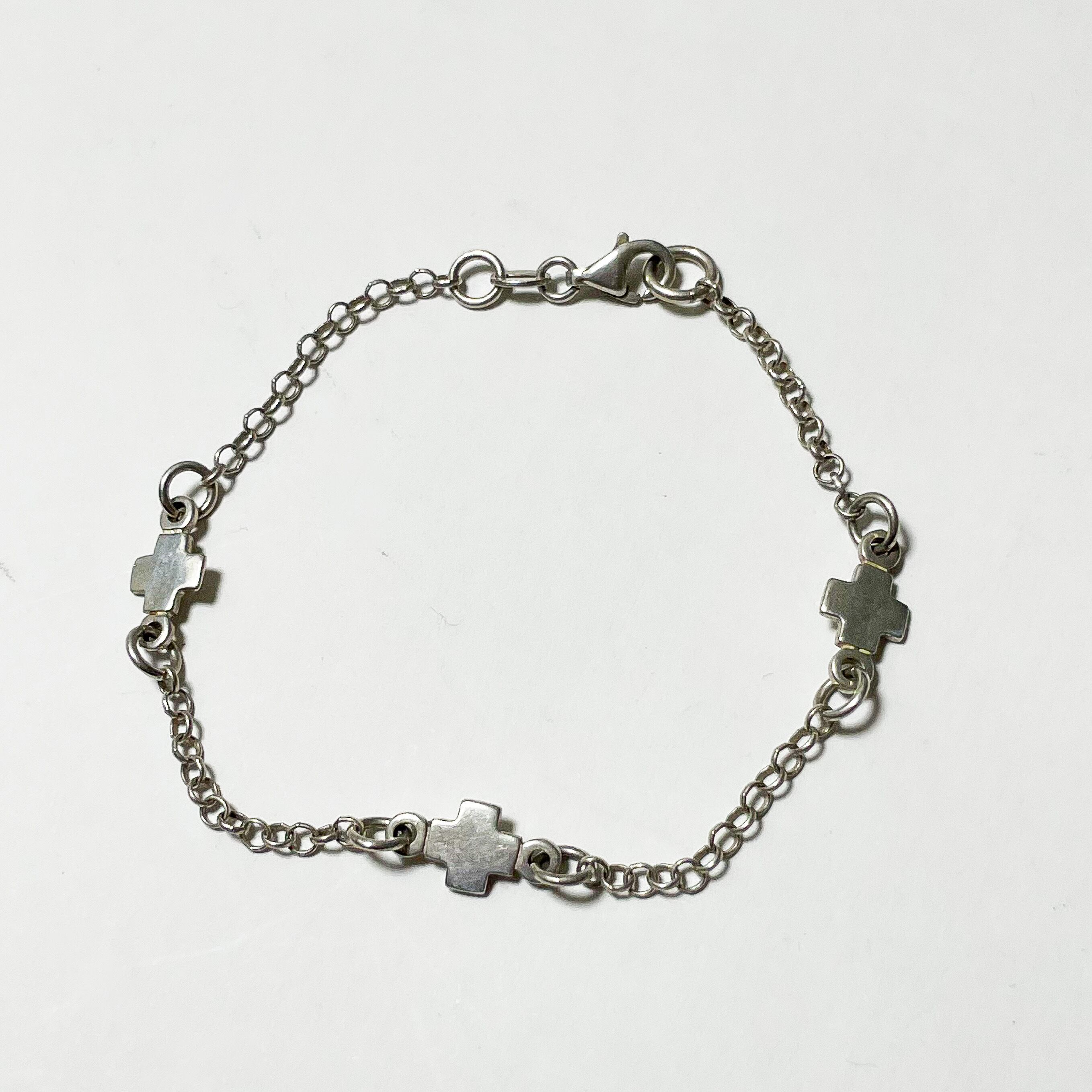 華奢なチェーンに小さなクロスパーツが等間隔に配置されたデザインで、シンプルながら上品な印象の一本です。