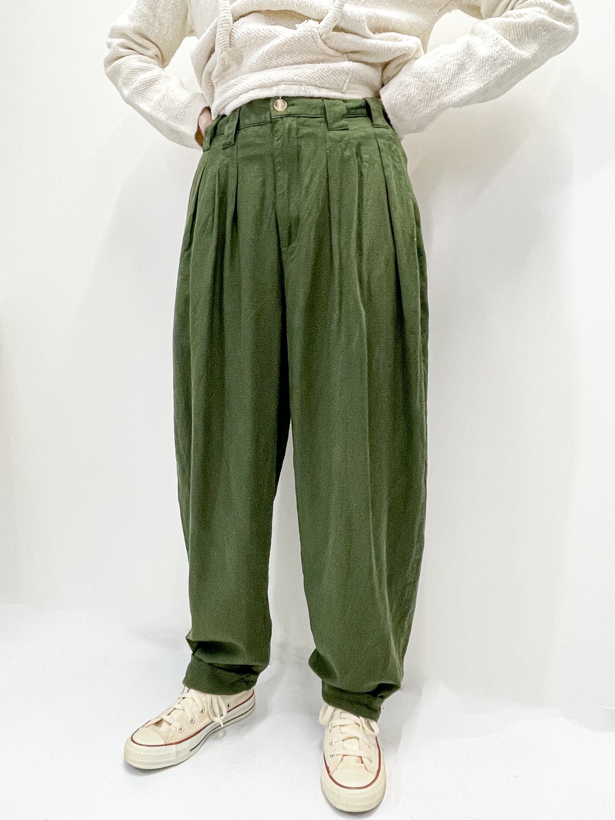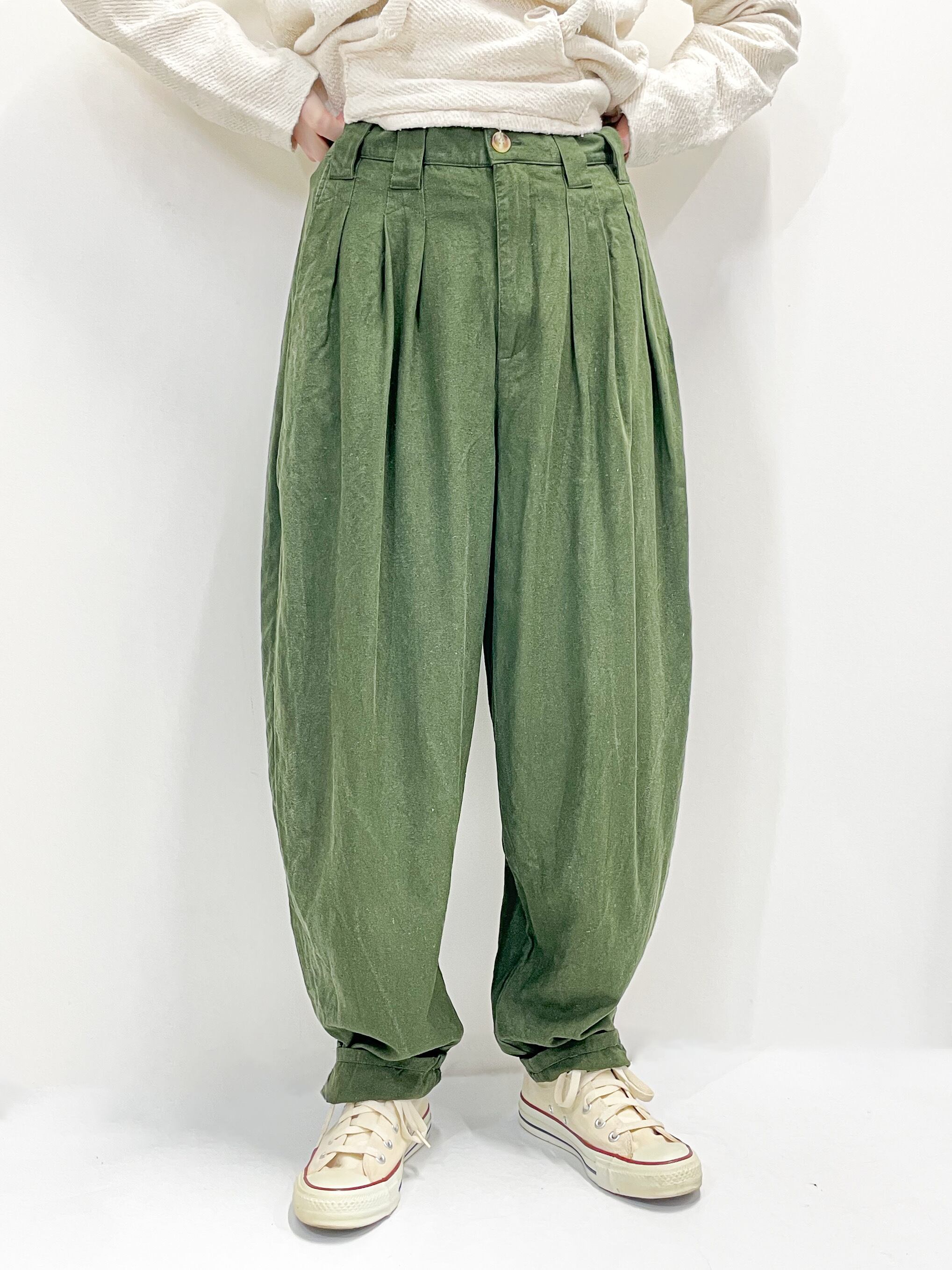 ウエストに施されたタックが腰回りに程よいゆとりを生み出し、裾に向かって程よくテーパードした丸みのある可愛らしいシルエットです。