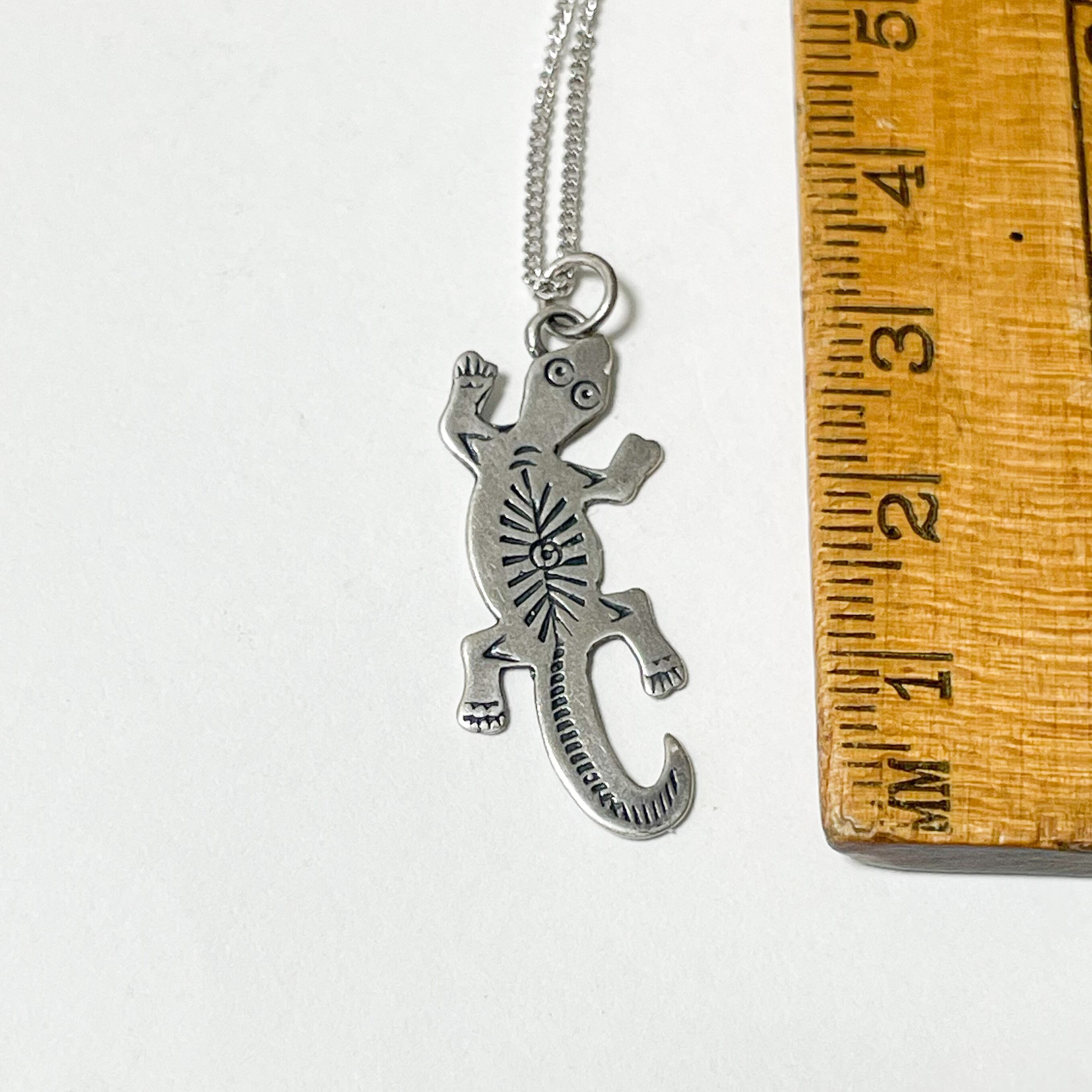トカゲの体には、ネイティブジュエリーらしいスタンプワークによる装飾が施されており、シンプルな中にも手仕事ならではの表情が感じられる仕上がりです。
