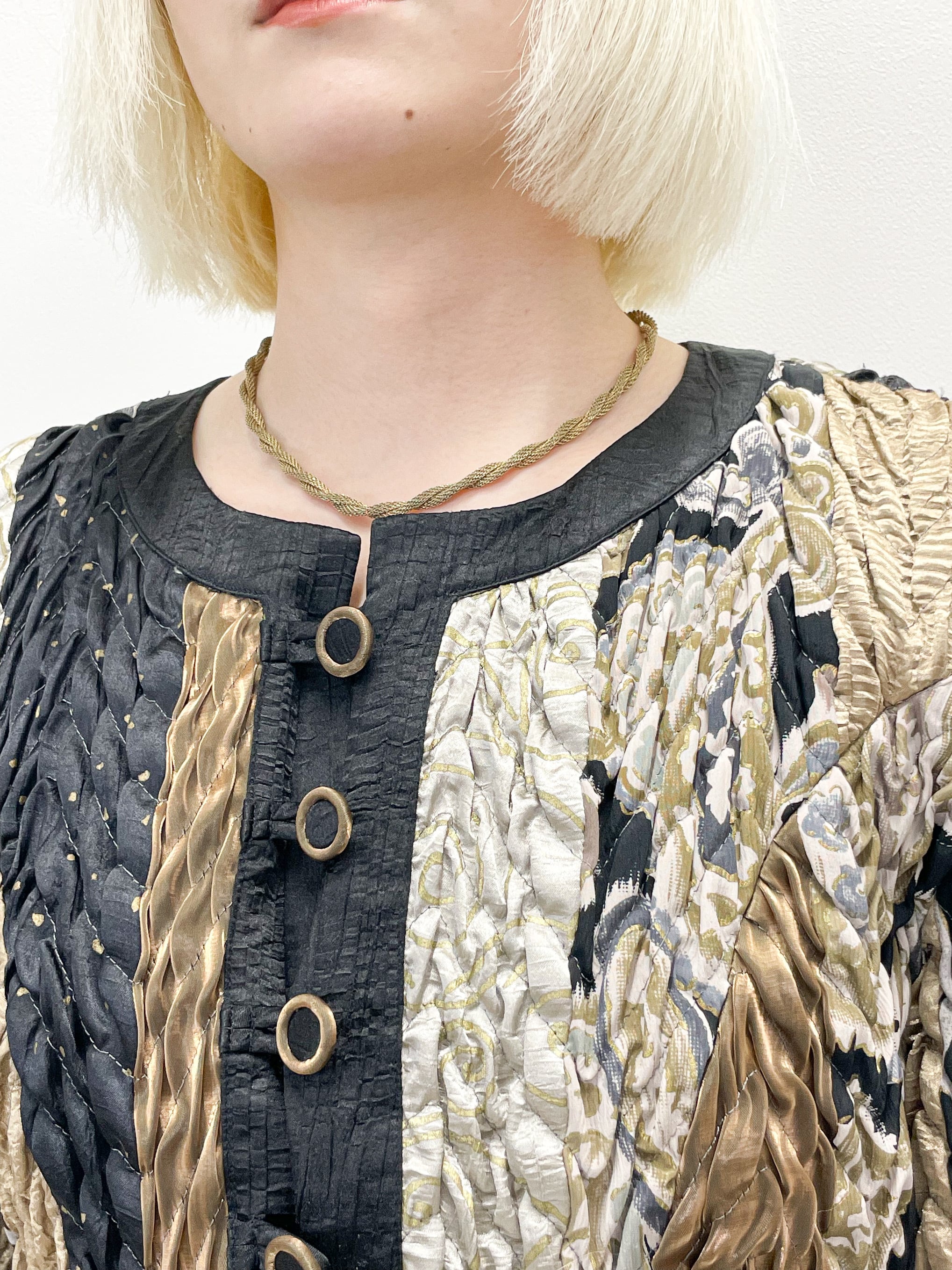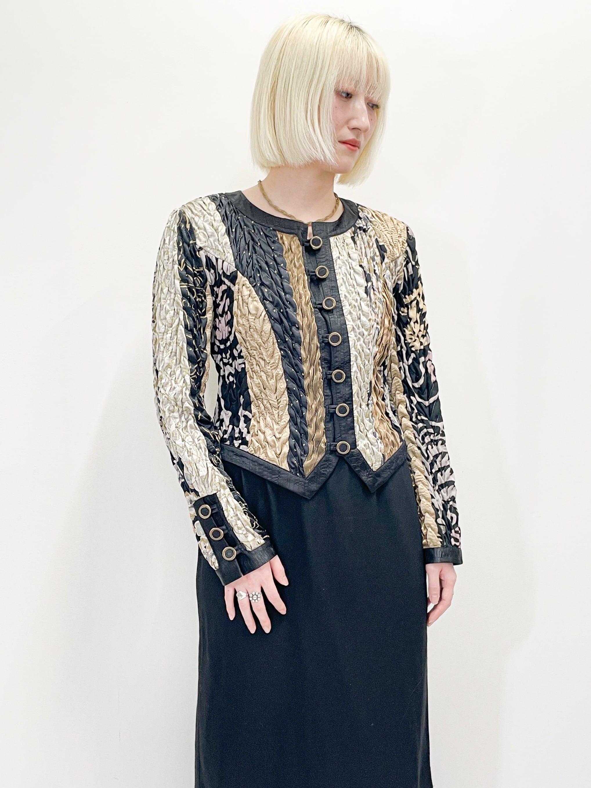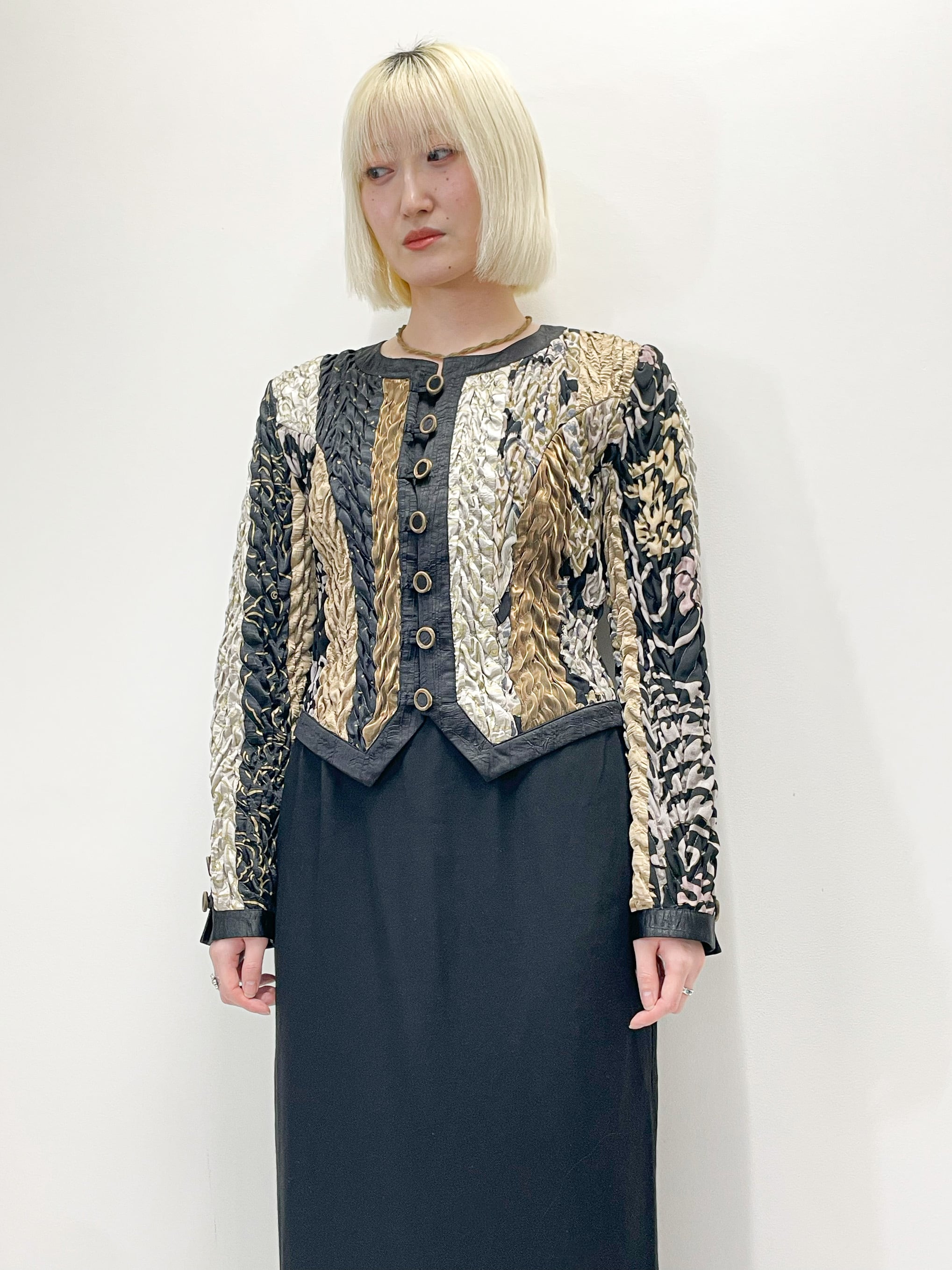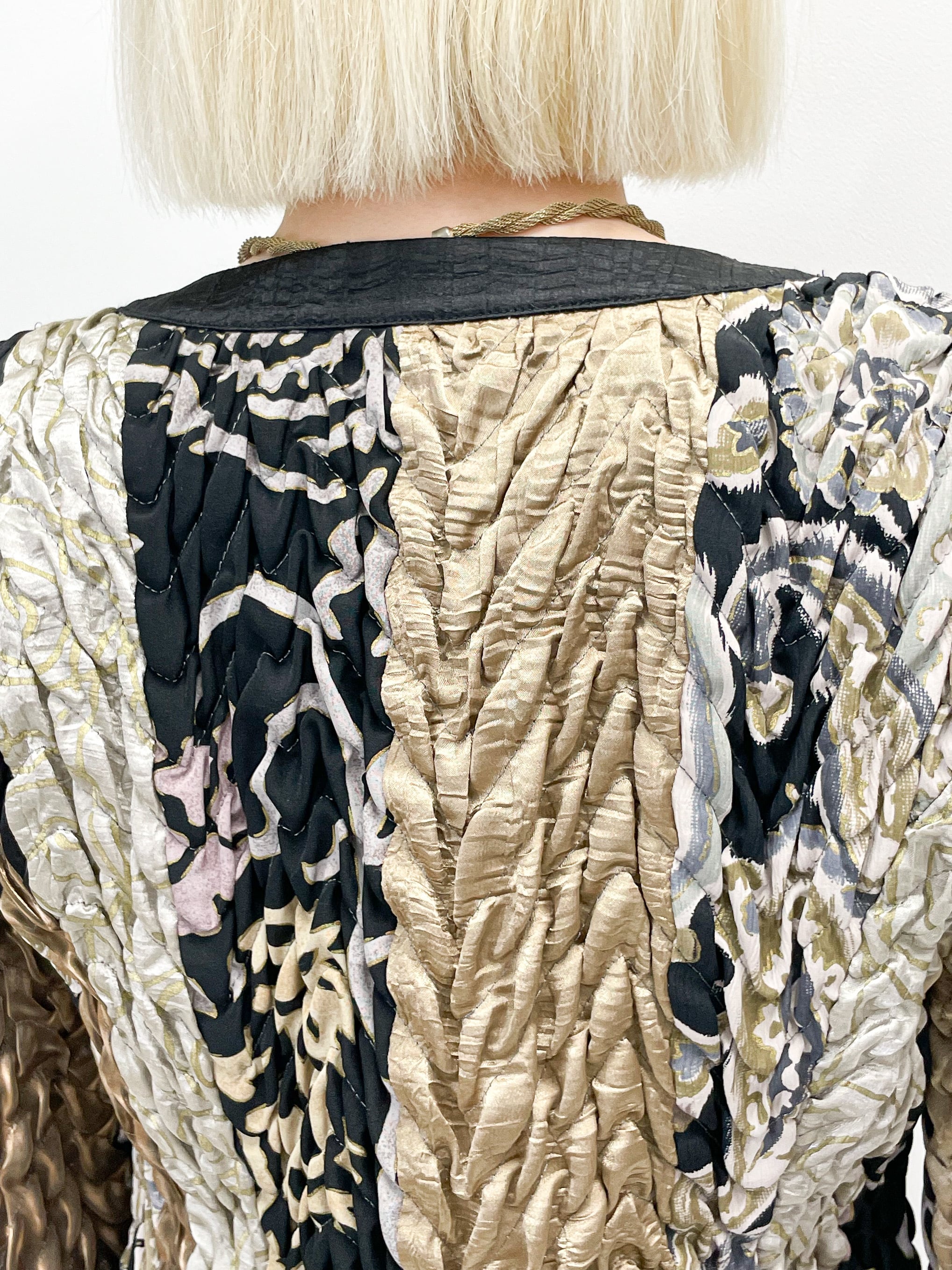 シャイニーなゴールドや、ブラックなどの生地の切り替えが入ったデザインや、全体に施されたシワを寄せたような立体的な加工が唯一無二の存在感を演出してくれます。