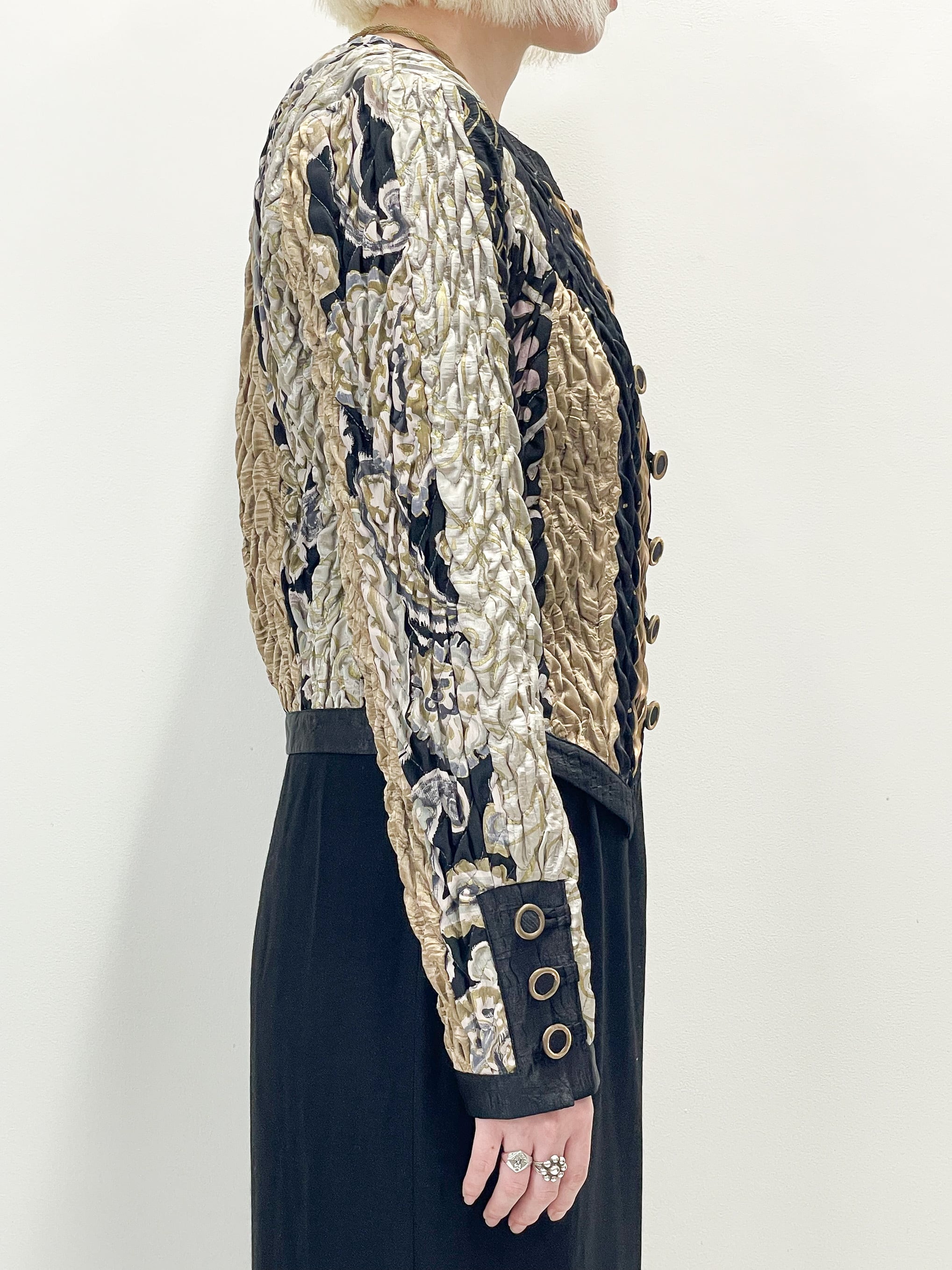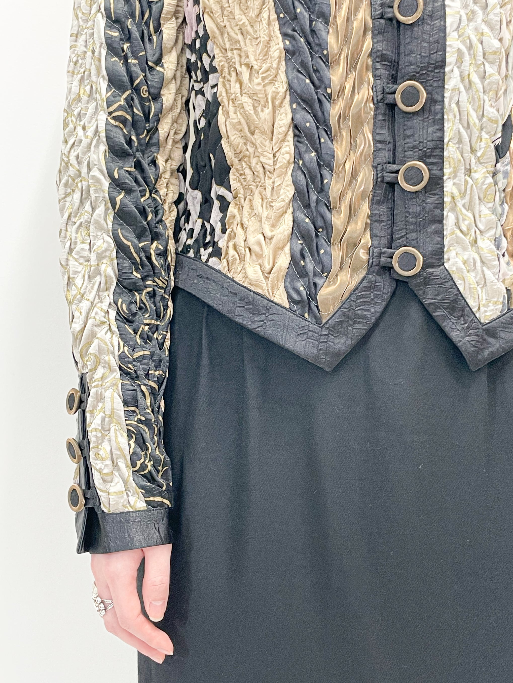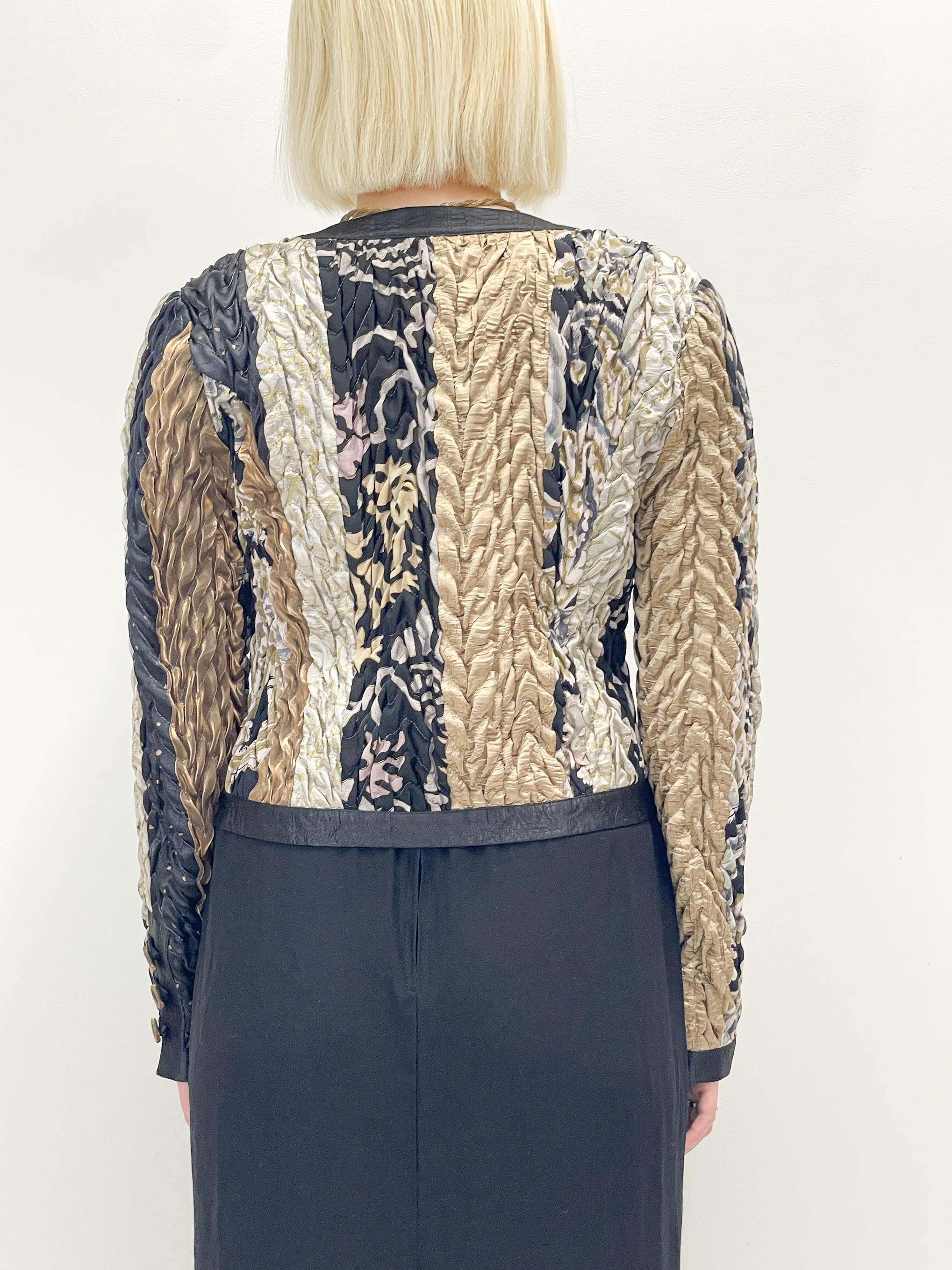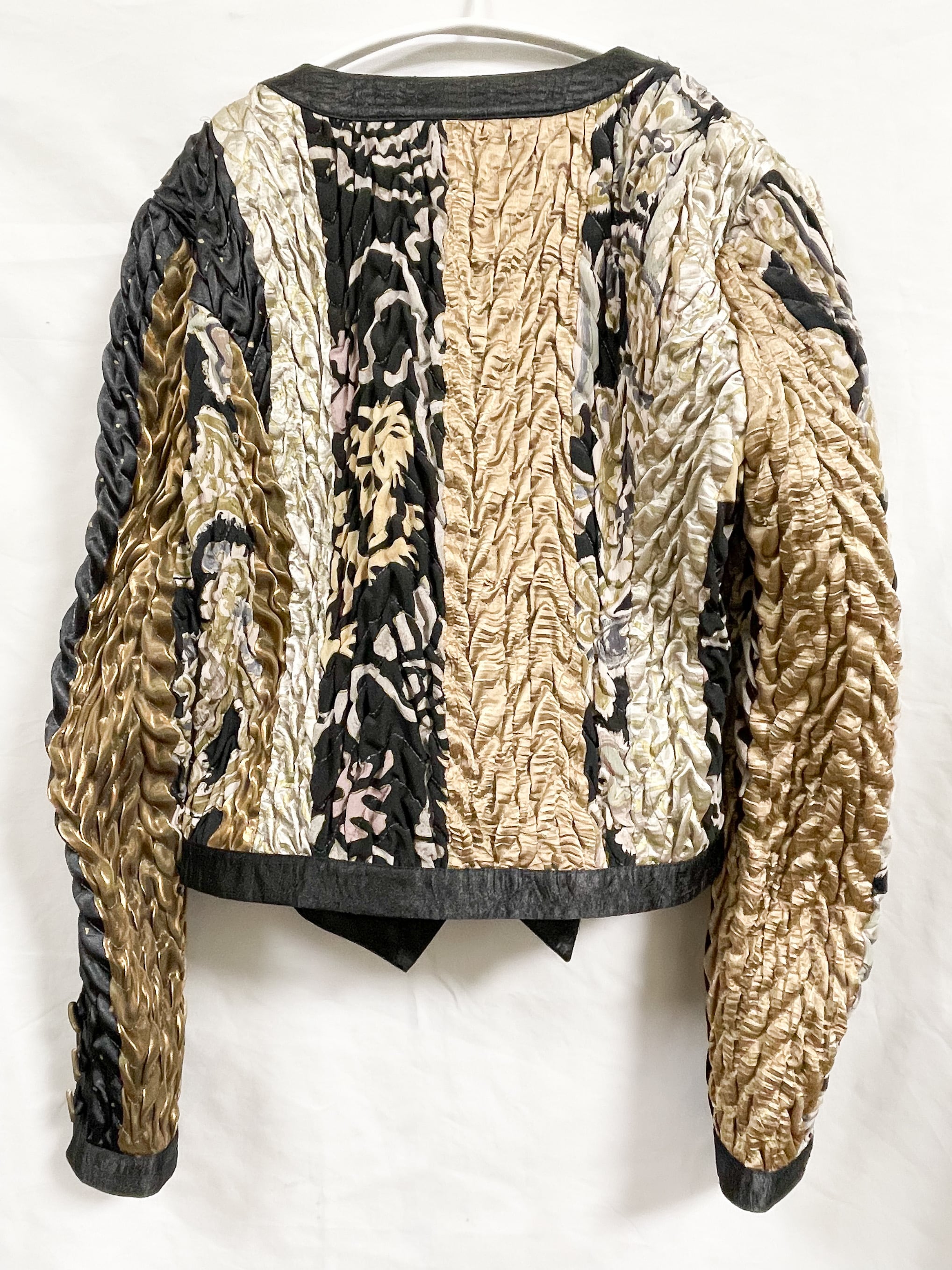 シャイニーなゴールドや、ブラックなどの生地の切り替えが入ったデザインや、全体に施されたシワを寄せたような立体的な加工が唯一無二の存在感を演出してくれます。