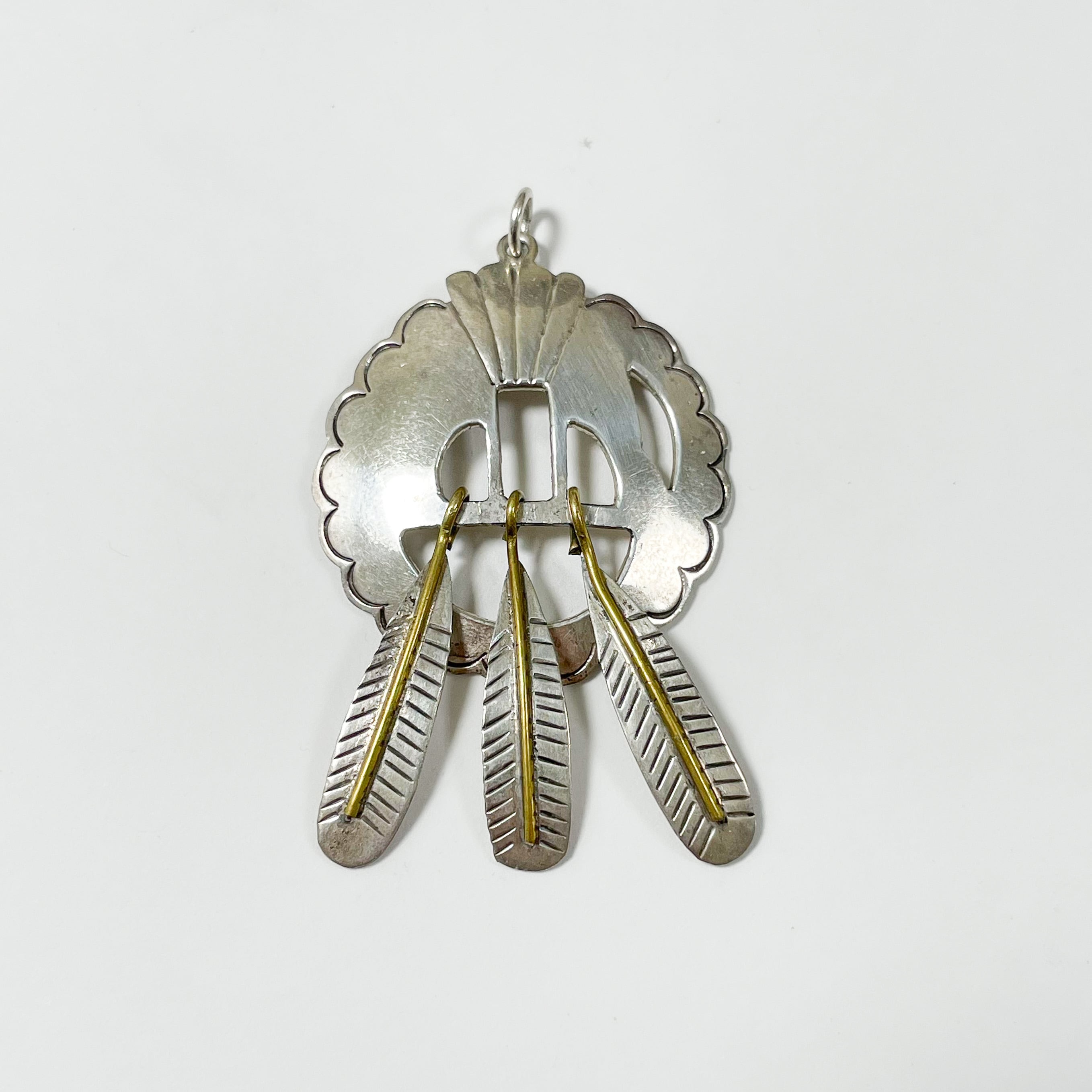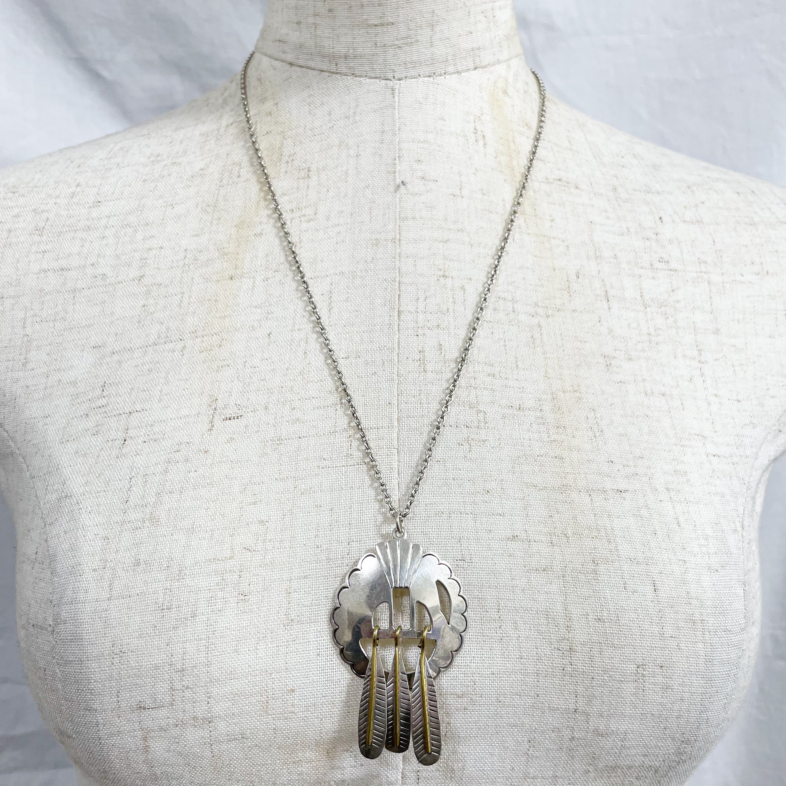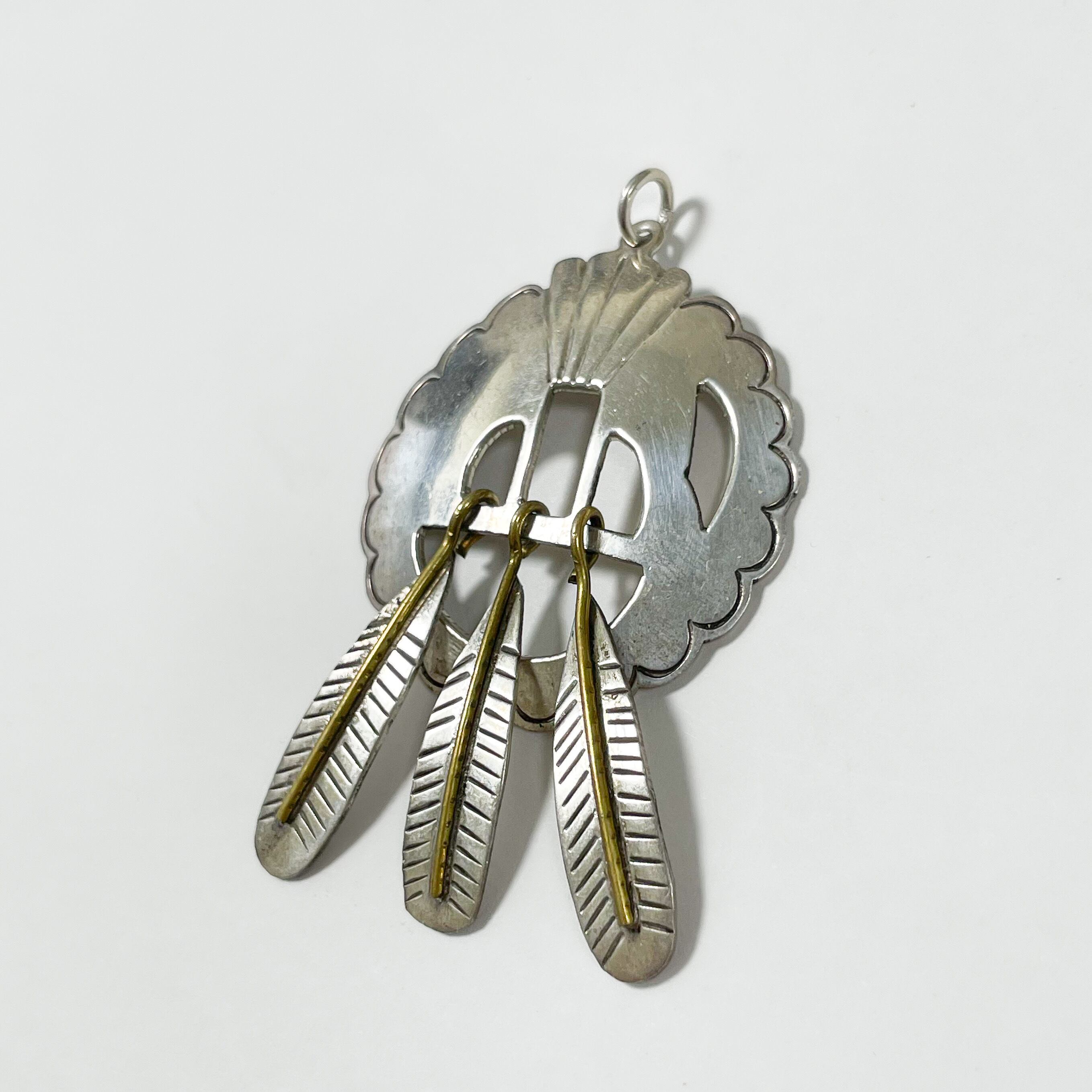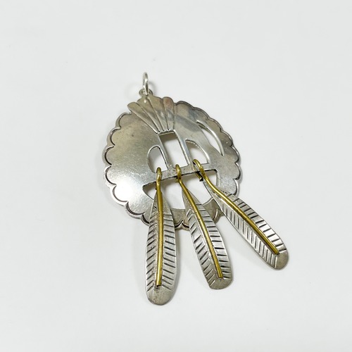 円形のベースにぶら下がった3本のフェザーの芯の部分は金色の真鍮になっており、銀色とのコントラストがとても美しいです。