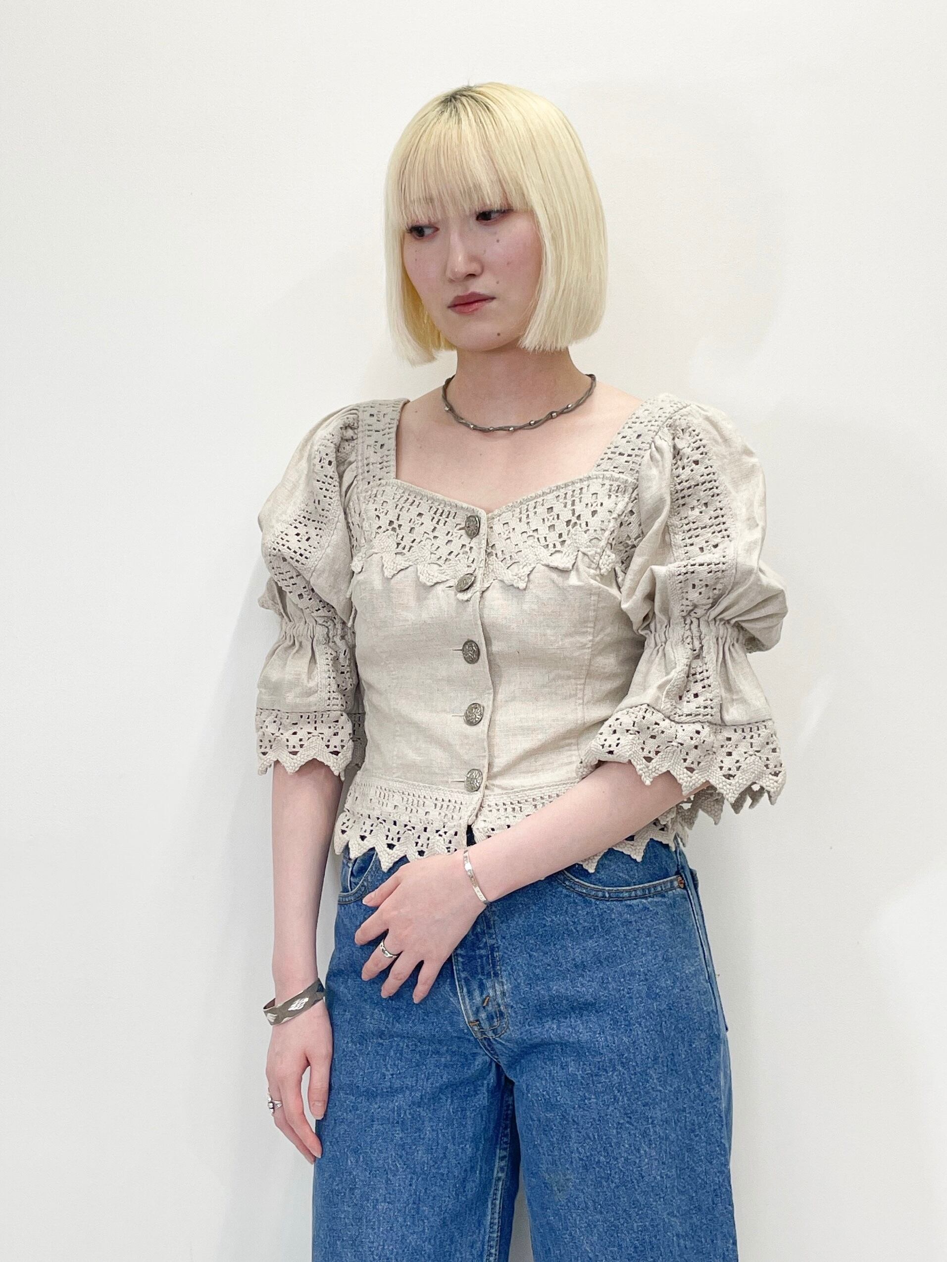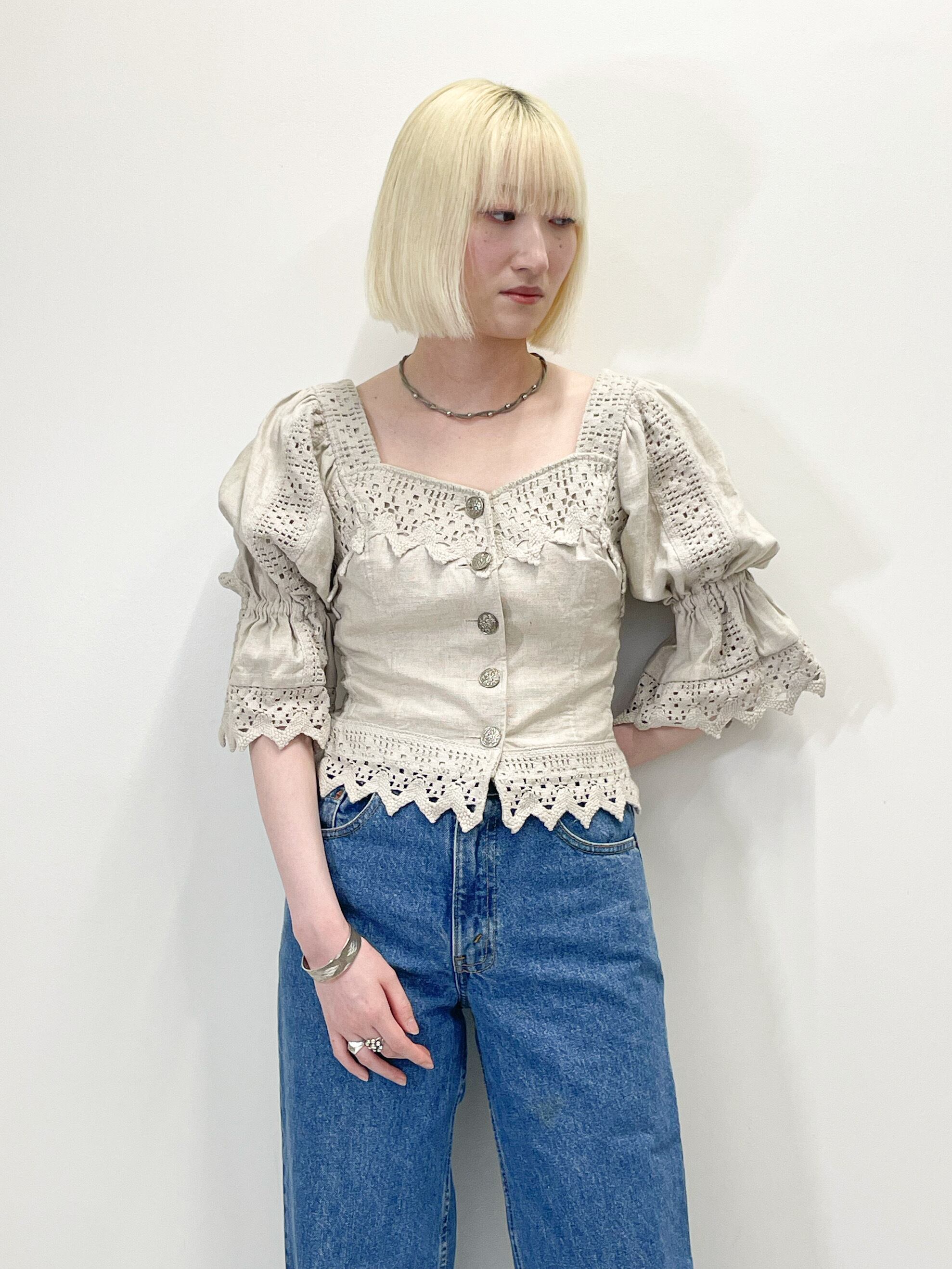 エーデルワイスのメタルボタンやクロシェレースといった甘めなディテールが凝縮されているので、ワイドなデニムやメンズライクなパンツを合わせてラフに着用するのがオススメです。ちなみに元々付いていたランドハウスのタグは状態が良くなかったので外してしまいました