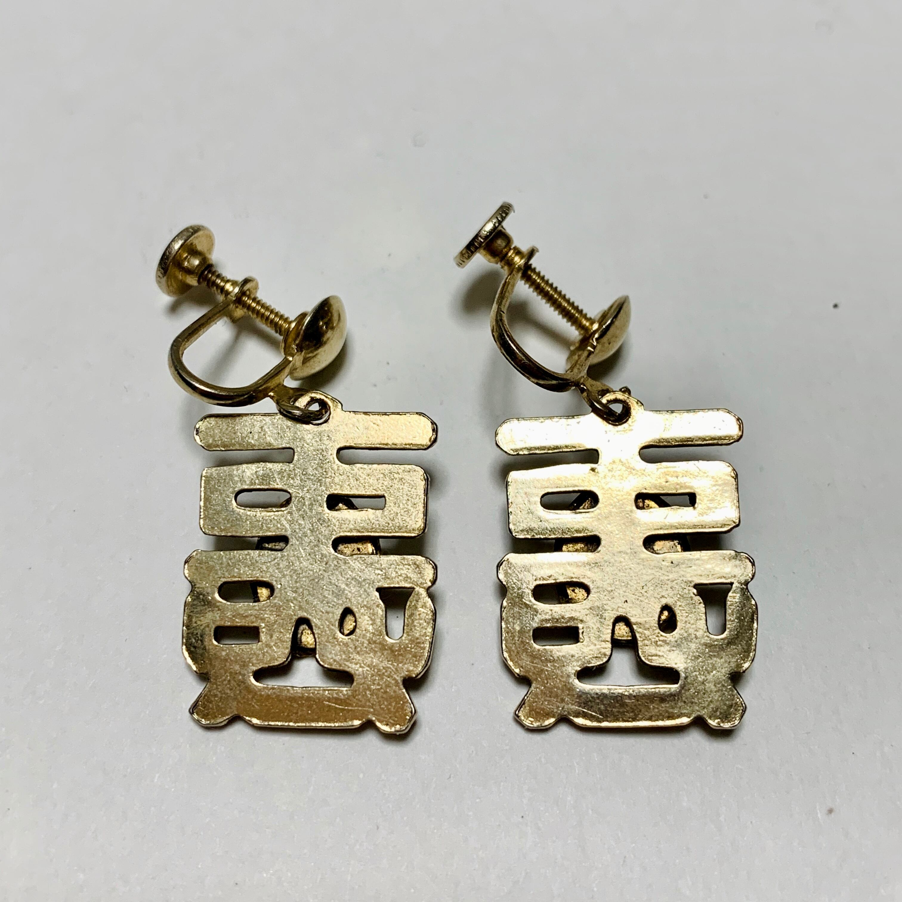 漢字の様な古金色のメタル性ベースに仏像がインタリオで入ったガラス製カボションがセットされたオリエンタルなイヤリングです。