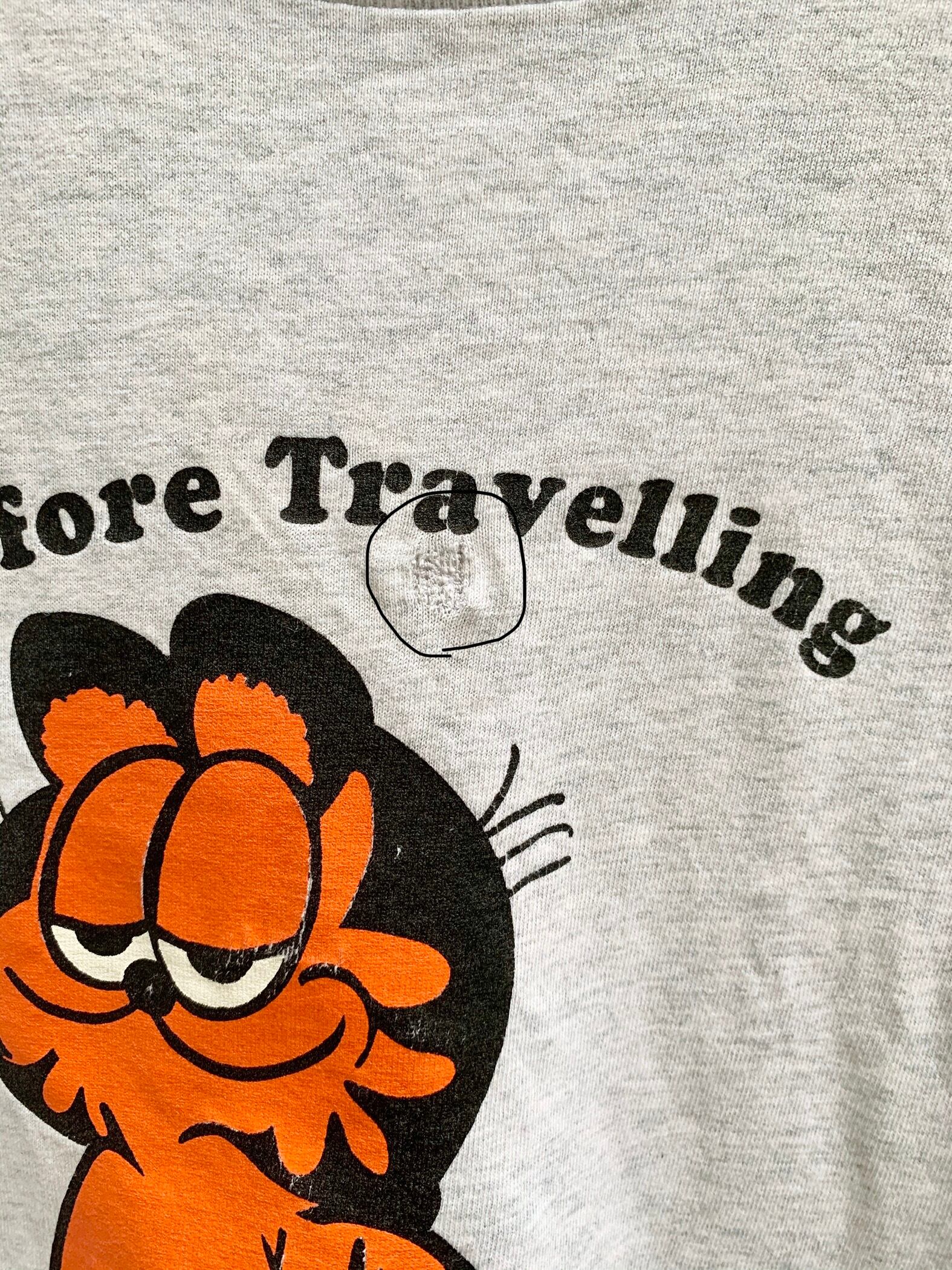 フロントにガーフィールドのプリントが、そしてバックにはアラスカハイウェイを300マイル移動した後だと思われる、疲れ切って萎んで酷い有様のガーフィールドのプリントが入ってます。