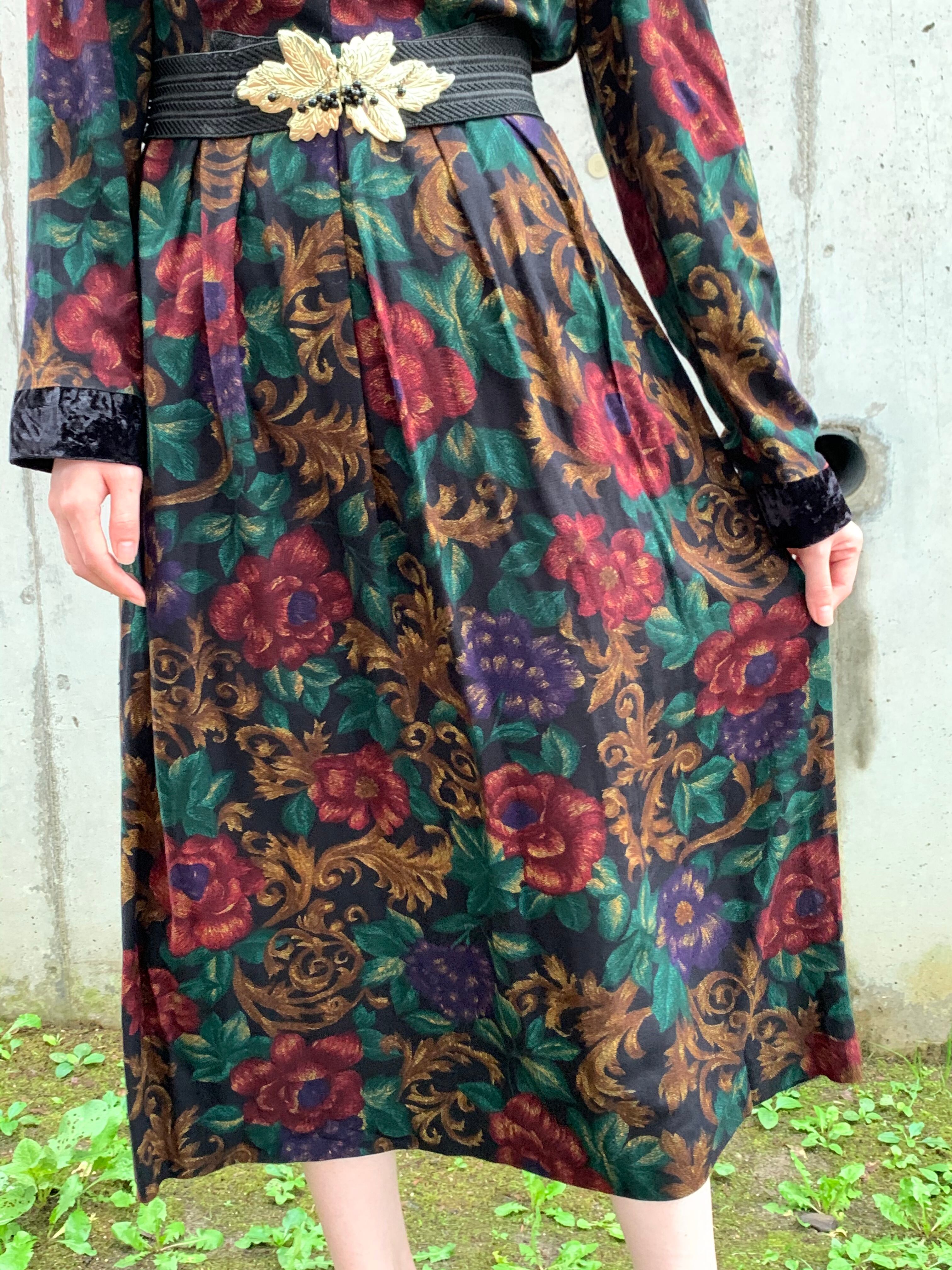 ベルベット切り替えのヴィンテージ 花柄レーヨンワンピースです。
